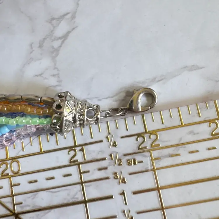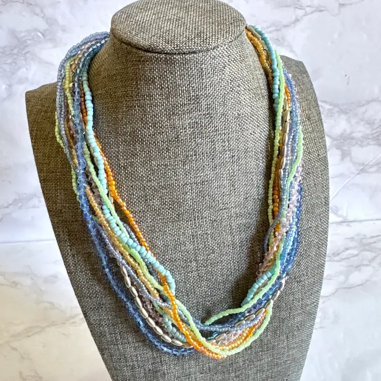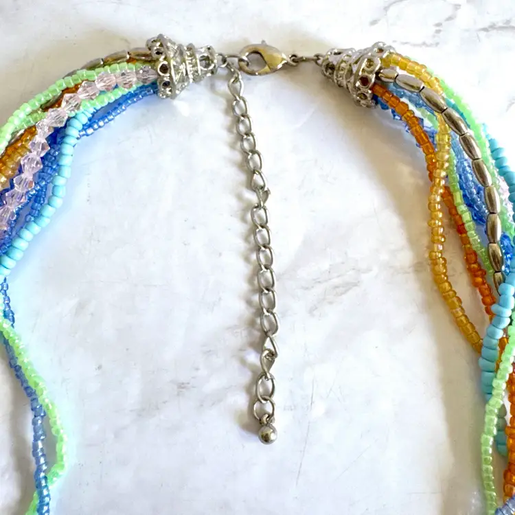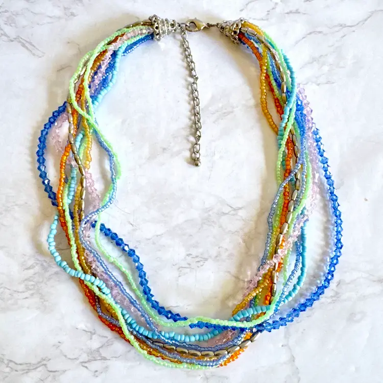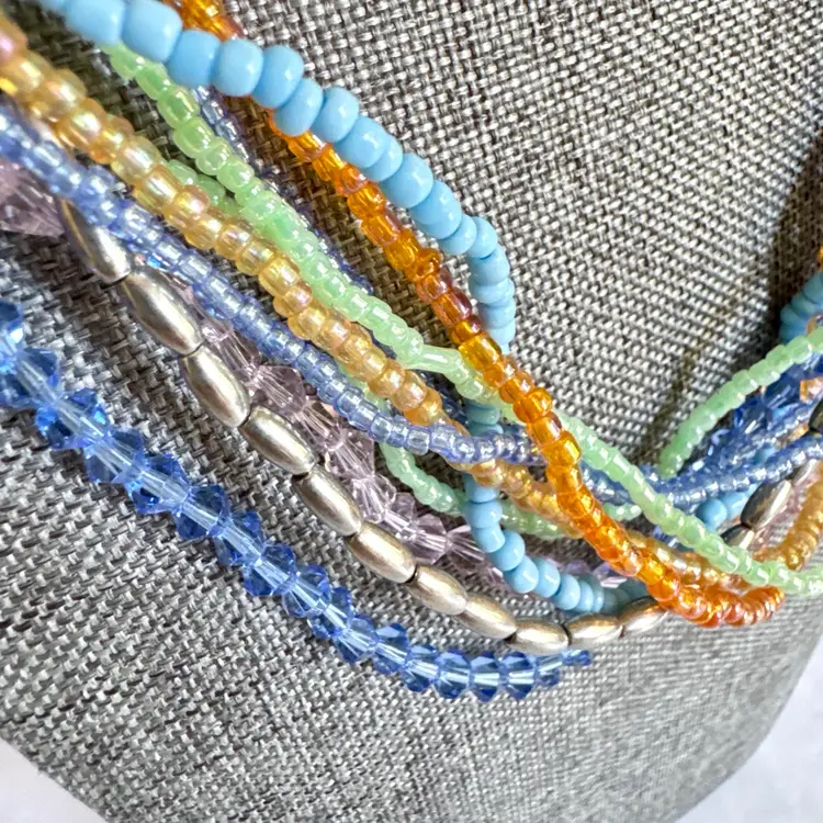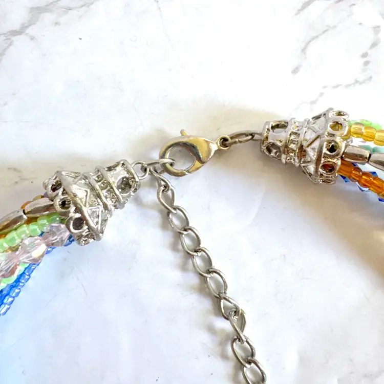 This adjustable necklace, extending up to 22” long, features vibrant multi-colored seed beads, reflecting Nepalese and Japanese artisan influences with a boho-ethnic flair.