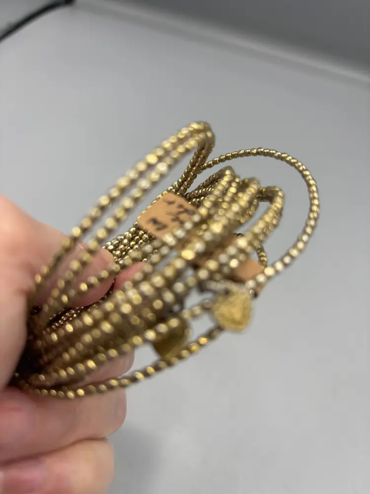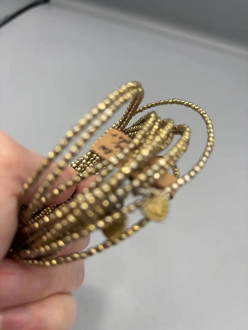 Multi gold tone bracelets that make the most amazing sound when they clang together. These show minor wear.