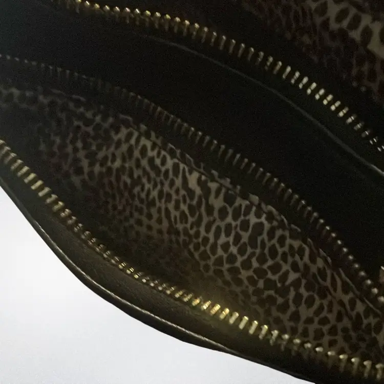 3 exterior zippers and the sweetest cheetah silky interior. Good soft leather. No brand
