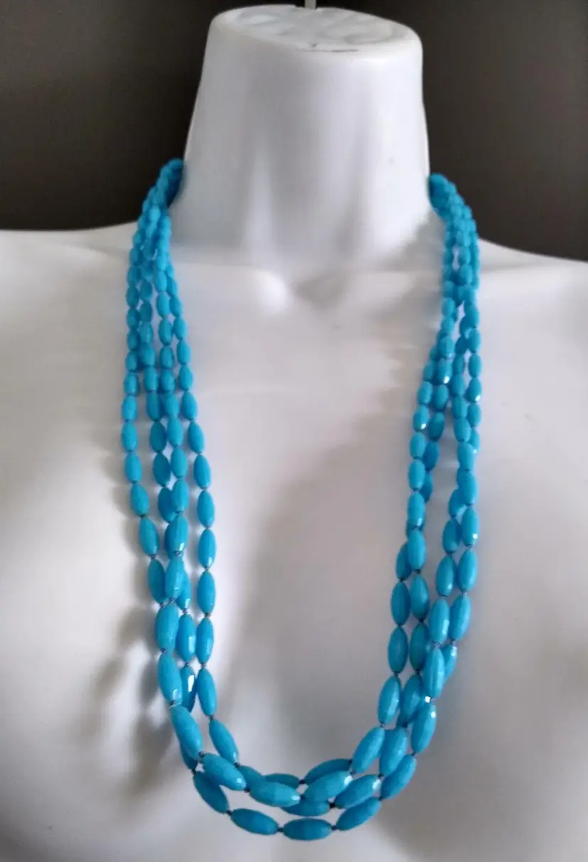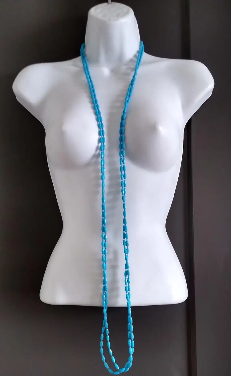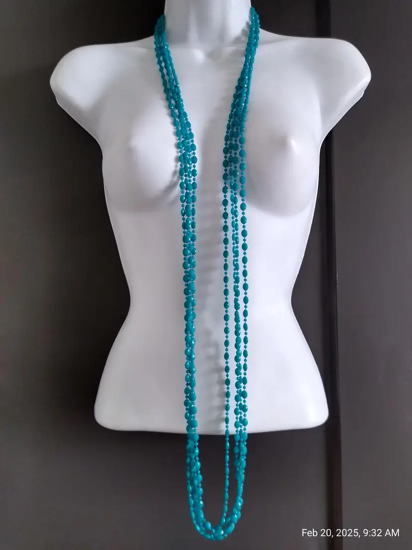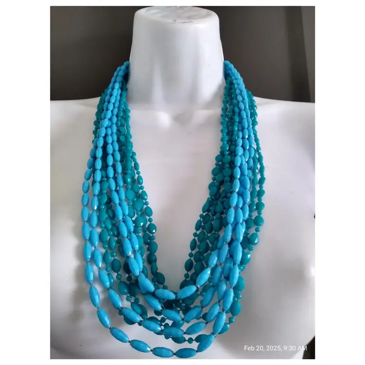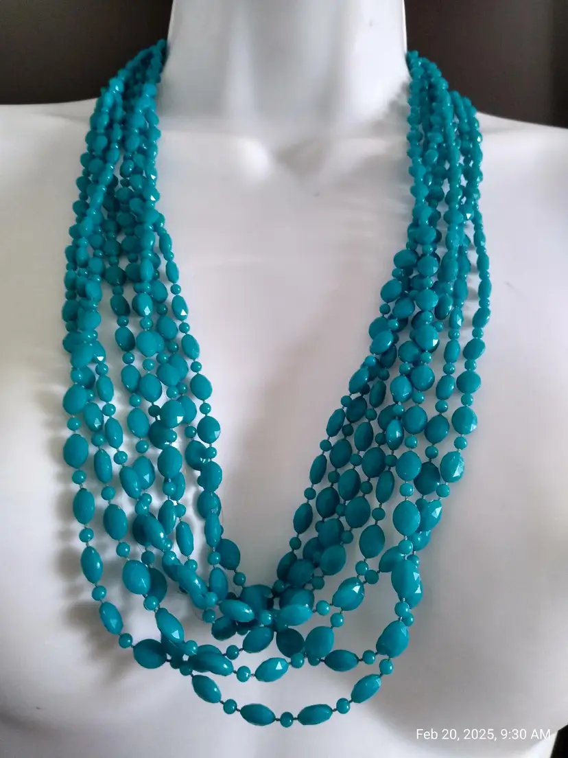 Make a statement with this vibrant & versatile multi-strand long necklace set featuring bold turquoise and pale blue acrylic beads. See photos for details.