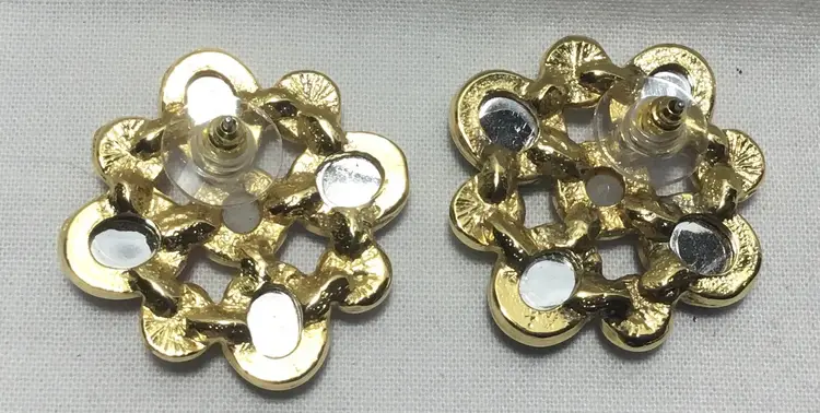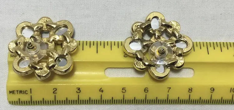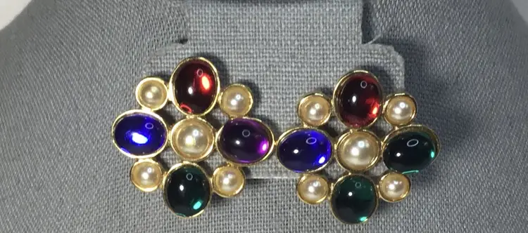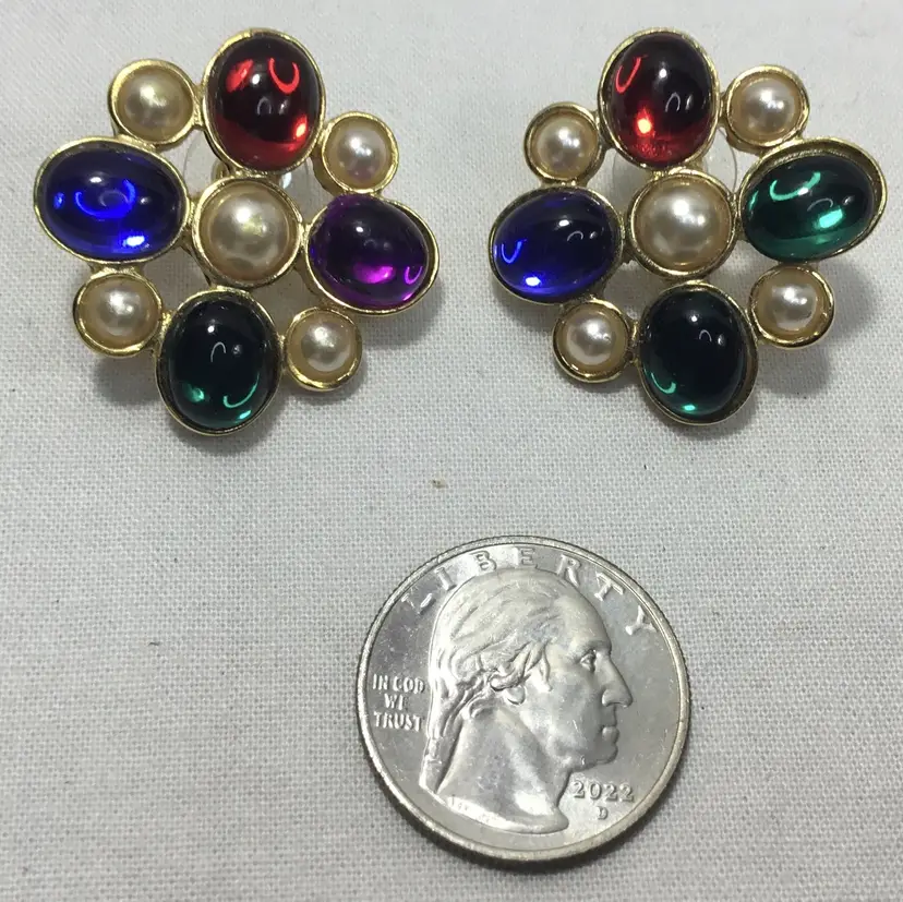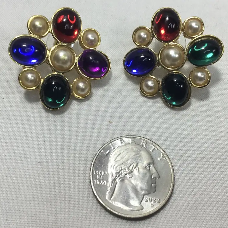 1.25 inches in diameter, 4 different colors of cabochons and 5 faux pearls. Gold tone metal setting, bezel settings, pierced post earrings with backs.