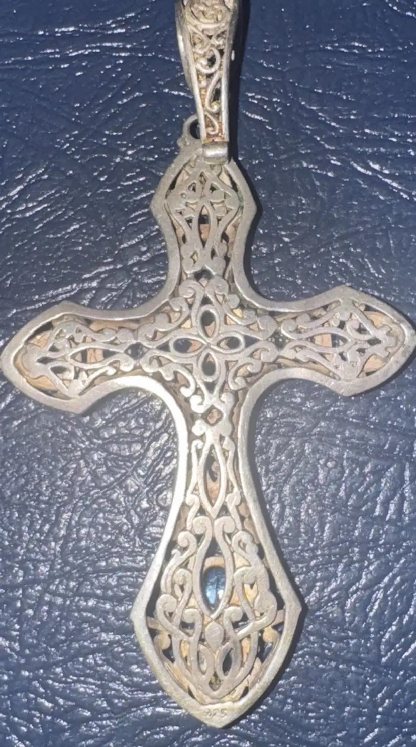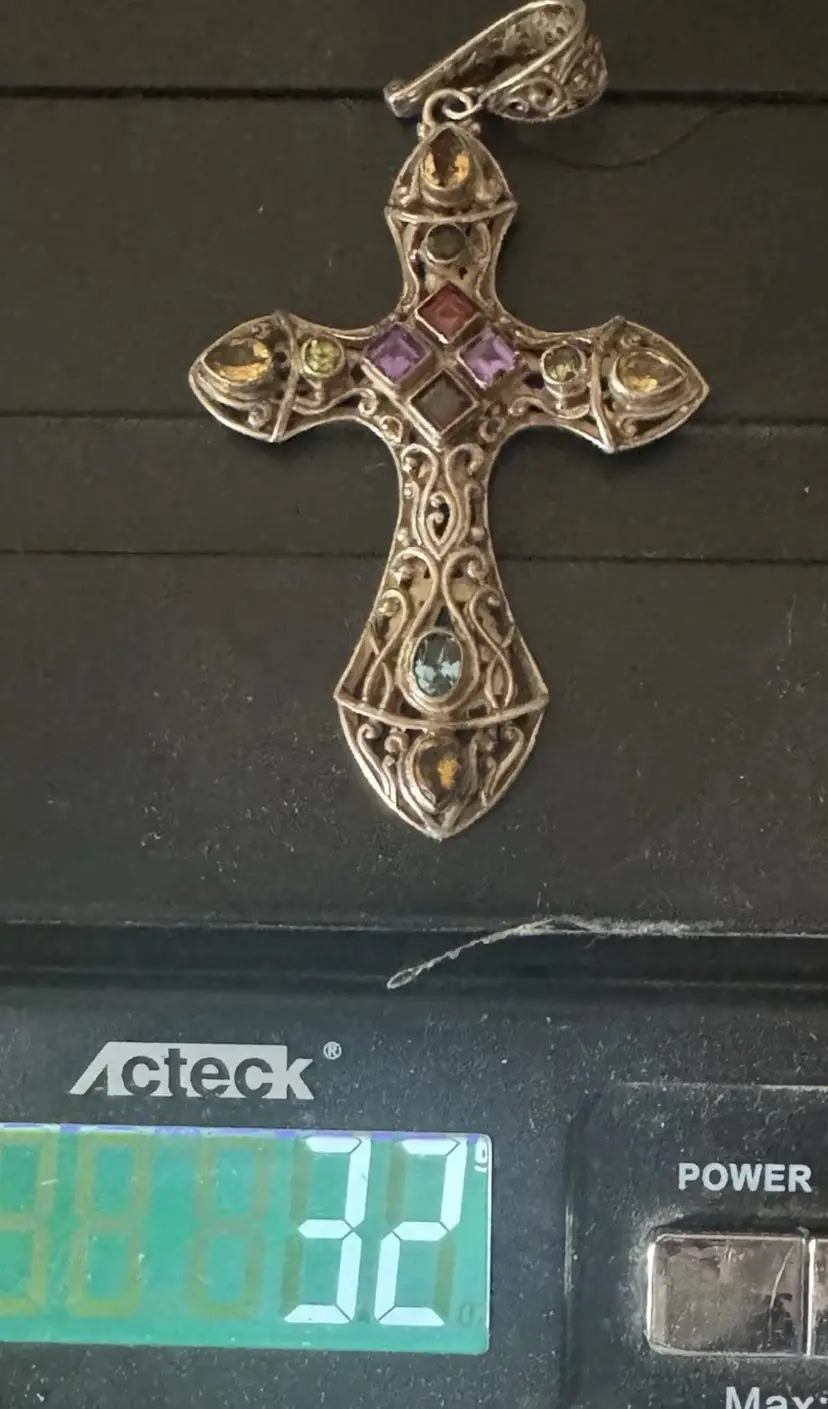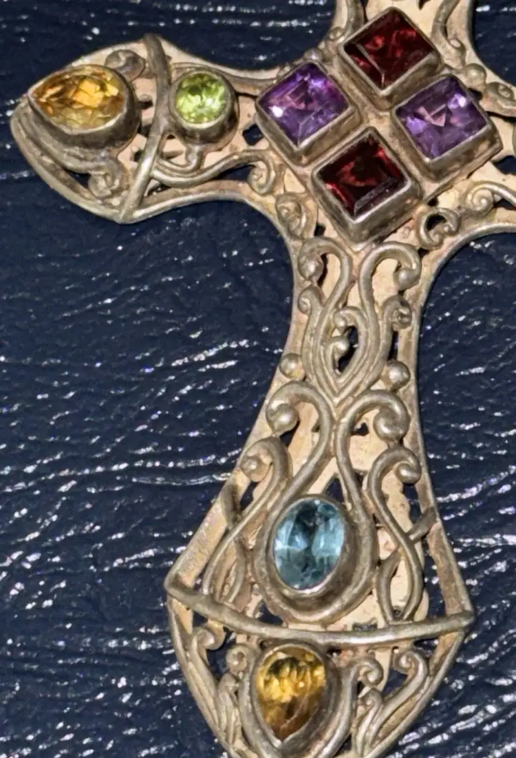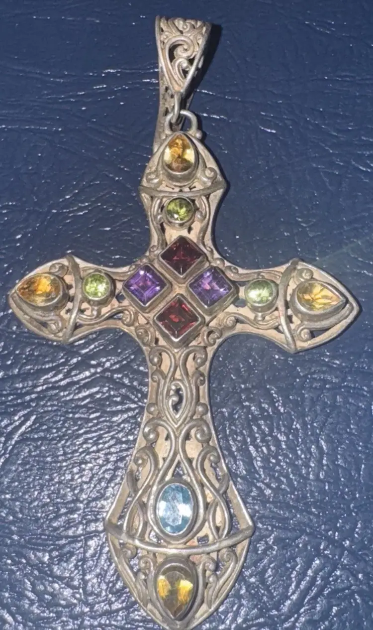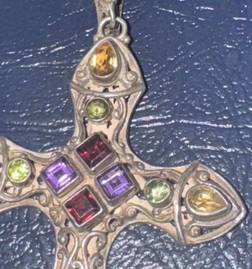 This beautiful sterling silver cross pendant is adorned with 12 multicolor gems in a bezel settings. The back is marked 925 the purity for sterling silver. The cross is 3.5 inches in length and weighs 32 grams. It includes 4 teardrop gems topaz colored, one oval aquamarine colored, three round peridot colored, 2 square amethyst colored, and 2 square garnet colored stones. I’m not sure if these are natural or glass but they are in solid bezel settings, not prongs or flush mounted so I think they may be real or at least better quality.