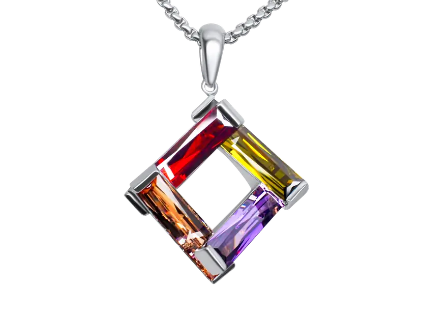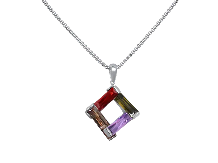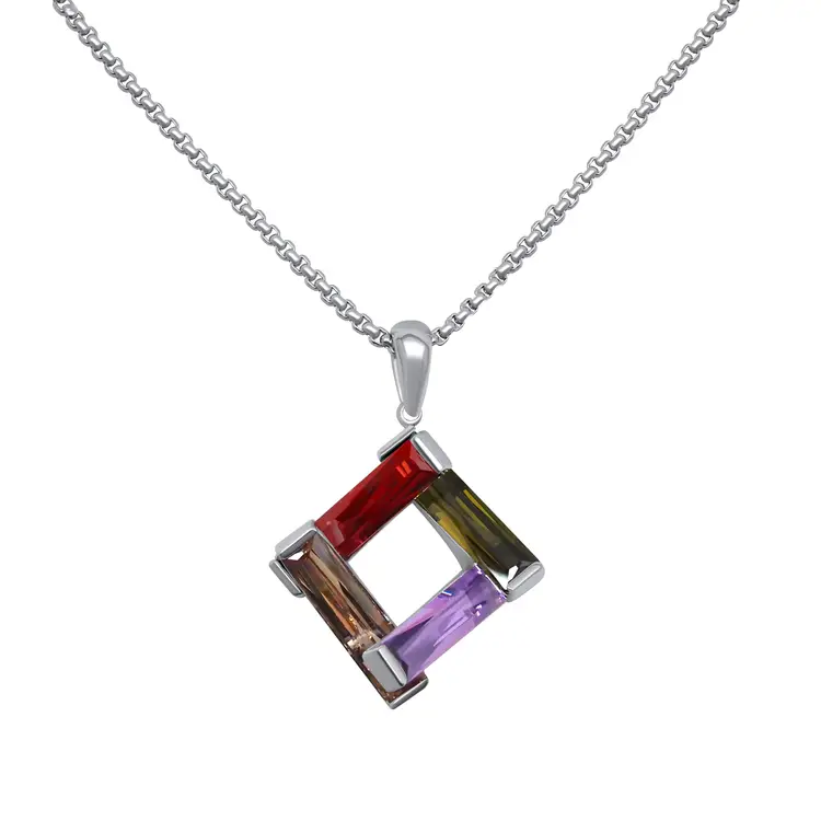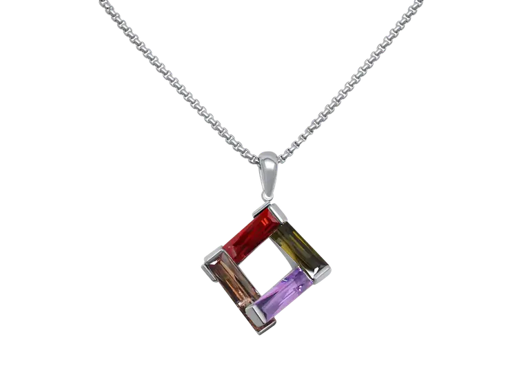 Add a pop of color and style to your look with this modern multicolor geometric pendant necklace. The pendant features a sleek, open-square design set with four baguette-cut crystals in vibrant hues of red, green, purple, and amber, perfectly arranged for an eye-catching sparkle.