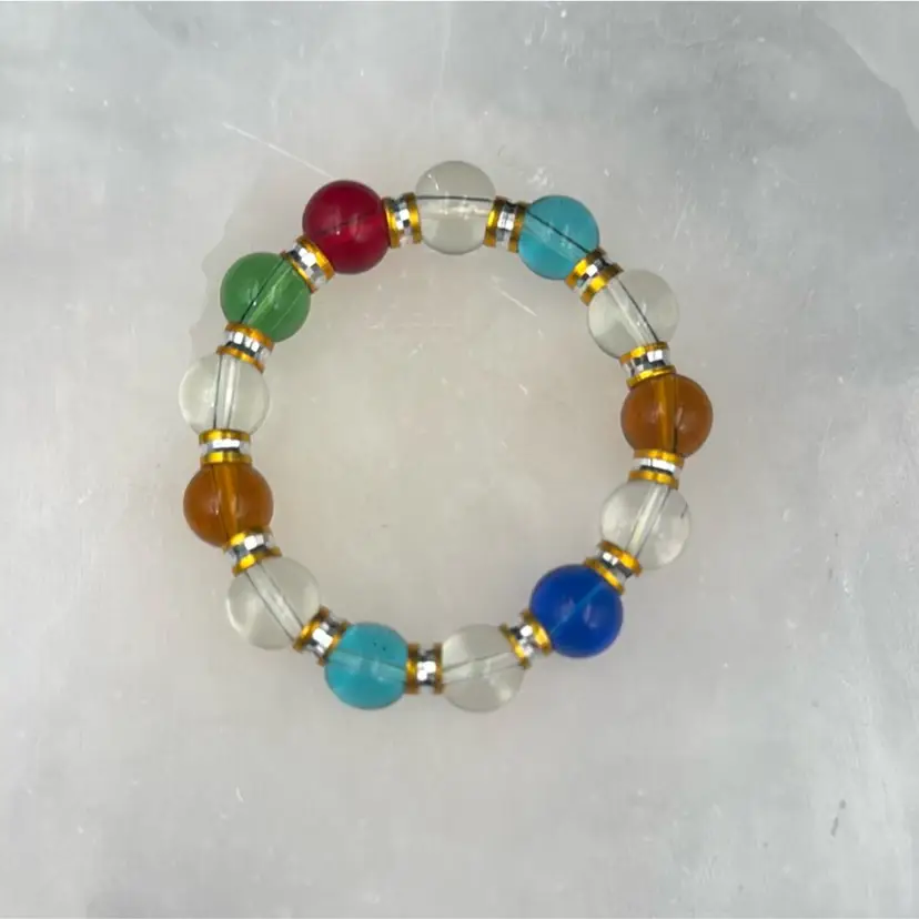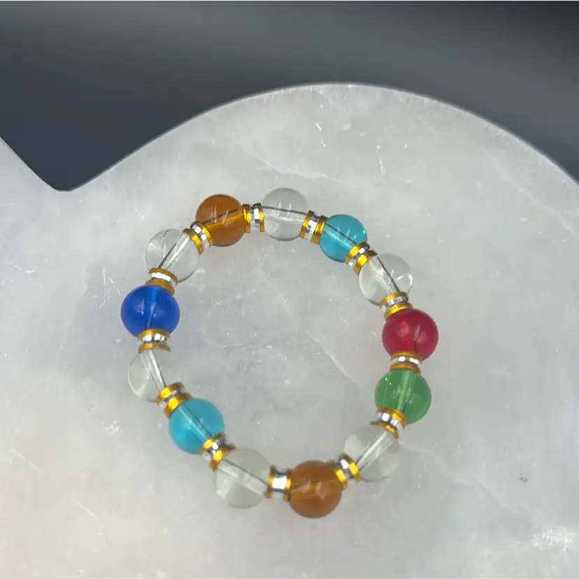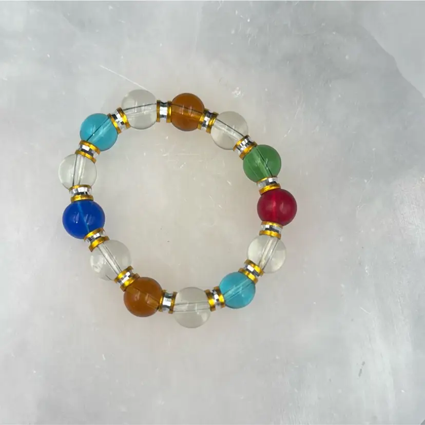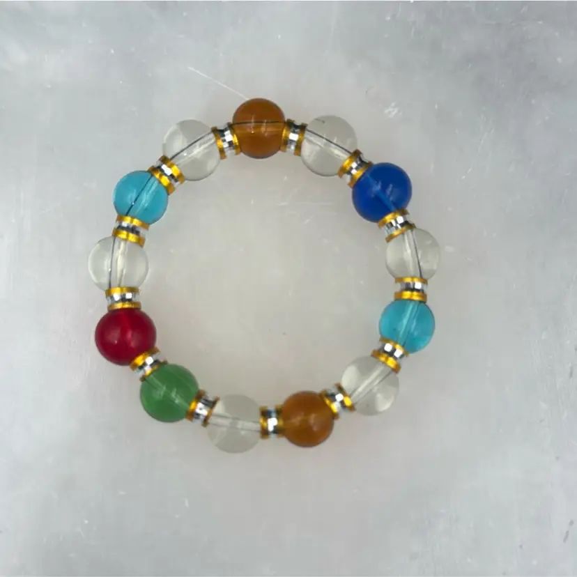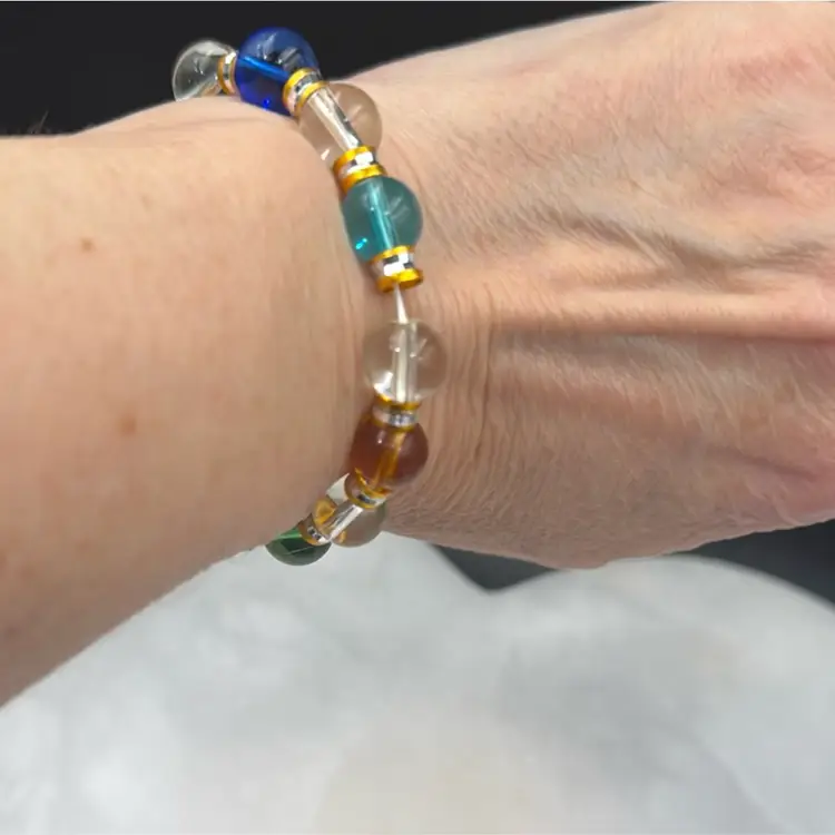 fits 51/2” wrists no chips, cracks or brakes and wonderful and condition. These are glass beads, multicolored with metal in between the show sparkle.