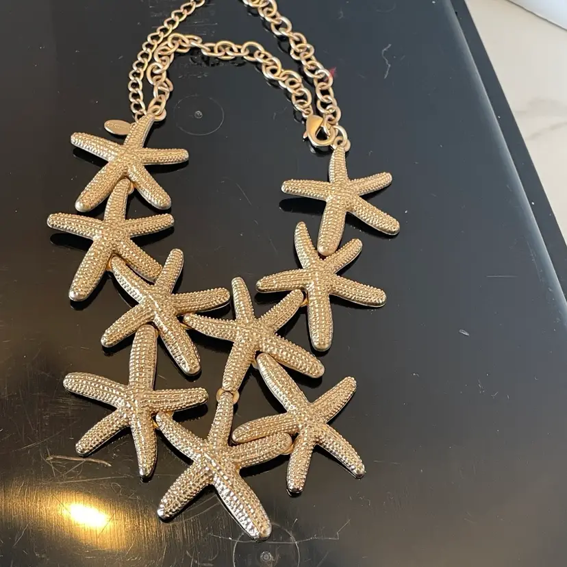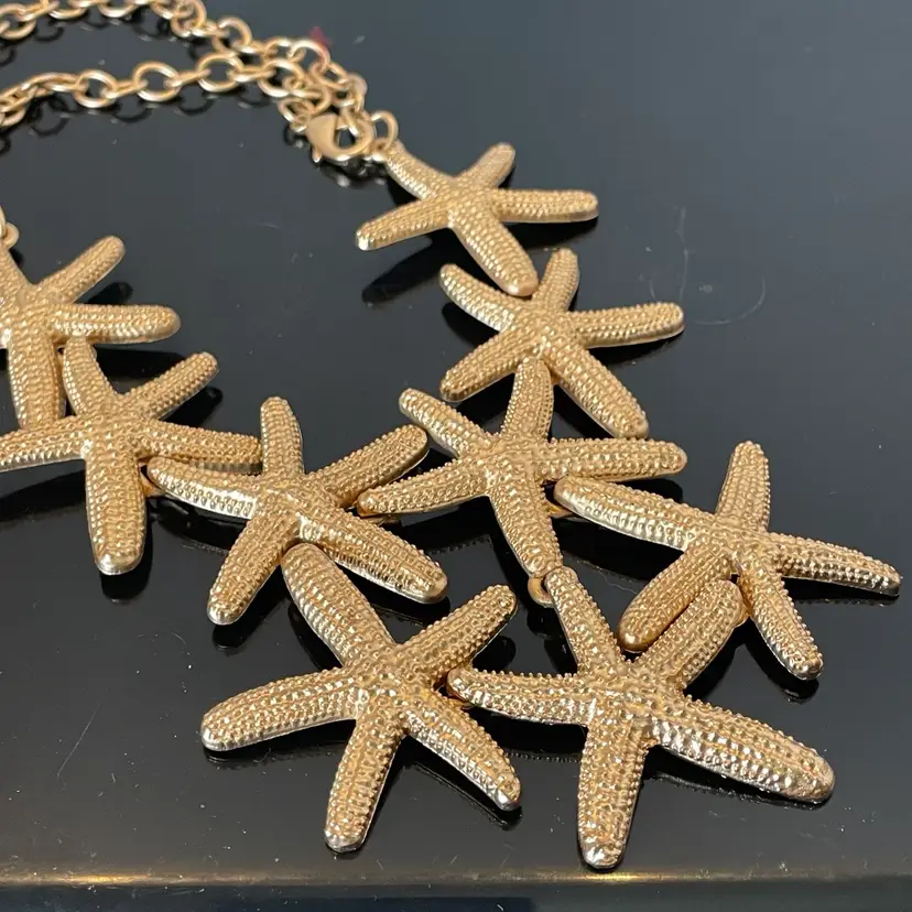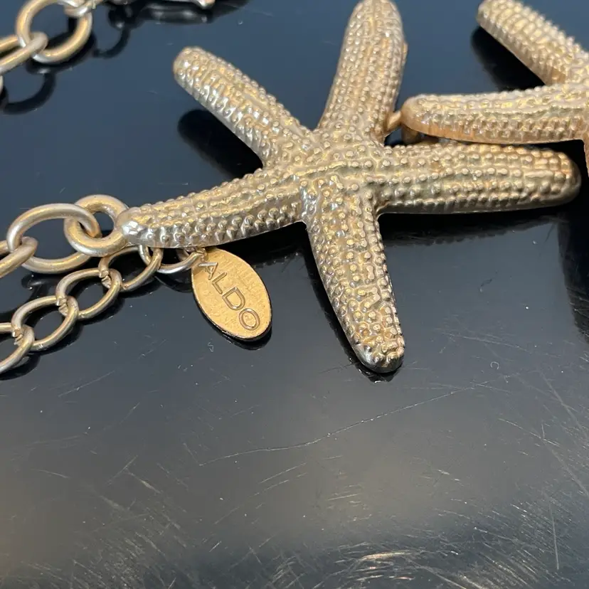 9 starfish make up this choker style gold tone necklace adjustable chain for various length. Made by Aldo. Great for any sea shore lover.