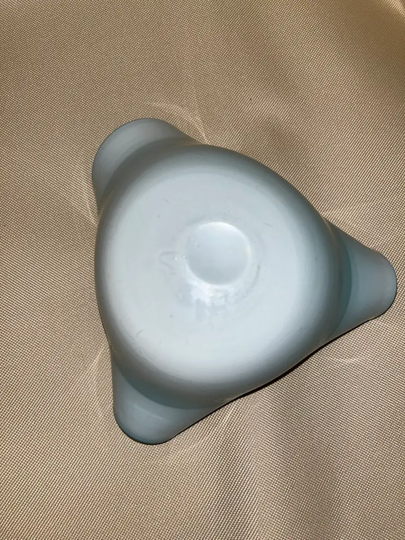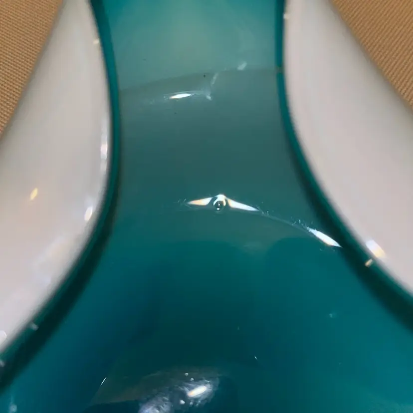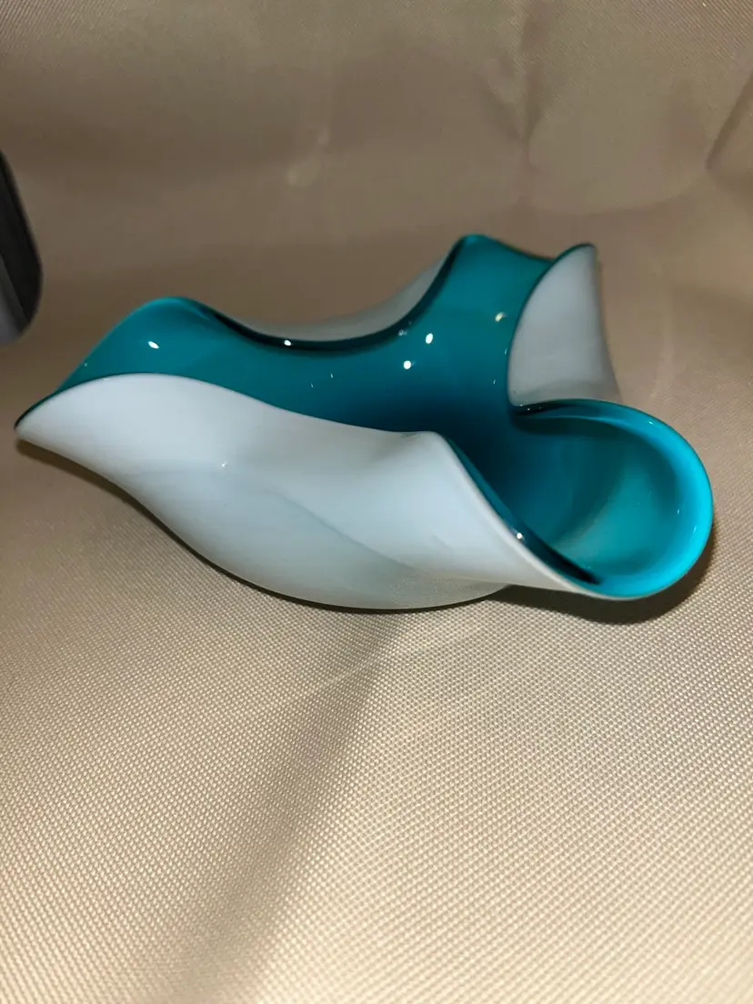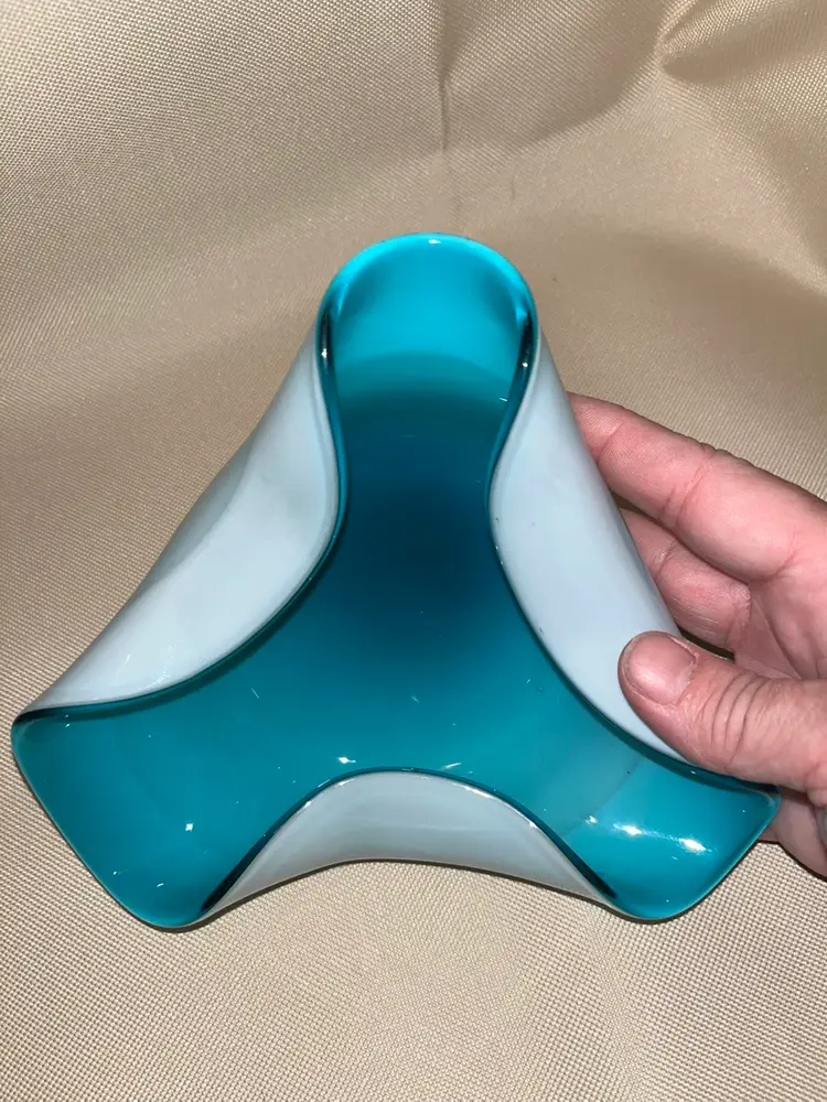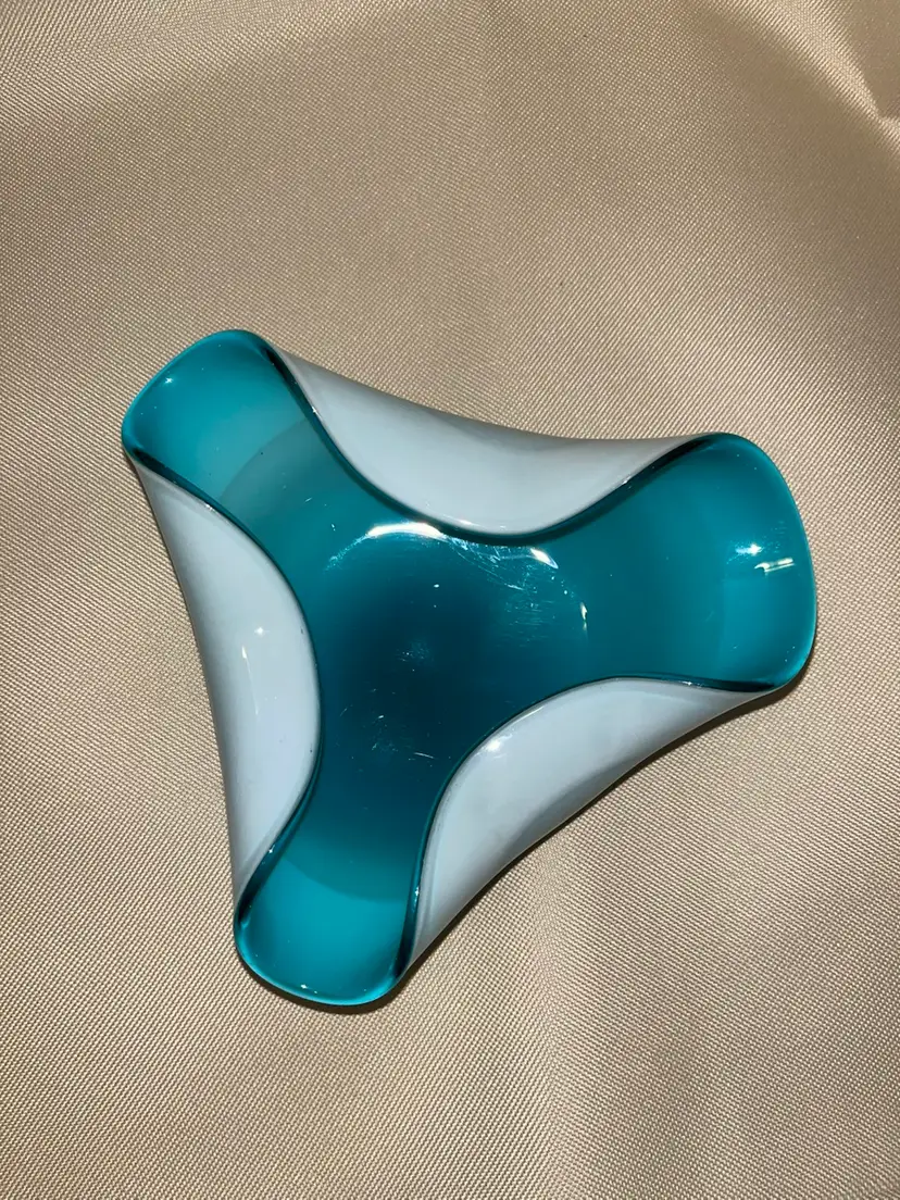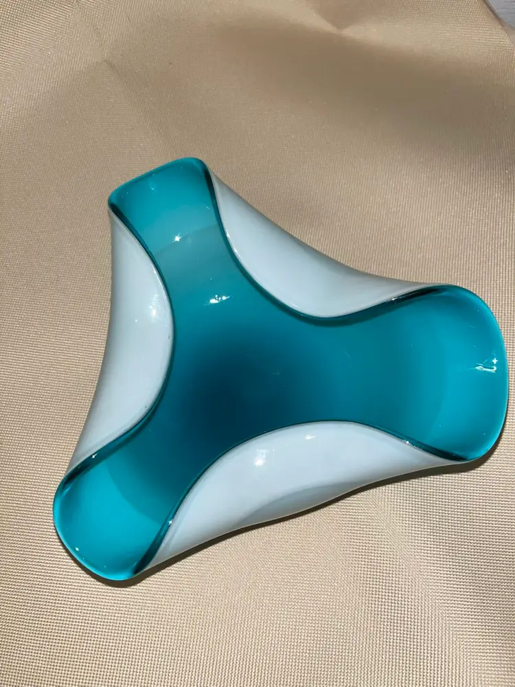 Vintage art glass hand blown Aqua blue Cased glass. Mid Century dish in beautiful condition with no chips or scratches. Does have one small bubble in the glass, please refer to pics. 6 1/2” across.