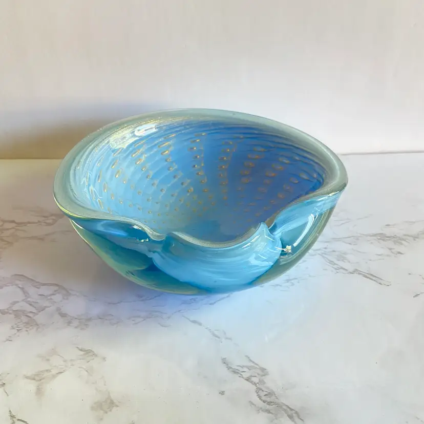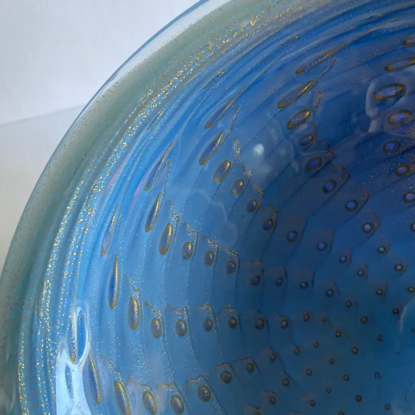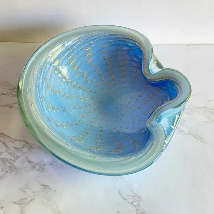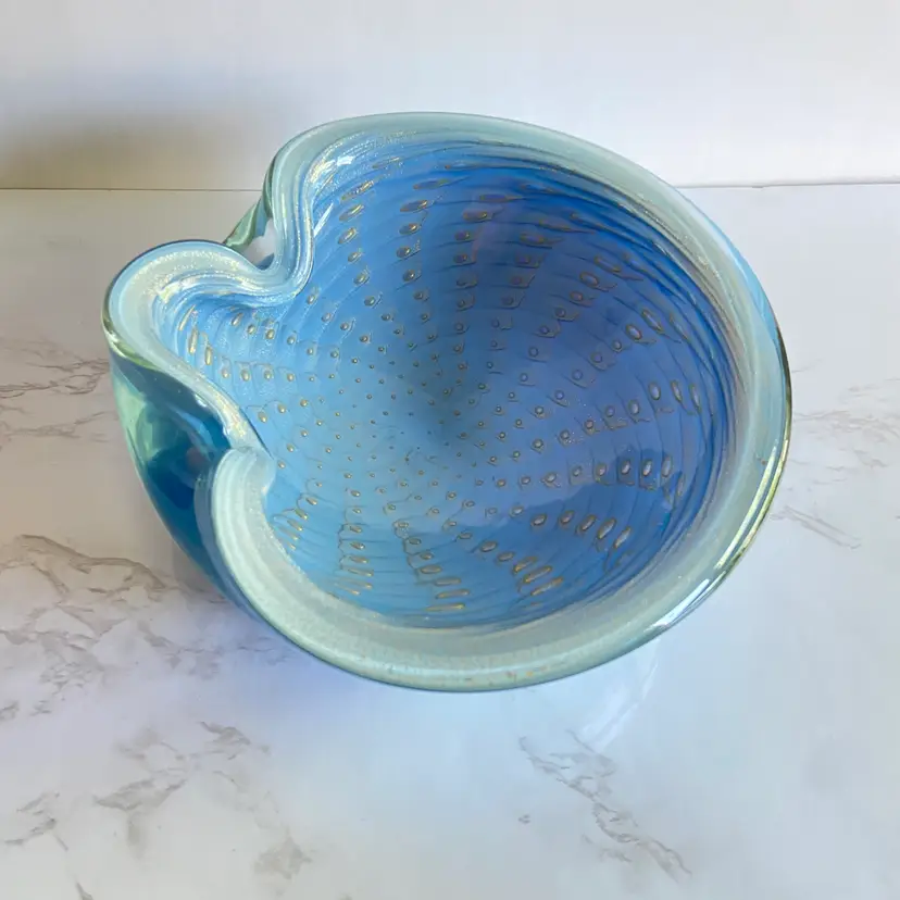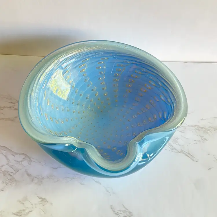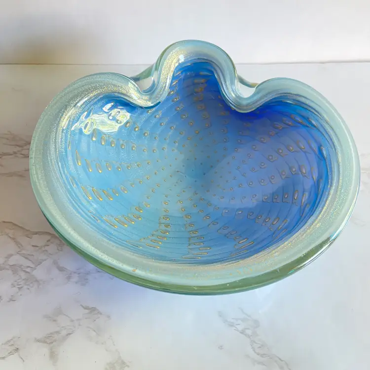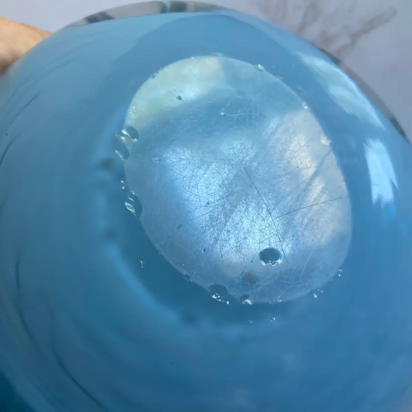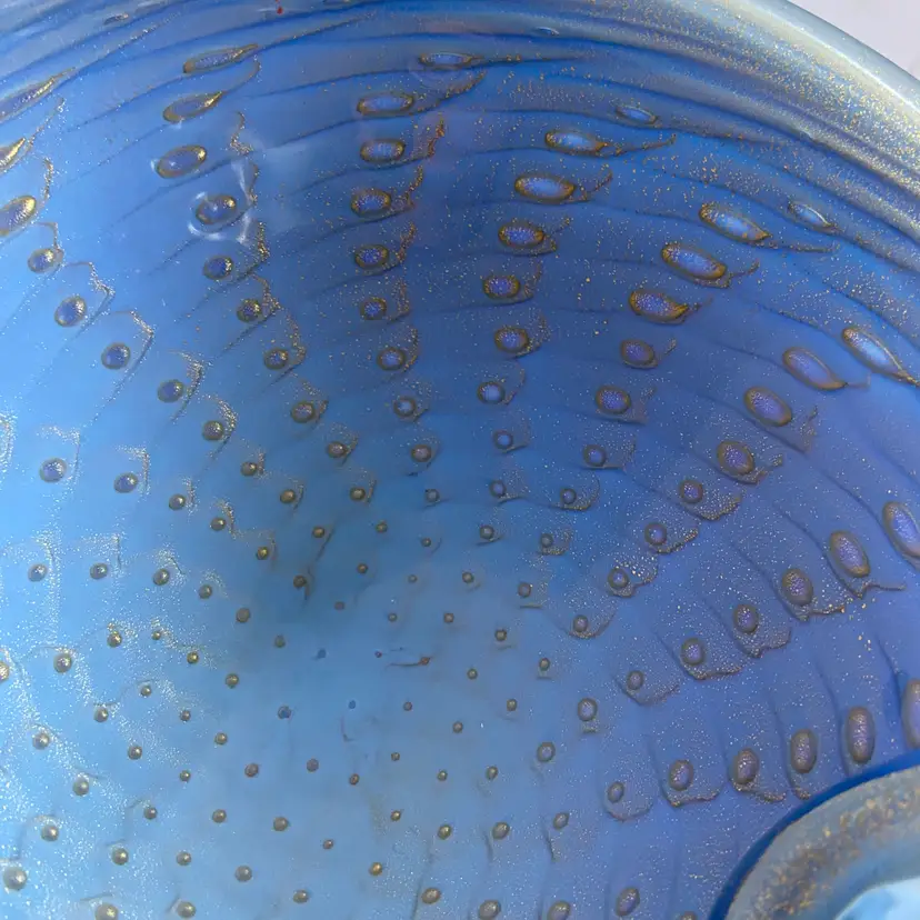 GORGEOUS!! Has chips on the bottom (see photos) but none visible until turned upside down. It is a light blue leaning towards the purple/periwinkle side. The photos appear on the greenish side but that’s an illusion of the blue mixing with the gold flecks. The outer casing glass is clear. Beautiful bullicante.