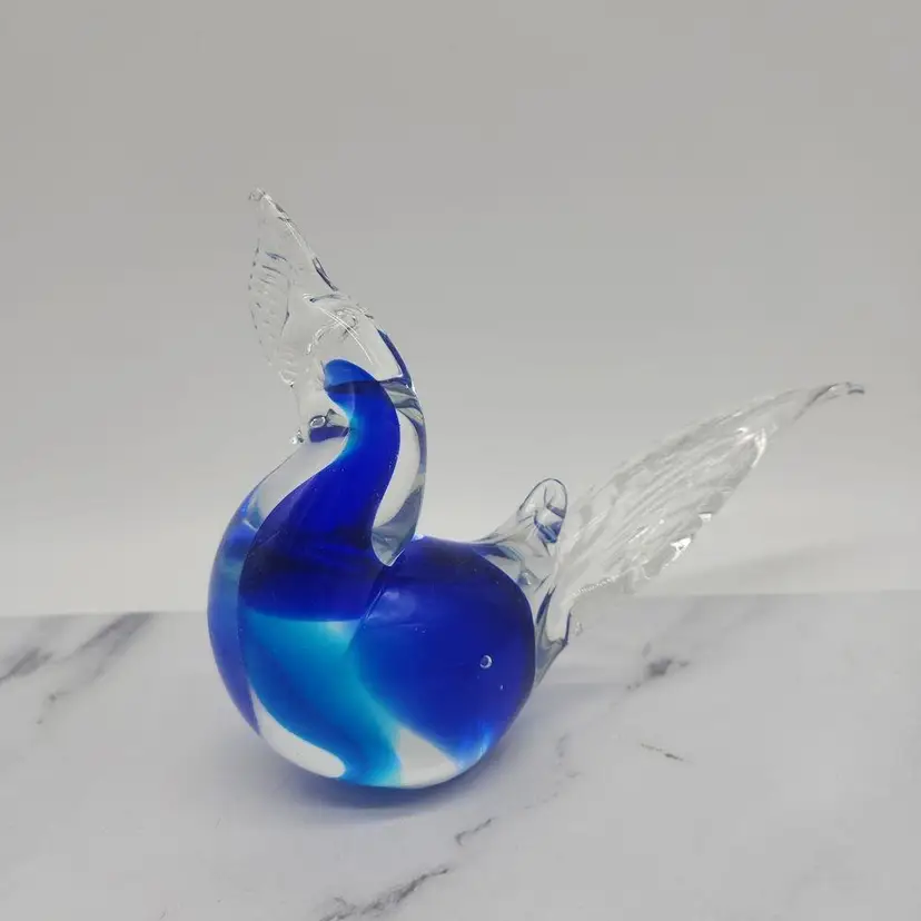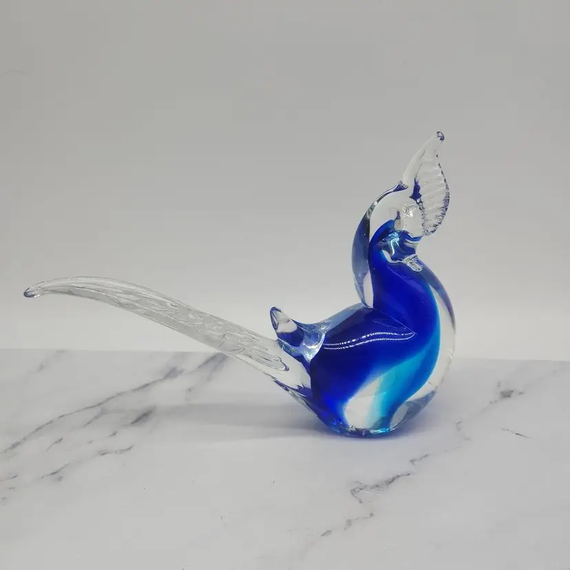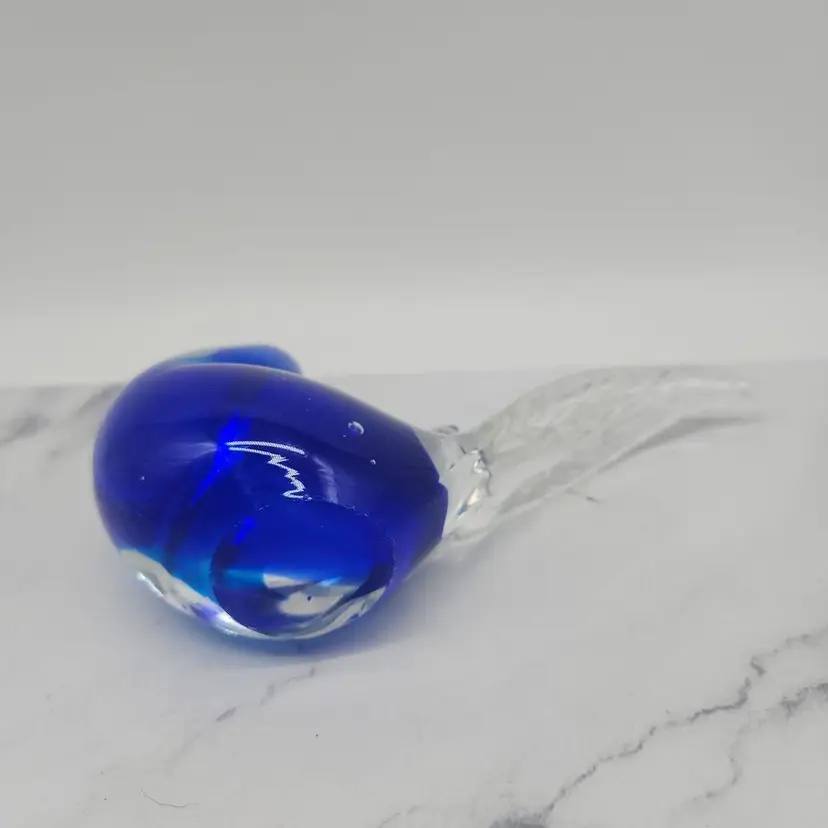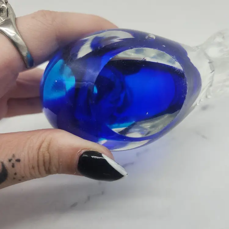 Clear glass with cobalt blue sommerso for a beautiful effect. No chips or cracks and in good pre-owned condition. 8" L x 5" H