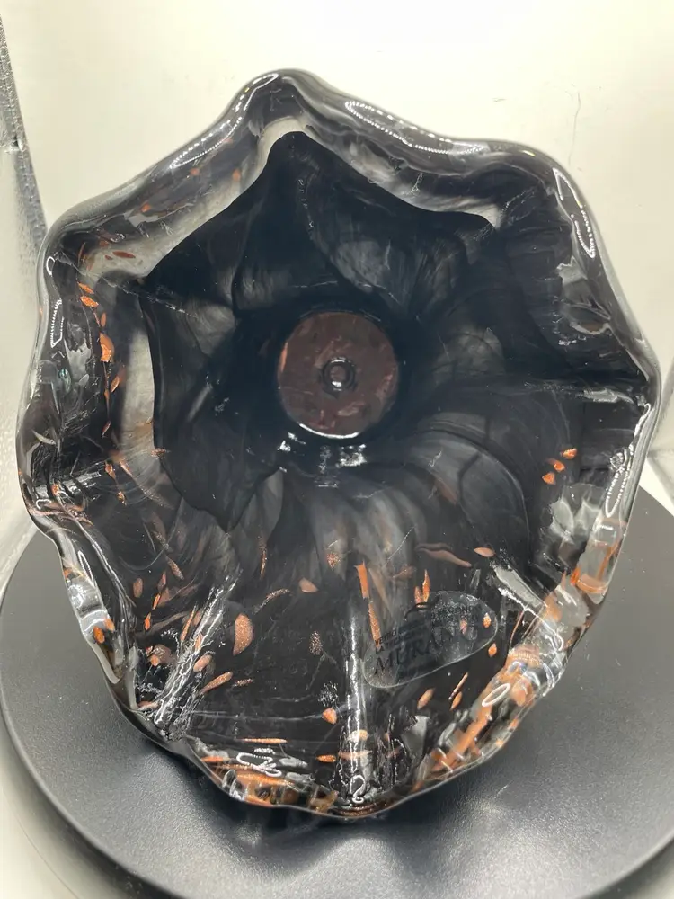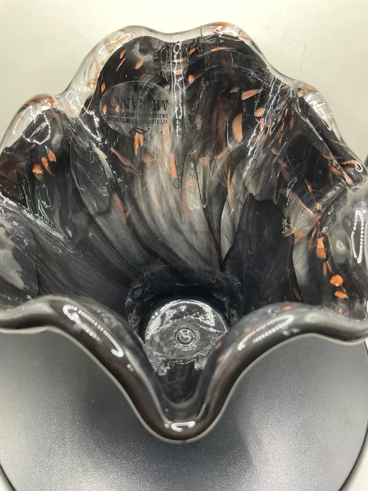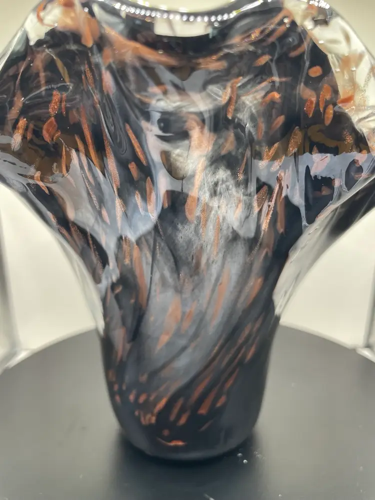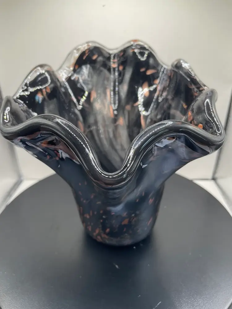 This black glass vase is stunning, beautiful, elegant and more! It measures about 6.25” tall.