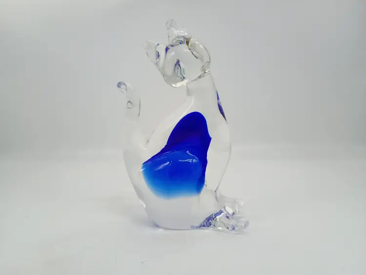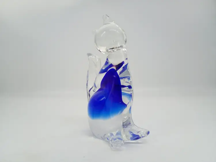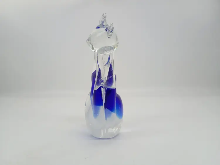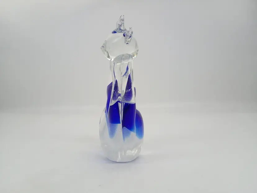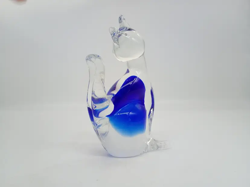 Murano Art Glass Sitting Cat Figurine Cobalt Blue to Clear . 4.5" Tall 3.5 inches long and 1.75 inches wide. This is preowned, probably was originally only marked with a sticker. Based on references either Vechia or Venzia Glass House. No chips cracks or flea bites, polished smooth clear pontil. No damage to ears or tail Excellent condition. Ships USPS domestically and USPS International Shipping globally