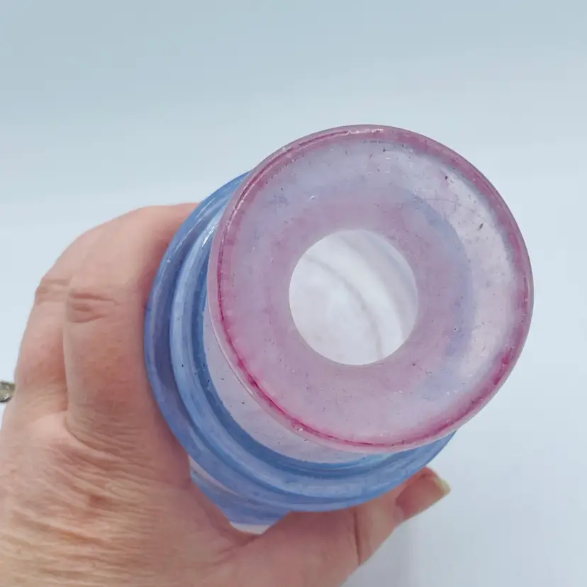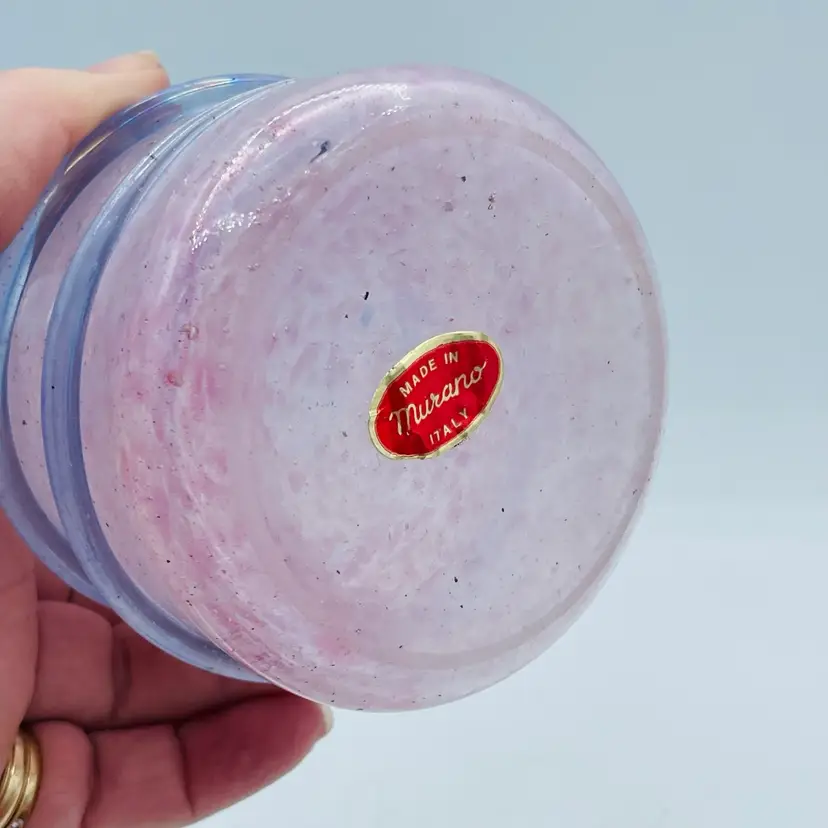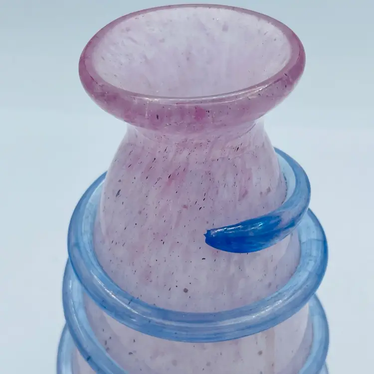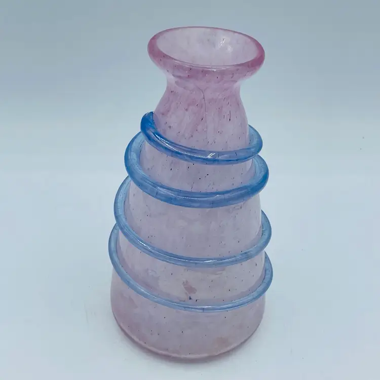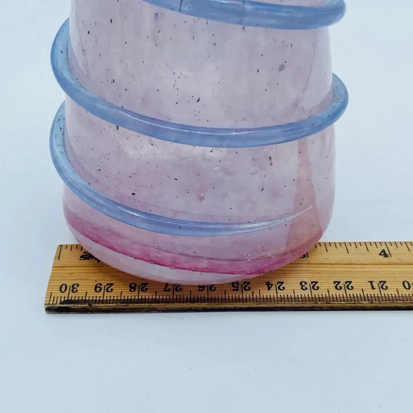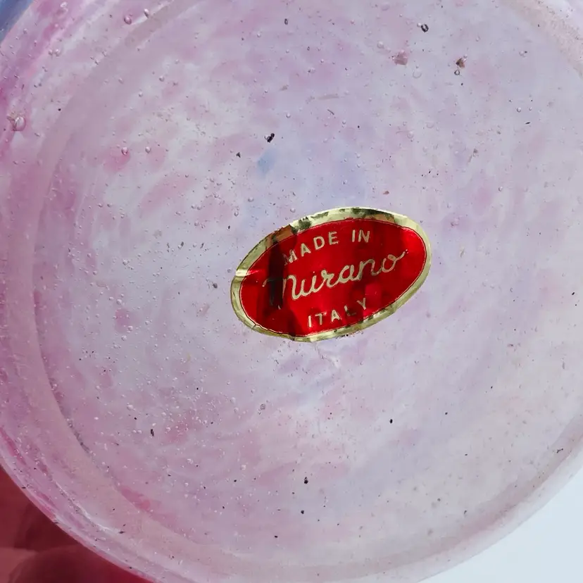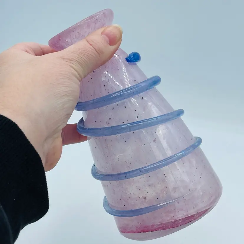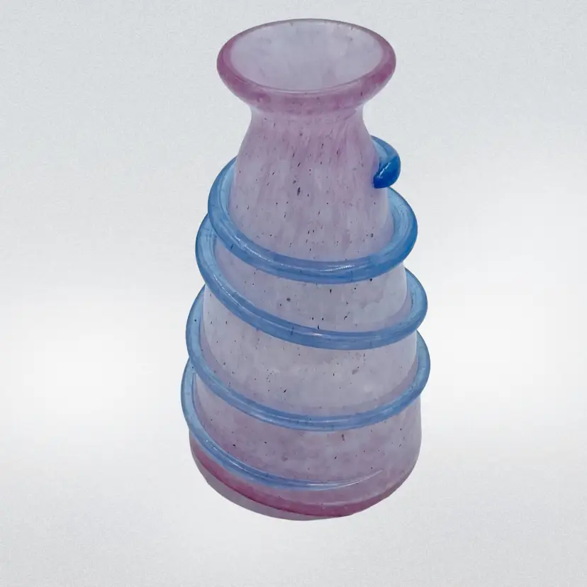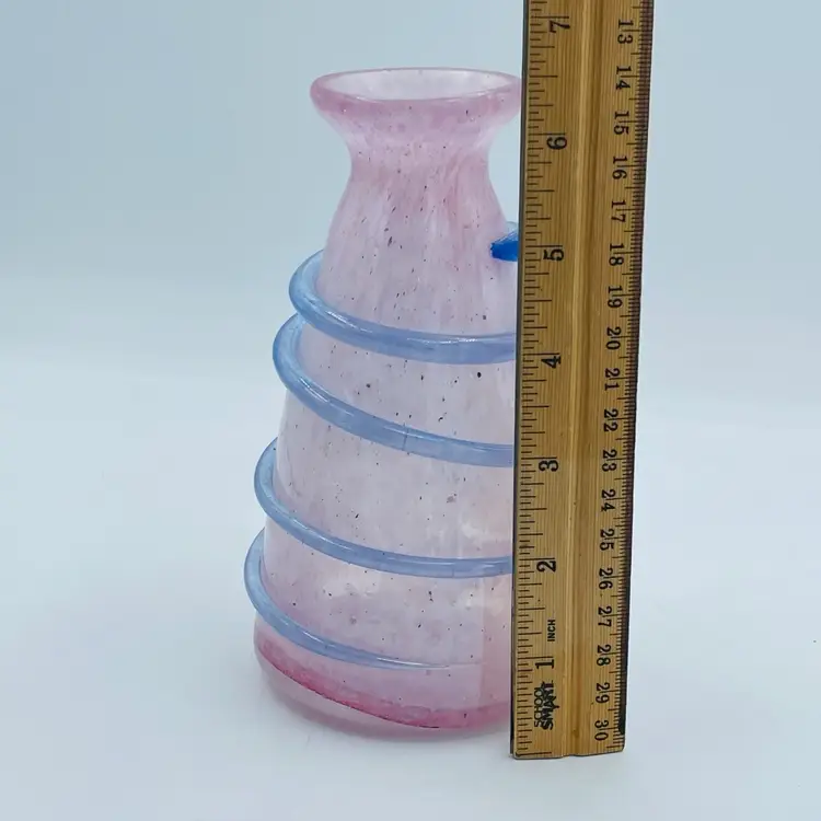 Very pretty pink glass vase with the applied piece swirling around exterior. Original Murano sticker on bottom. Nice frosted exterior with specks of color. See all images for more details and closeups.