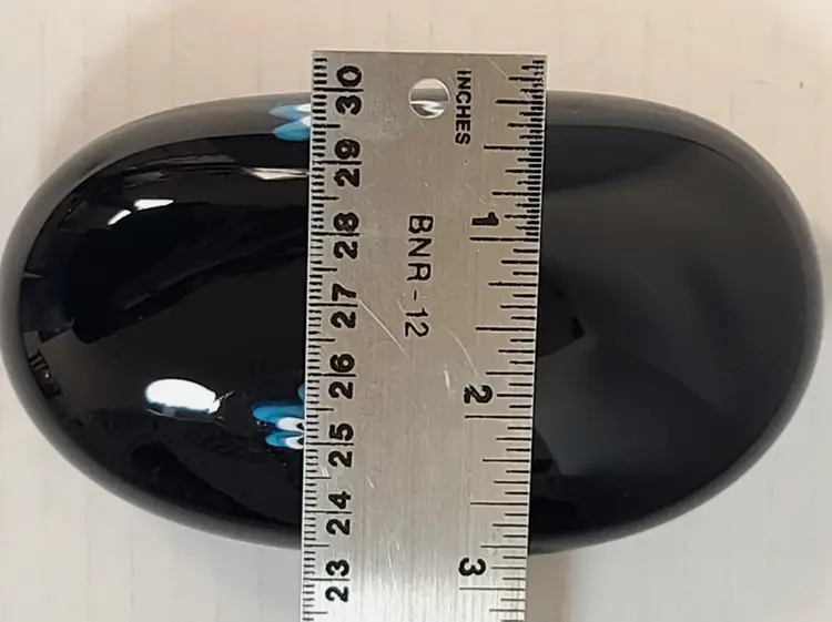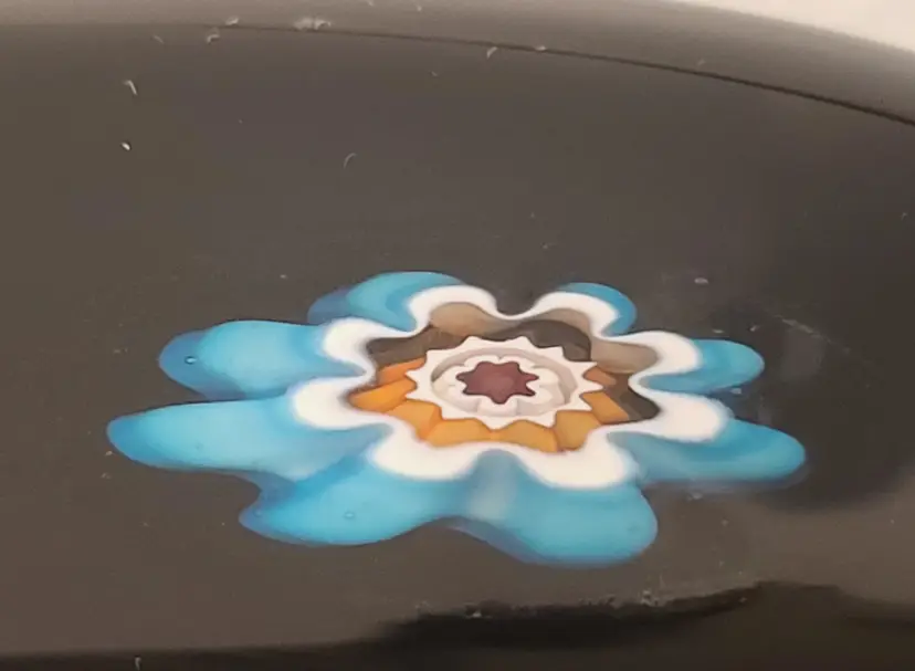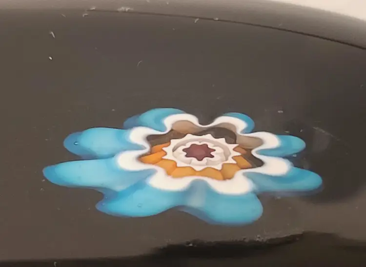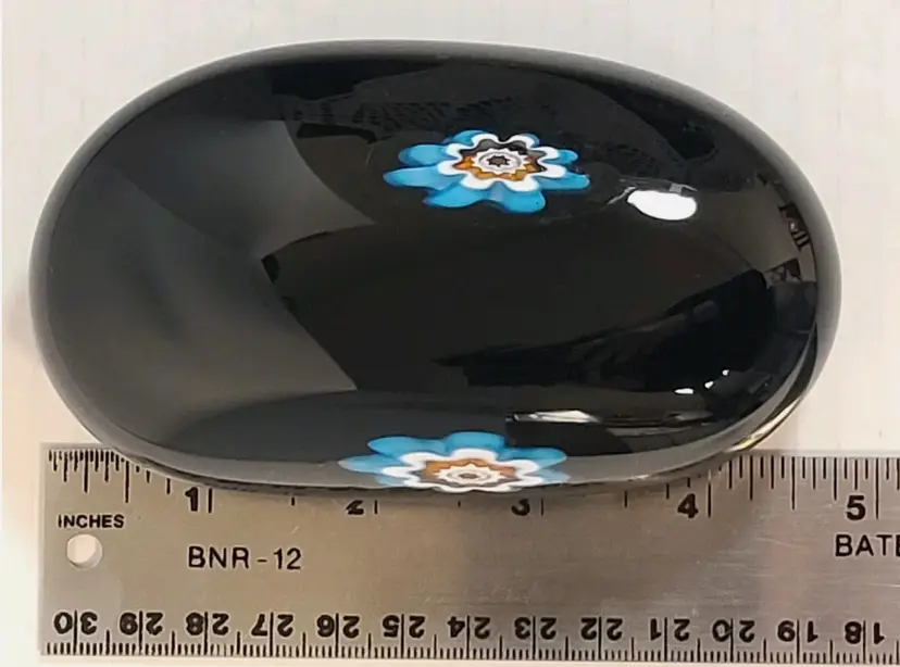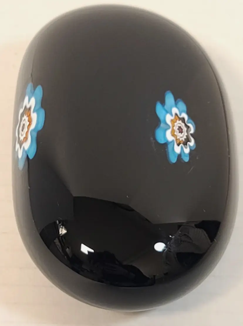 Elevate your desk's charm with the Murano Black Art Glass Paperweight, a true testament to the timeless beauty of Mid-Century Modern design. Featuring a glossy finish that accentuates its intricate floral pattern, this paperweight is a striking piece with a keen sense of history. Made in Italy with the renowned Millefiori technique, it showcases two vivid millefiori flowers on the front, adding a touch of natural elegance to its solid black backdrop.
