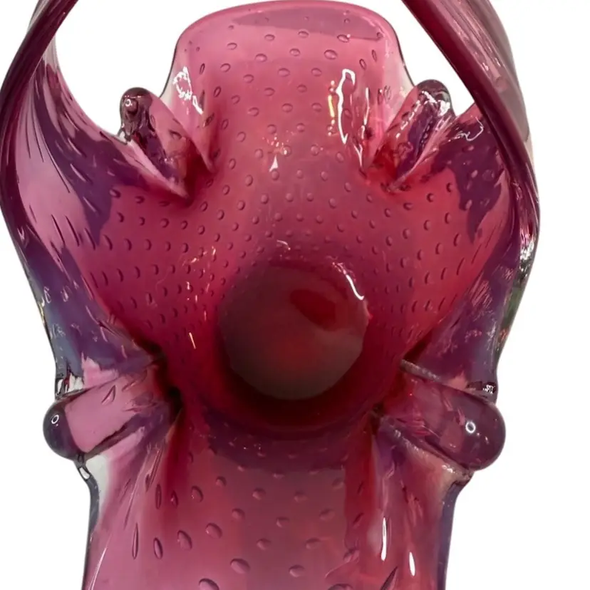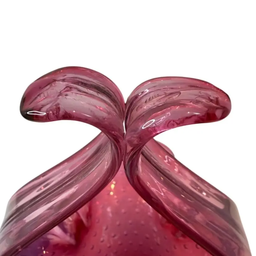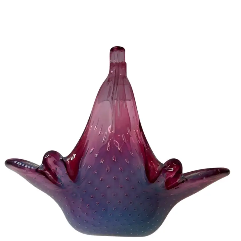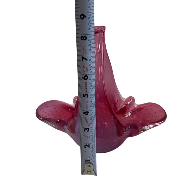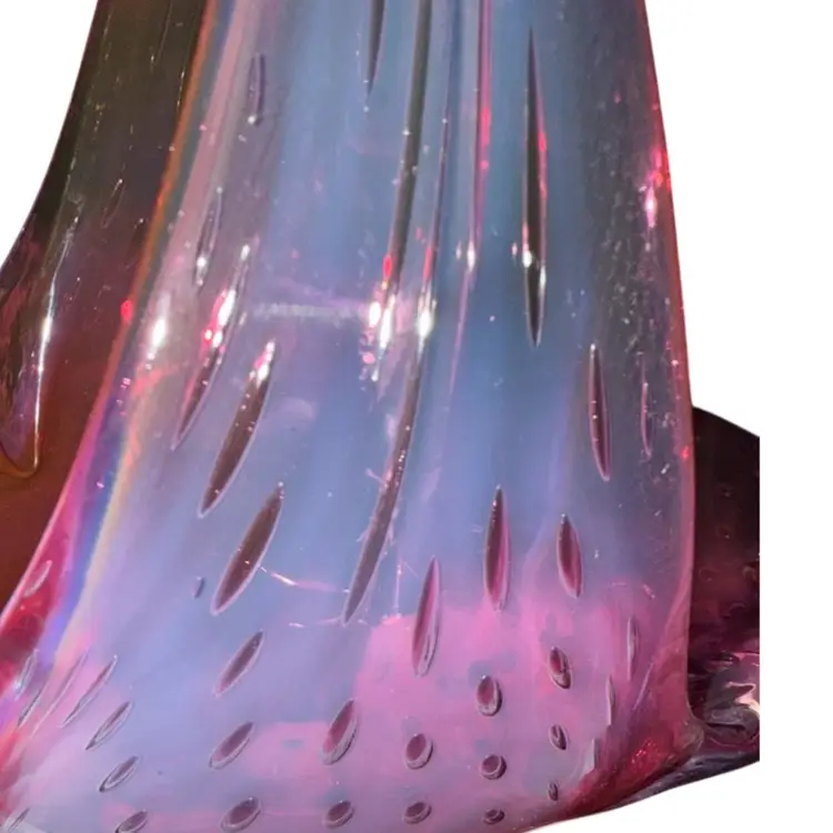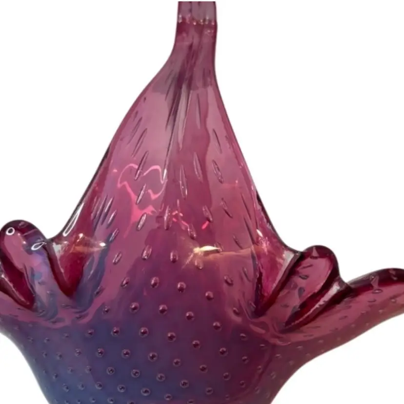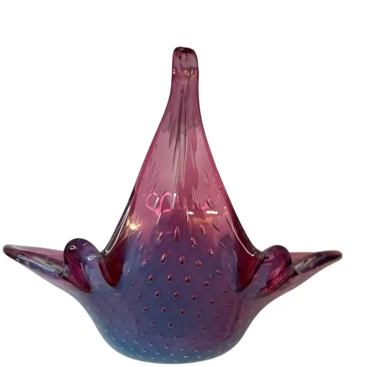 Stunning pink bullicante Murano Bowl wrapped in opalescent white. Condition: No chips, cracks, or flea bites. Very light wear on base. Measurements: Approximately 8 1/4” T x 9” L x 4 5/8” W. Please see pictures for condition and measurements as they are a part of the description. N11-19 Thank you for looking!