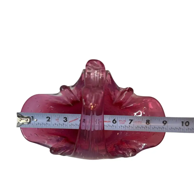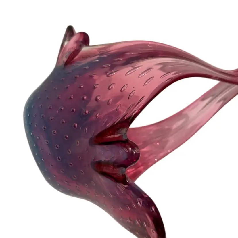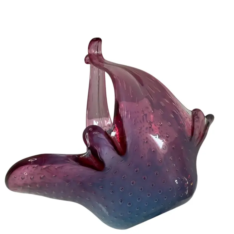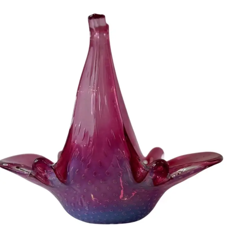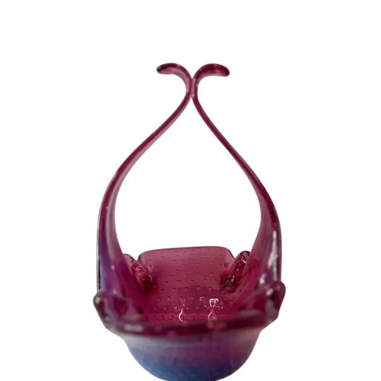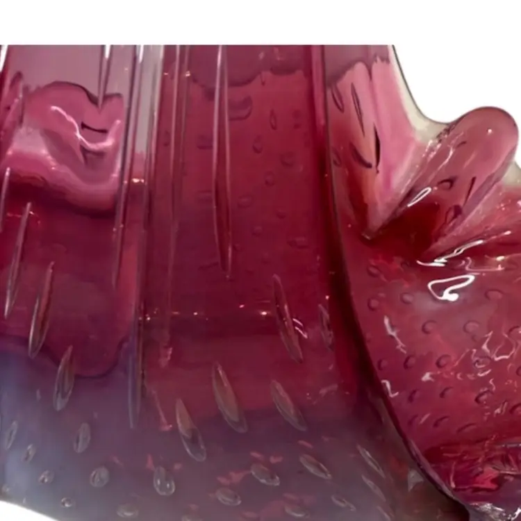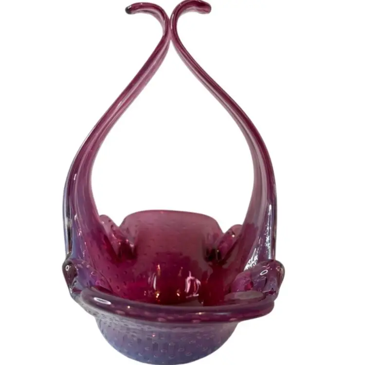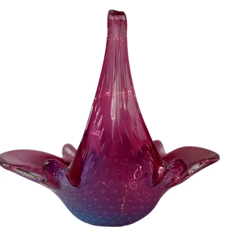 Stunning pink bullicante Murano Bowl wrapped in opalescent white. Condition: No chips, cracks, or flea bites. Very light wear on base. Measurements: Approximately 8 1/4” T x 9” L x 4 5/8” W. Please see pictures for condition and measurements as they are a part of the description. N11-19 Thank you for looking!