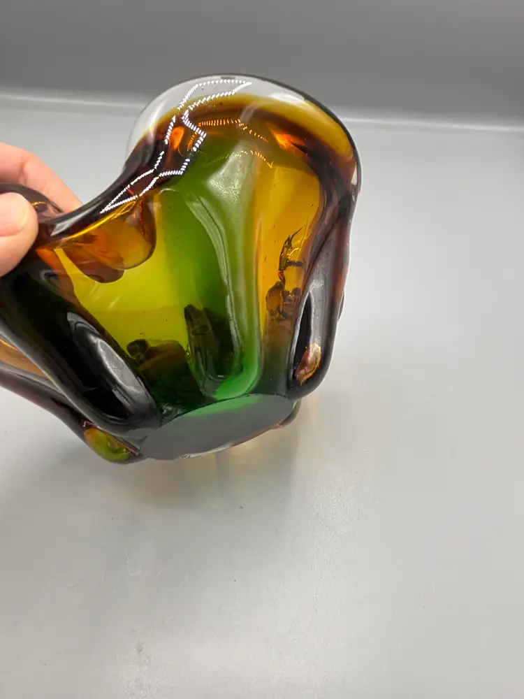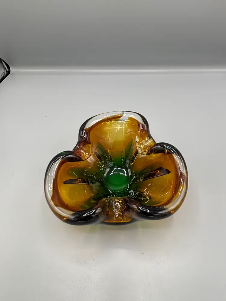 Murano brown glass dish that would look amazing in any fall display or use all year. The shades of green & brown blend so nicely. This is a thick and heavy piece of glass. Refer to pictures to appreciate the colors.