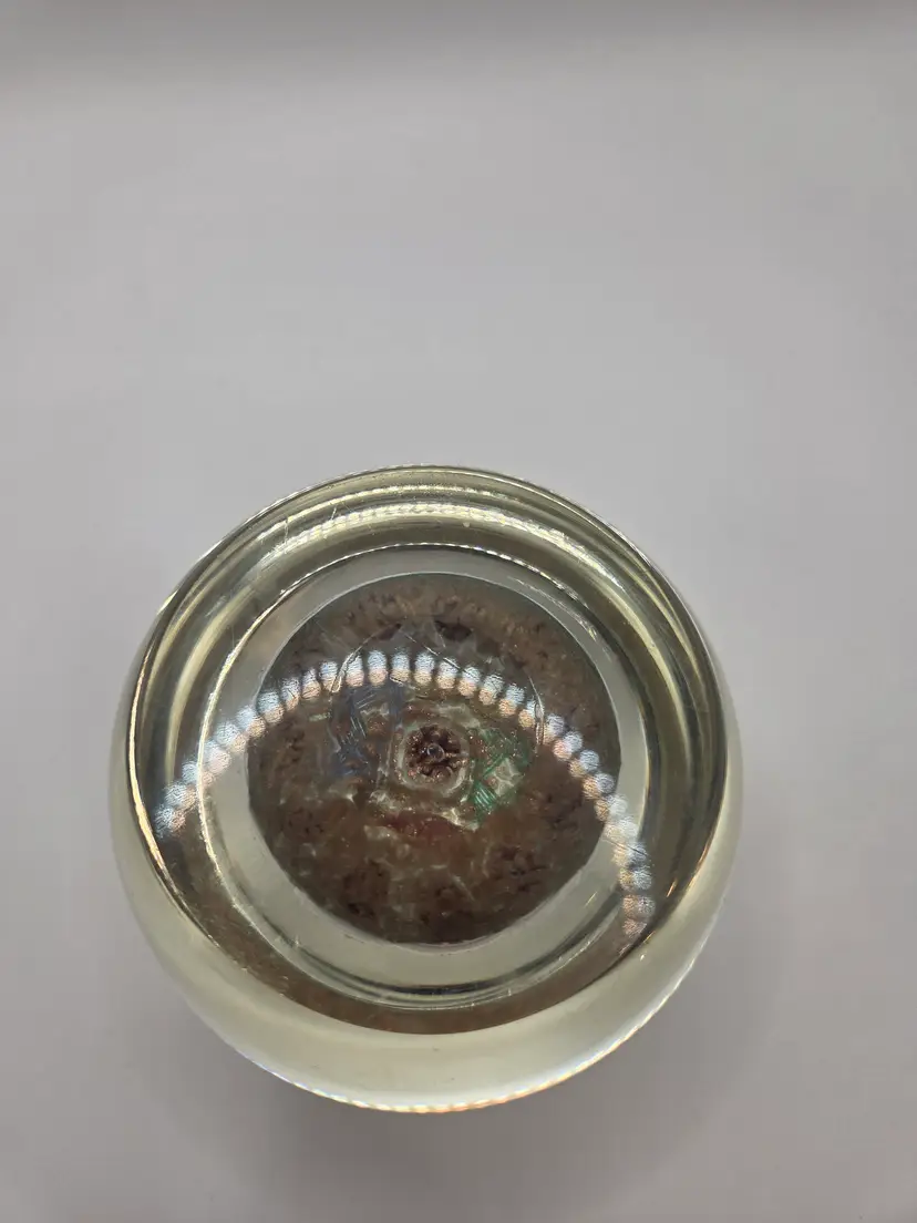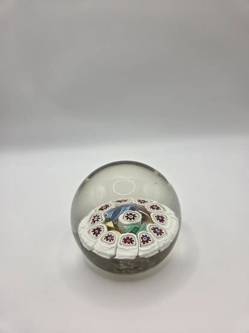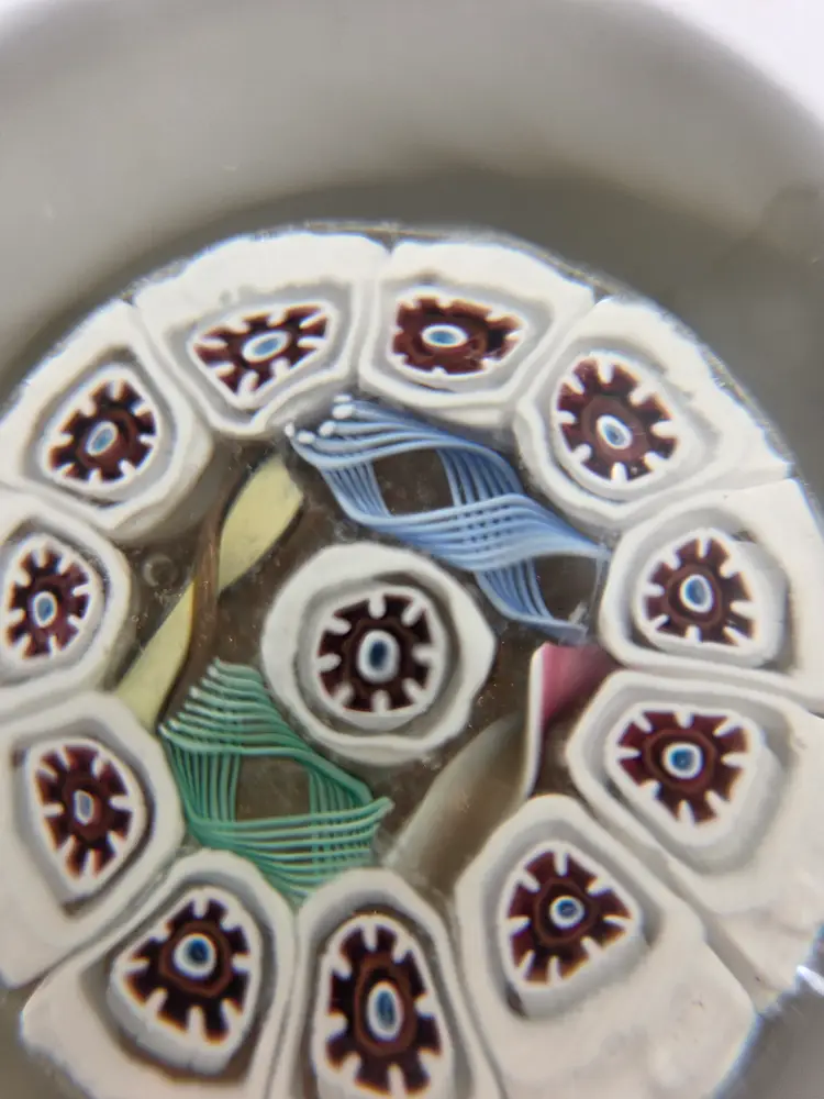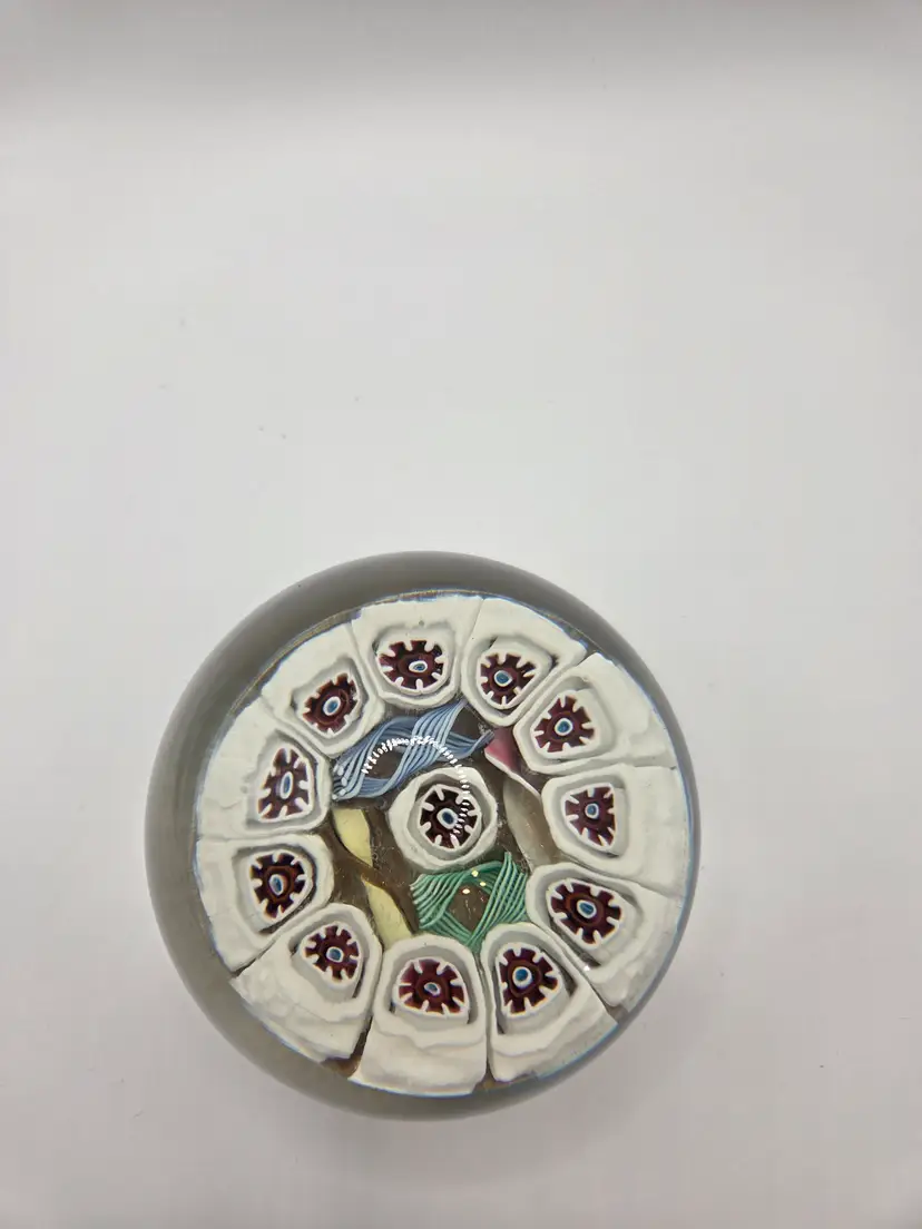 Well done Murano glass paperweight. 3" round. Pretty cane work and latticino ribbon details.