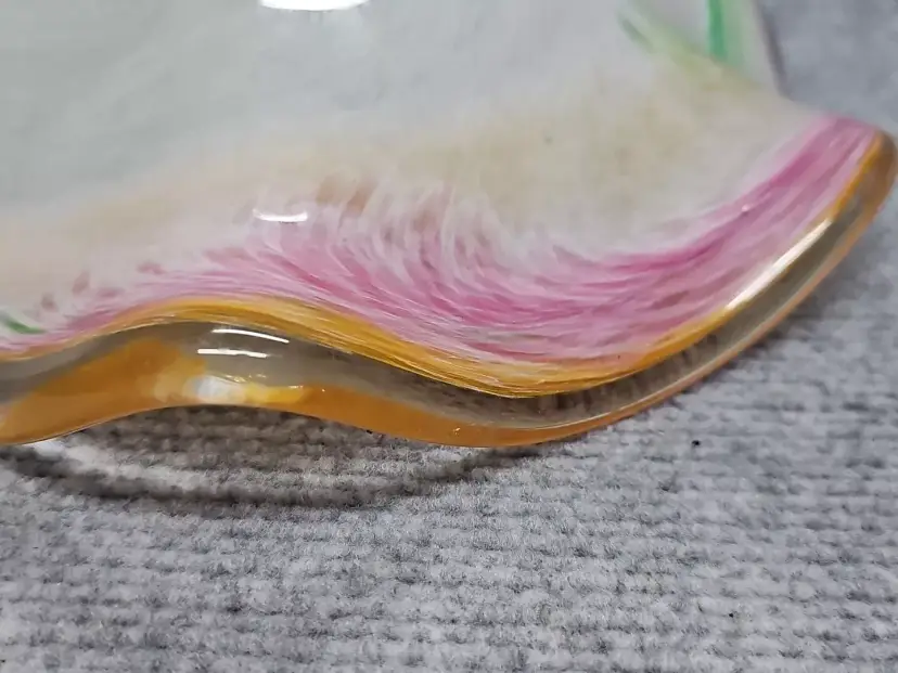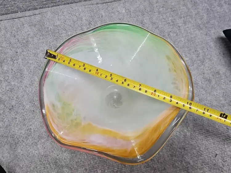 9 1/2" bowl /dish is a fine masterpiece of Murano art glass. Crafted in Italy, the bowl features a scalloped design with breathtaking pastel colors.
