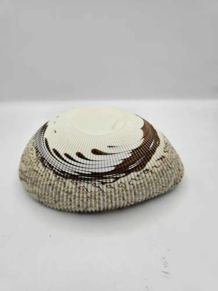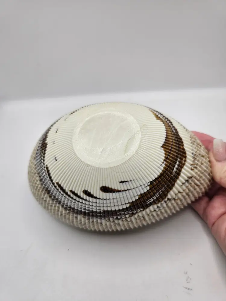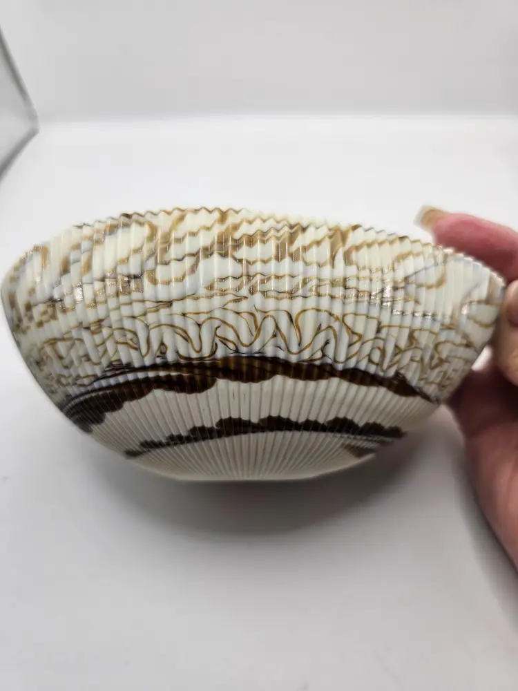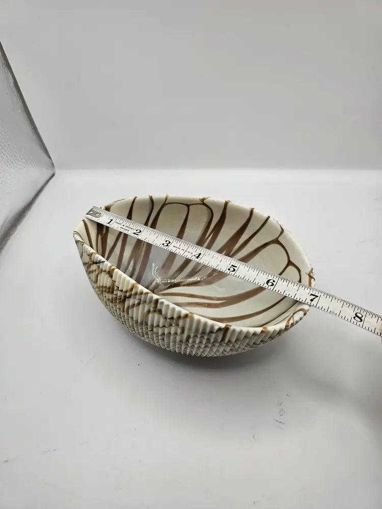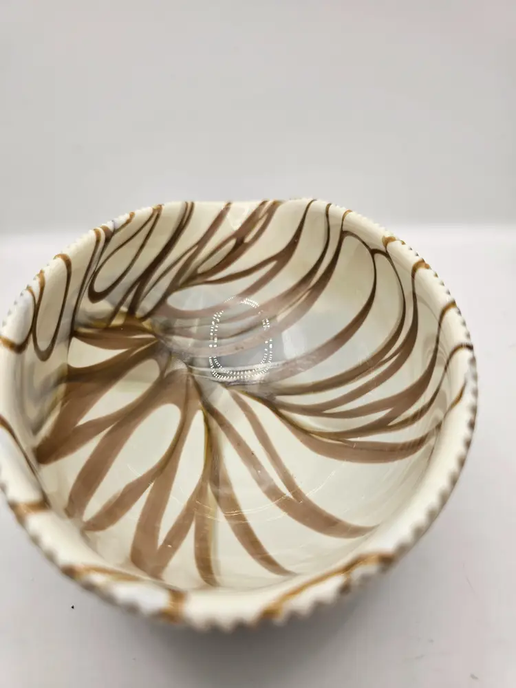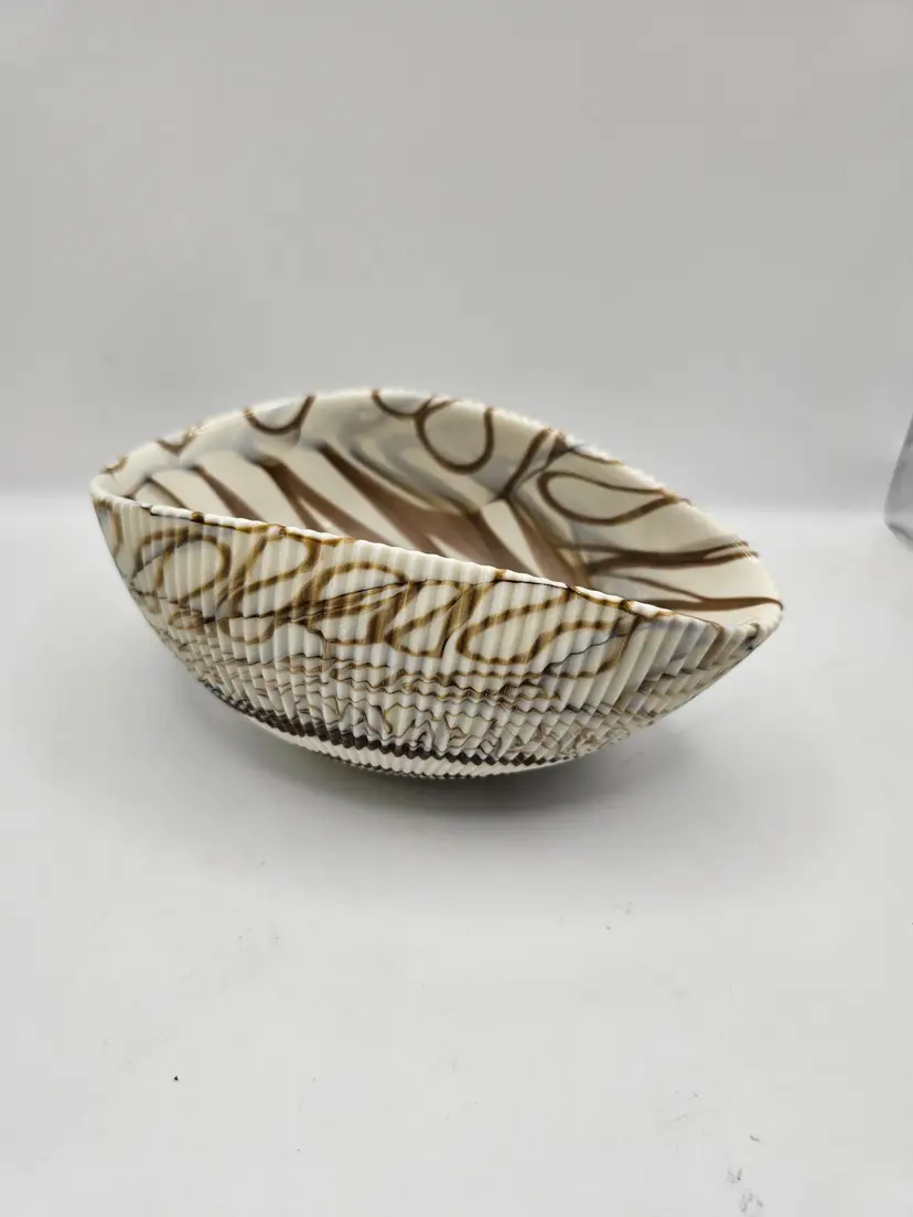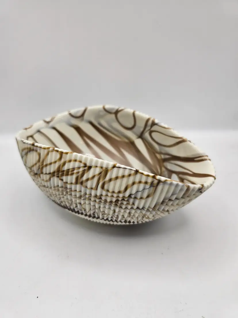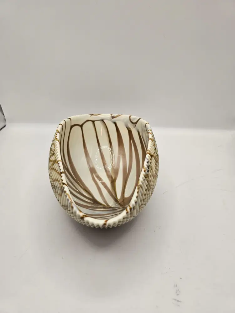 Wow...STUNNING! Coppery brown and creamy white swirl. I had no idea Murano made this slag glass marble looking items. This was a completely accidental find! Lol! I just liked it so I bought it. Tiny flea bite on edge. See pic. I found it while taking photos. Can't see it. :/ I took a pic pointing it out and without so you can see. Gorgeous 7 x 4.