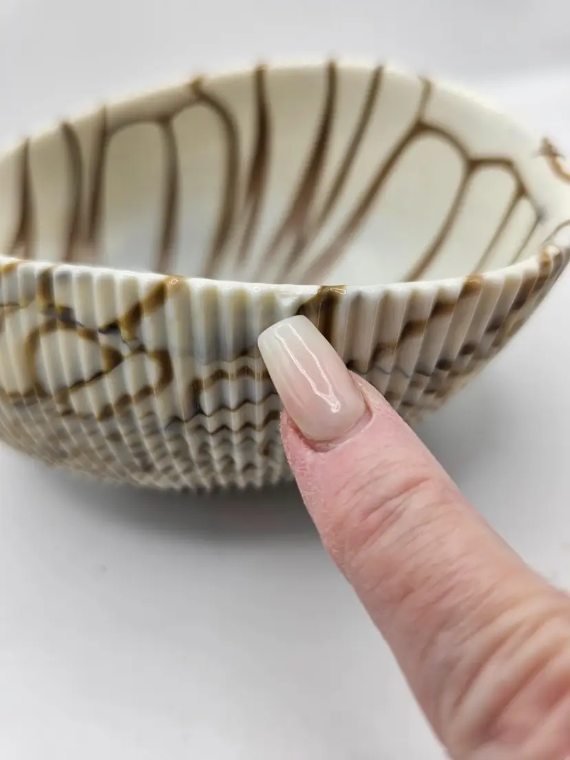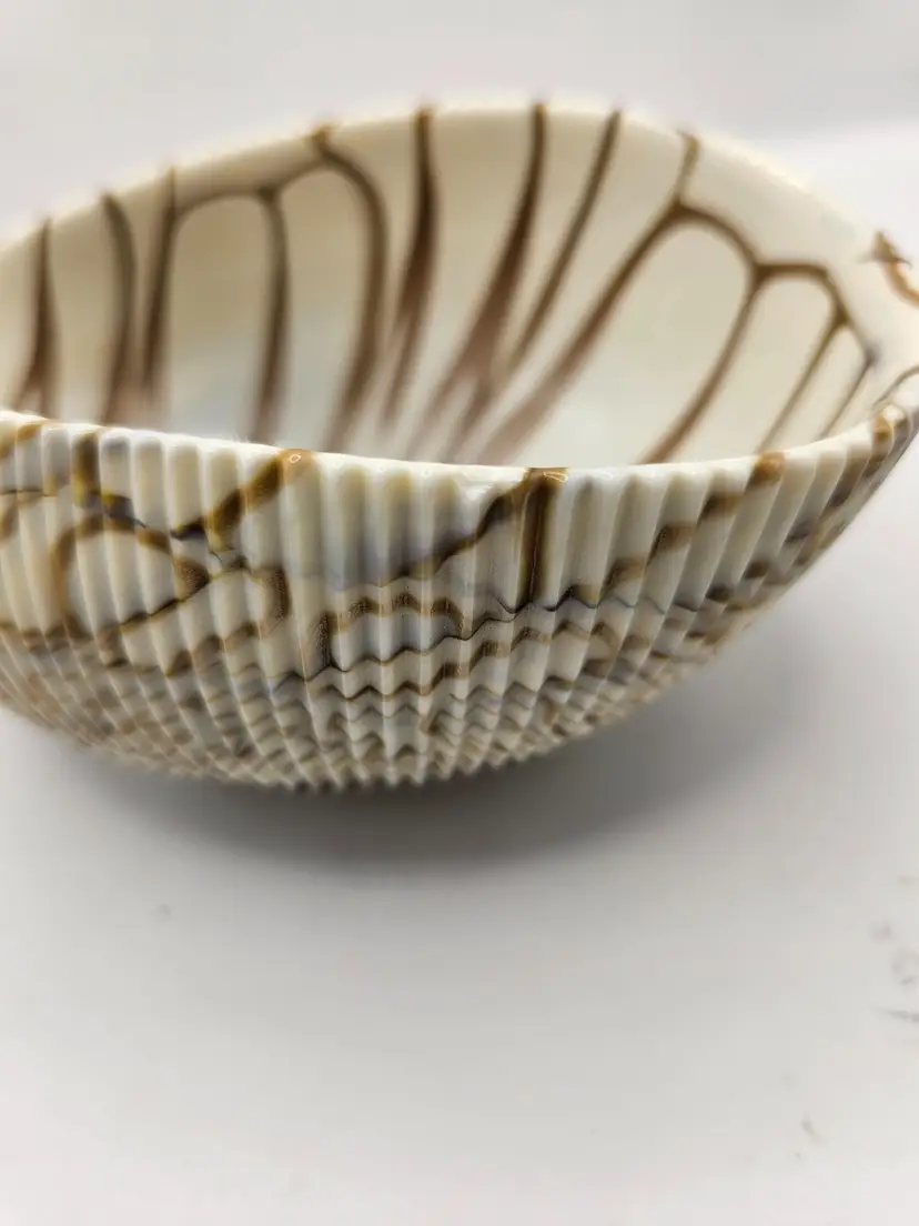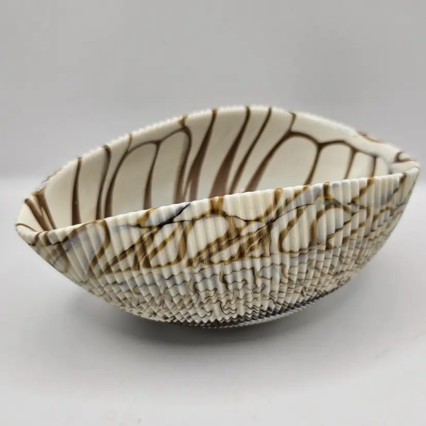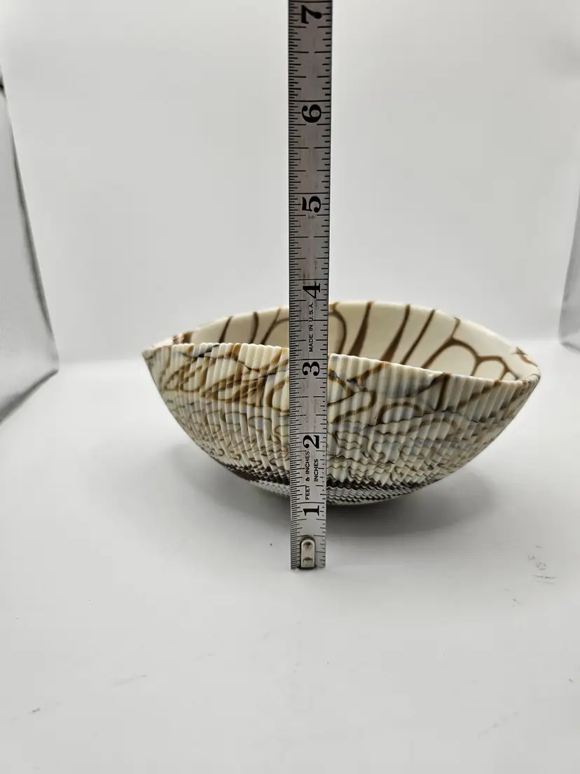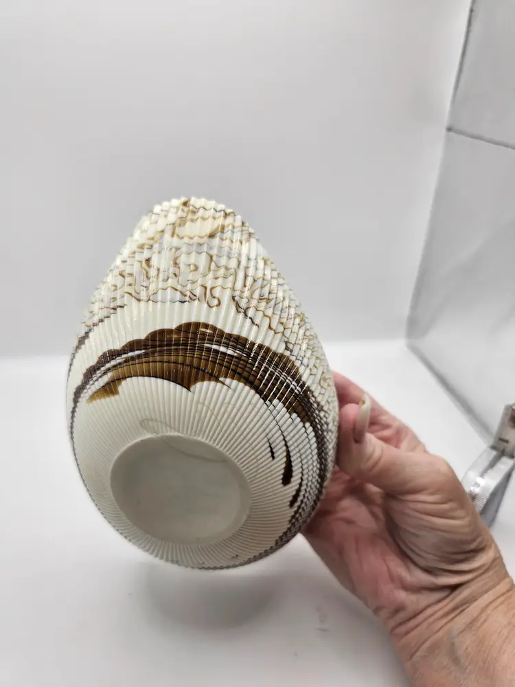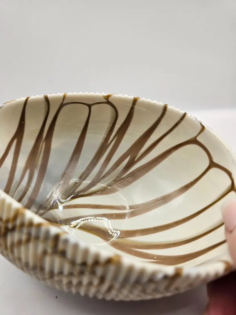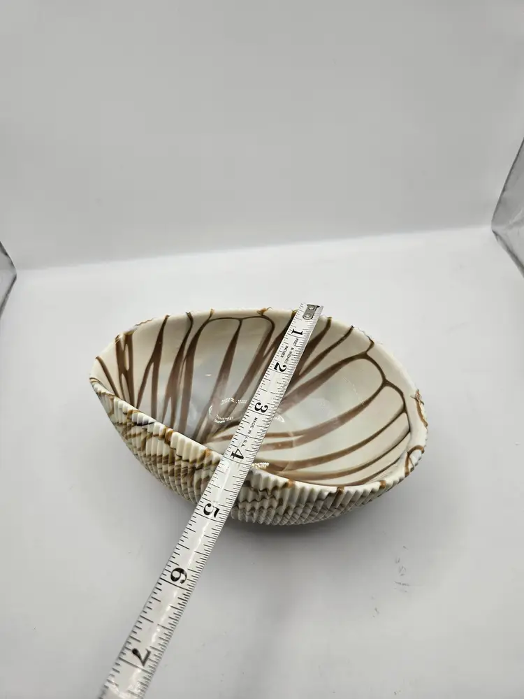 Wow...STUNNING! Coppery brown and creamy white swirl. I had no idea Murano made this slag glass marble looking items. This was a completely accidental find! Lol! I just liked it so I bought it. Tiny flea bite on edge. See pic. I found it while taking photos. Can't see it. :/ I took a pic pointing it out and without so you can see. Gorgeous 7 x 4.