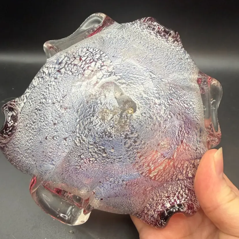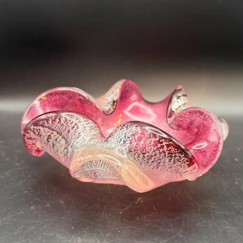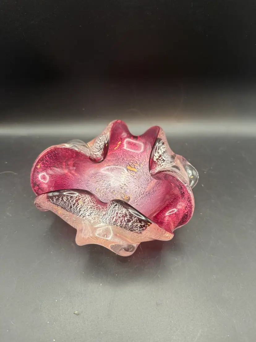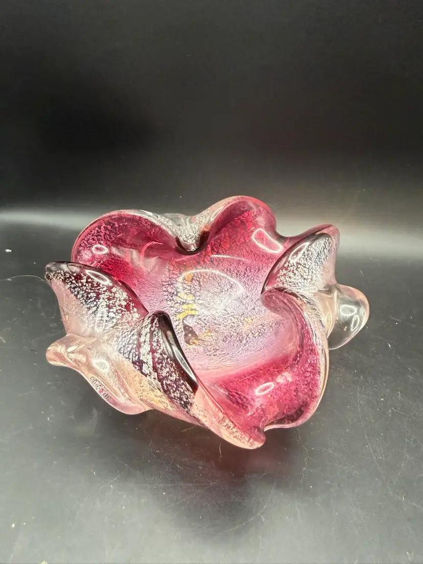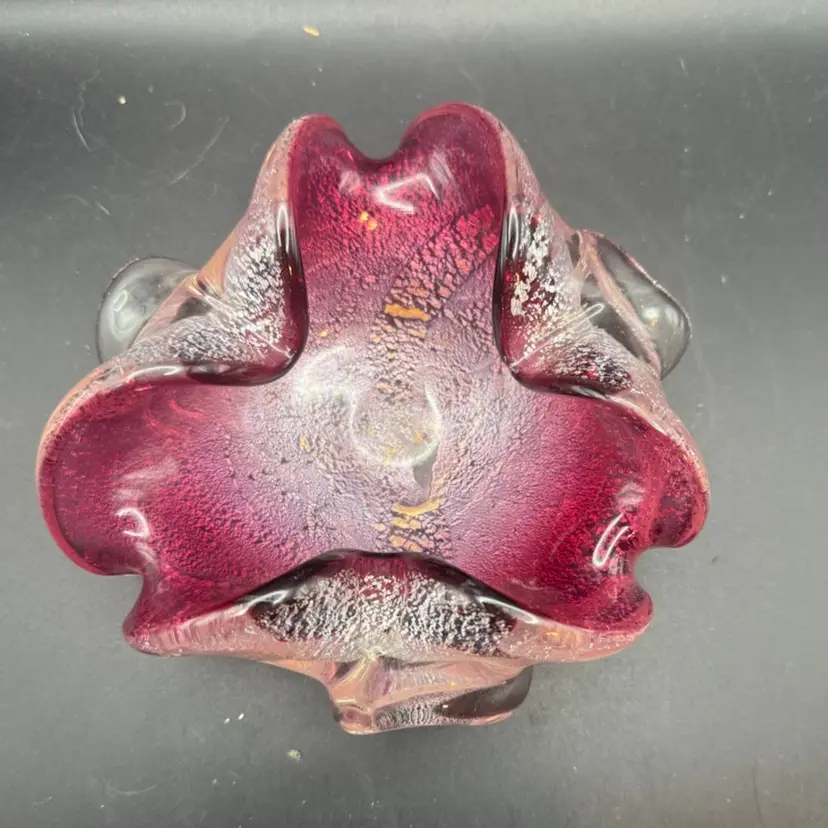 Murano glass, originating from the island of Murano in Venice, Italy, has a history stretching back over a thousand years. It is renowned for its exceptional quality, vibrant colors, and intricate techniques,and 'bullicante' (creating bubbles within the glass). This particular piece, with its free-form shape and inclusion of gold flecks, is characteristic of mid-century Italian art glass. Such decorative bowls and ashtrays were popular in the post-war era, often showcasing the artisan's skill in manipulating molten glass. The use of cranberry glass and gold leaf reflects a common aesthetic of the period, blending rich colors with metallic accents for a luxurious feel.