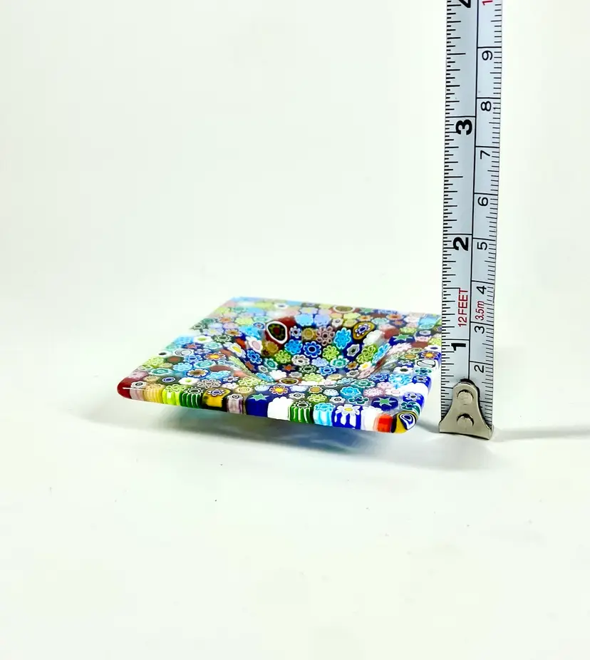 The Murano Glass Millefiori Trinket Dish is a beautifully handcrafted square dish made of glass in Venice. It features a multicolor Millefiori pattern, a glossy finish, and is adorned with decorative details. This Art Glass trinket dish is unboxed and should be hand washed for care. Perfect for storing small trinkets or jewelry, this vintage piece adds a touch of elegance to any space with its unique design and brand heritage.