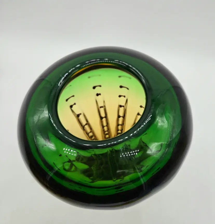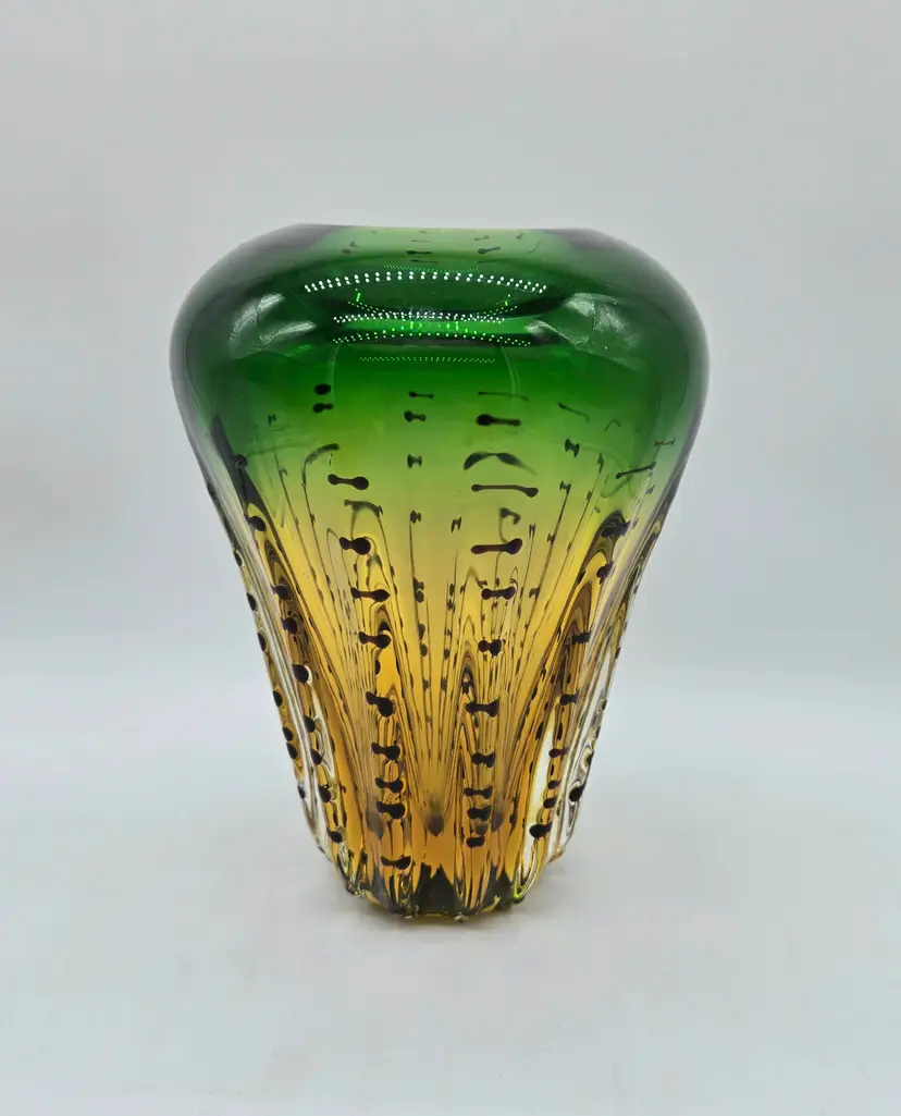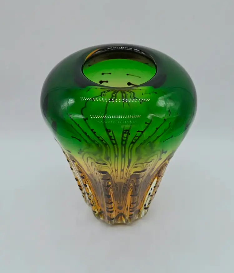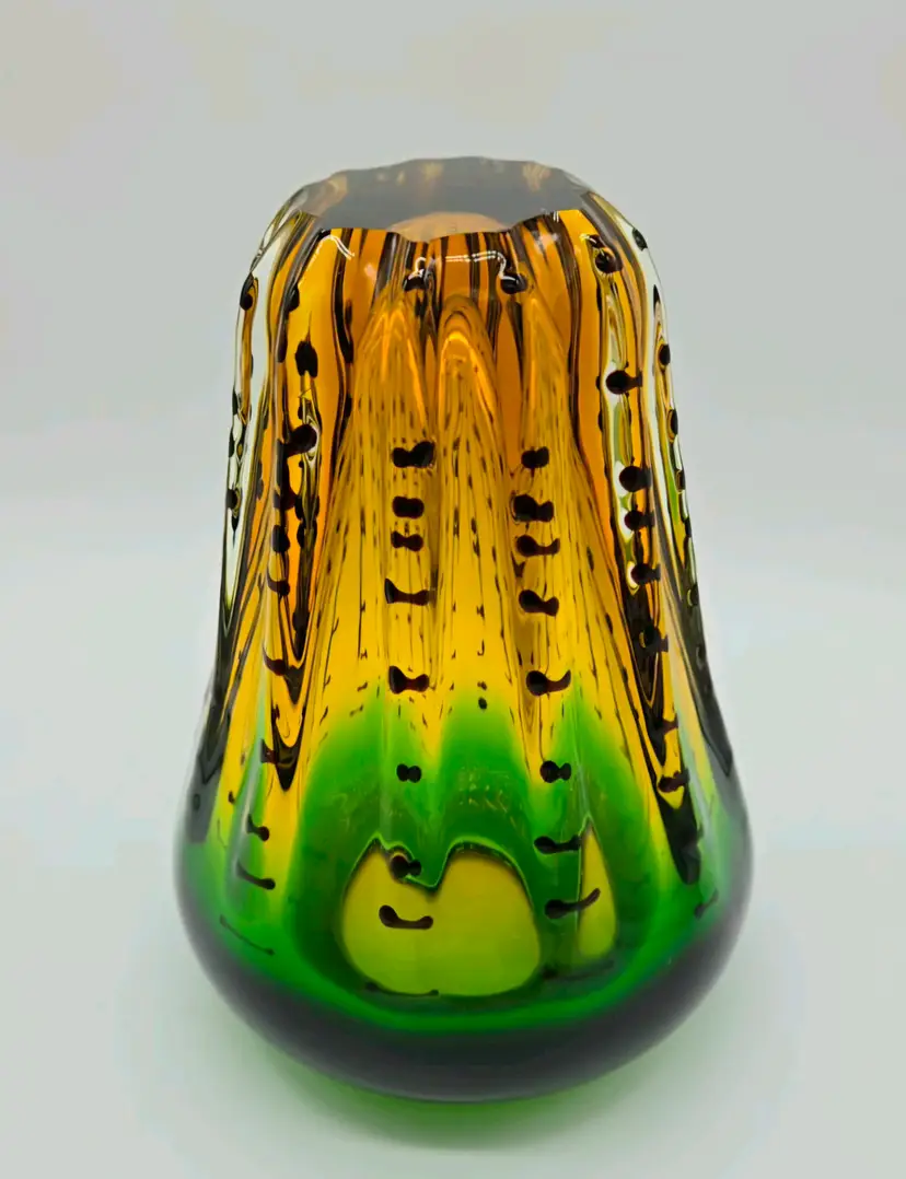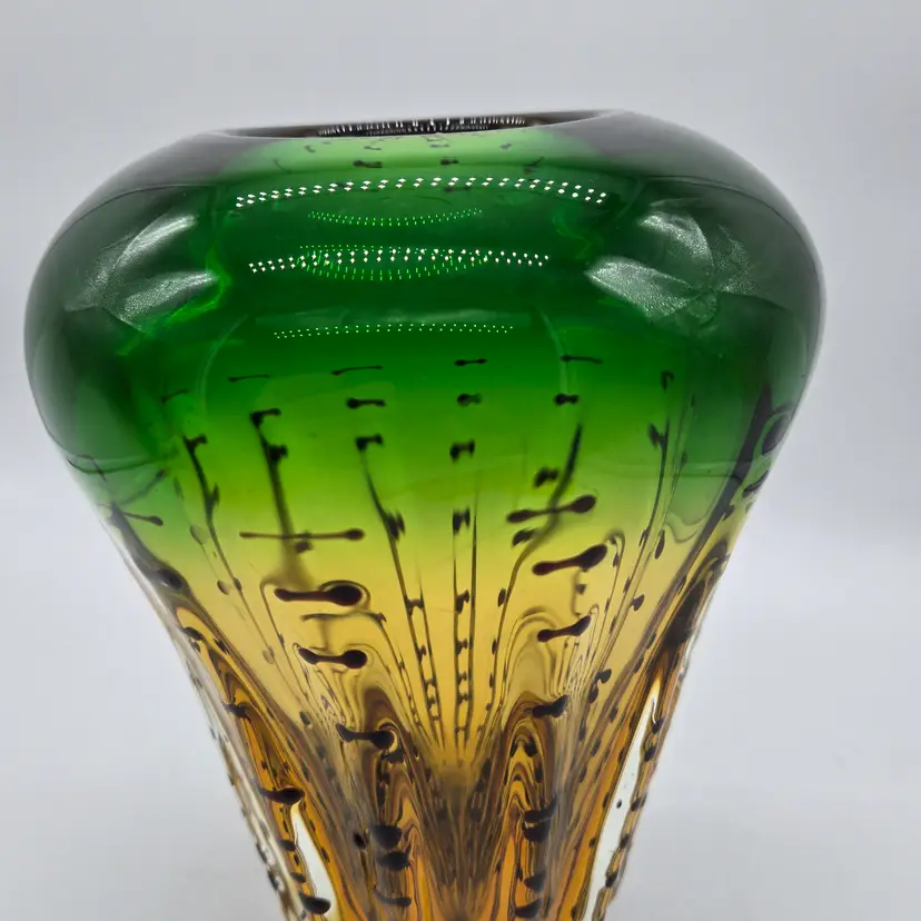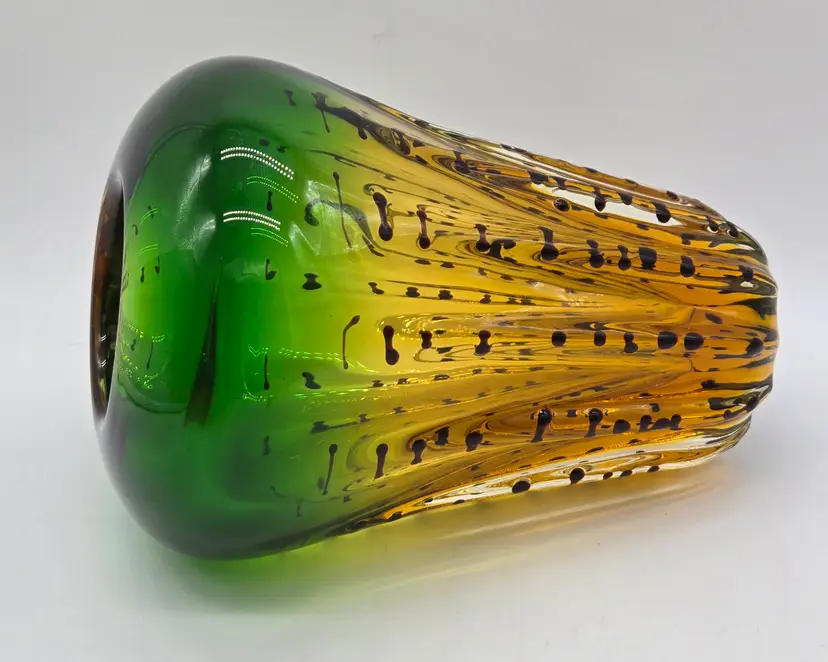 Green and Amber Vase. 8" x 6" . Beautiful Handmade Art Glass Vase. Lovely Amber and Green Glass with Black accents. Smooth finished base. Appears to be Murano but in my opinion it is possibly Canadian glass by the artist Ian Forbes, who studied under a murano master glass blower (piece was found in a collection that included an Ian Forbes piece, that I have listed, with very similar decoration). No signature on vase. No chips, cracks or bruises. There are a few scratches on one side but they don't show up very well. I have one photo where I managed to show the two largest. Bottom is fairly clean with normal wear from years of moving about on shelves. Most likely around 40 years old. Please see photos as they are part of the description. Item will be well wrapped before shipping.