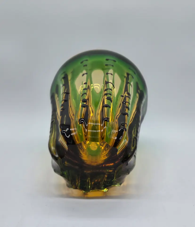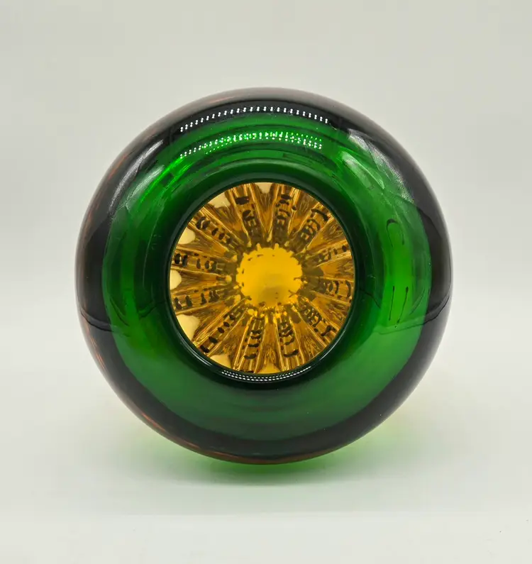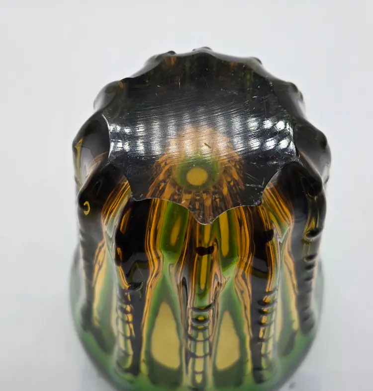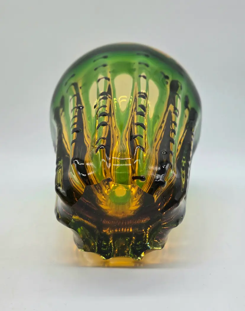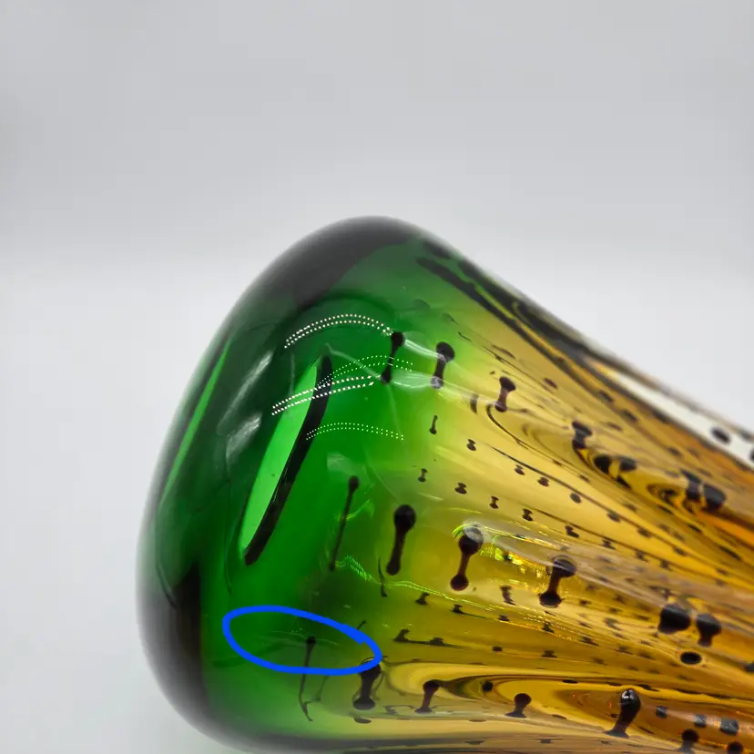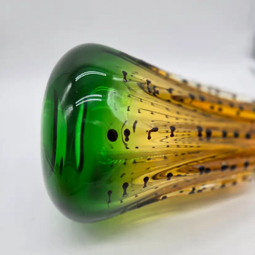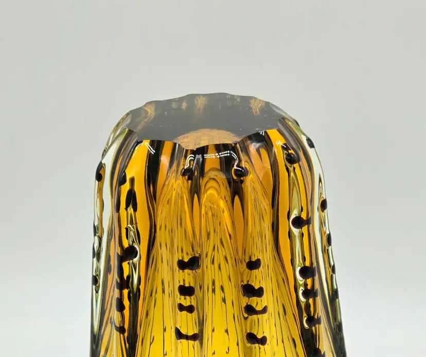 Green and Amber Vase. 8" x 6" . Beautiful Handmade Art Glass Vase. Lovely Amber and Green Glass with Black accents. Smooth finished base. Appears to be Murano but in my opinion it is possibly Canadian glass by the artist Ian Forbes, who studied under a murano master glass blower (piece was found in a collection that included an Ian Forbes piece, that I have listed, with very similar decoration). No signature on vase. No chips, cracks or bruises. There are a few scratches on one side but they don't show up very well. I have one photo where I managed to show the two largest. Bottom is fairly clean with normal wear from years of moving about on shelves. Most likely around 40 years old. Please see photos as they are part of the description. Item will be well wrapped before shipping.
