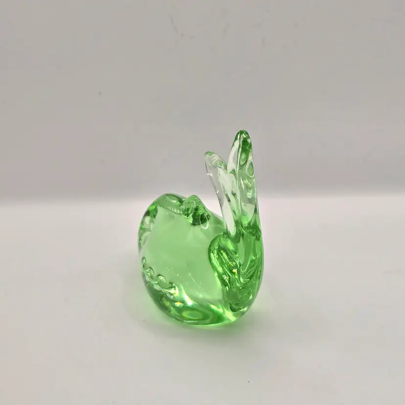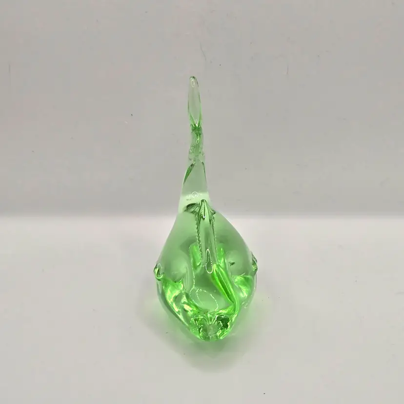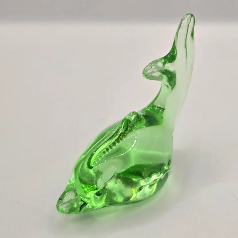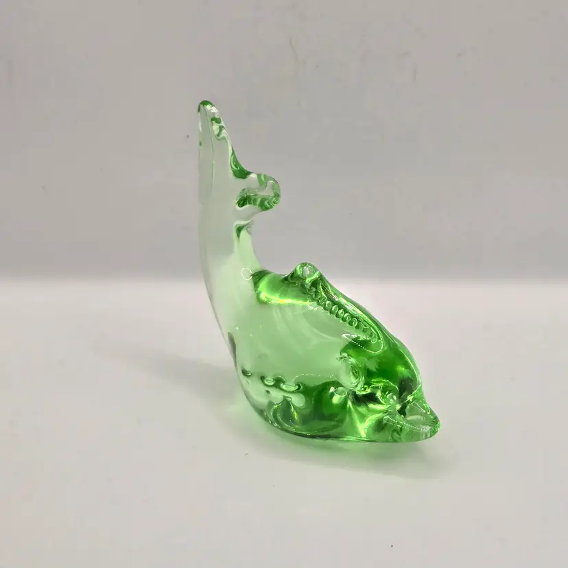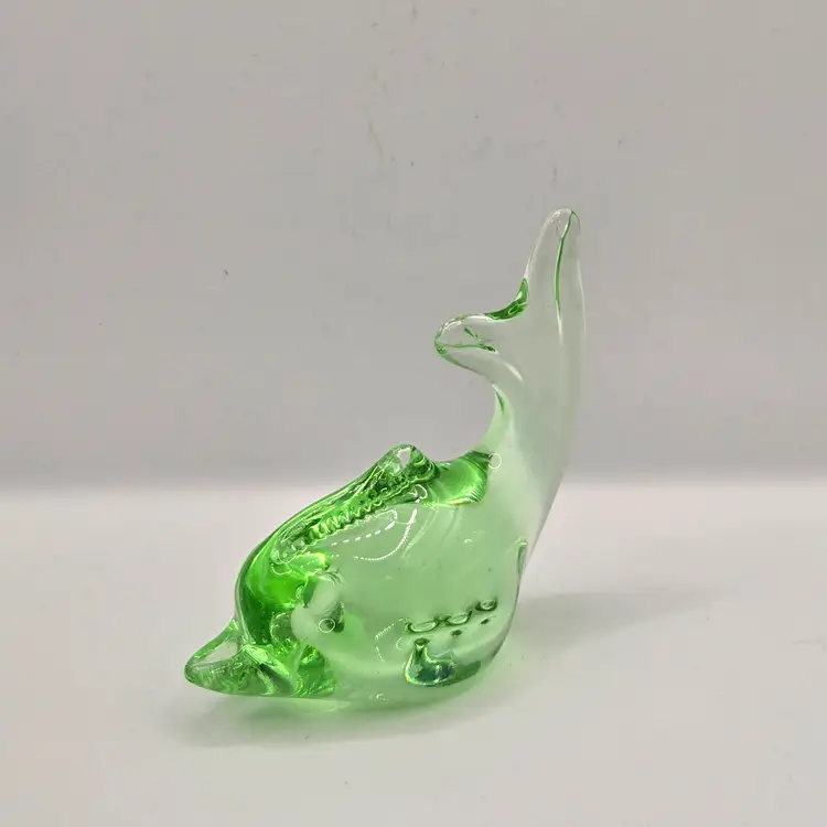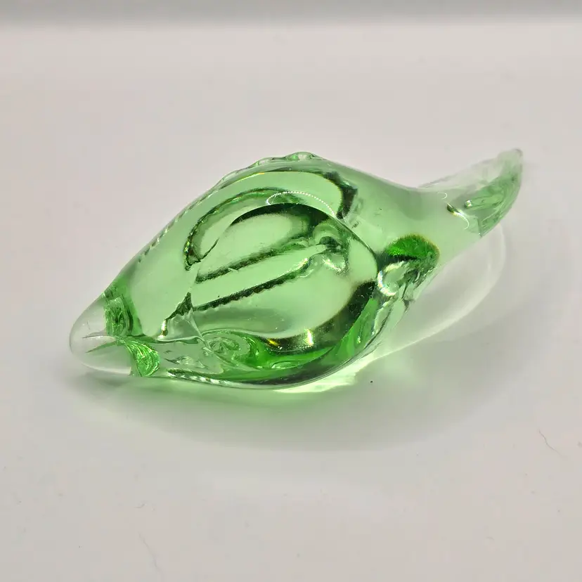 Murano Green Fish/Dolphin Paperweight. 4" x 3.5". Beautiful colour...no chips, cracks or bruising. Please see photos as they are part of the description. Item will be well wrapped before shipping. Items from my listings can be combined for shipping if safe to do so. (During Canada postal strike I'm shipping with a cross border shipper, Item will be delivered by USPS)