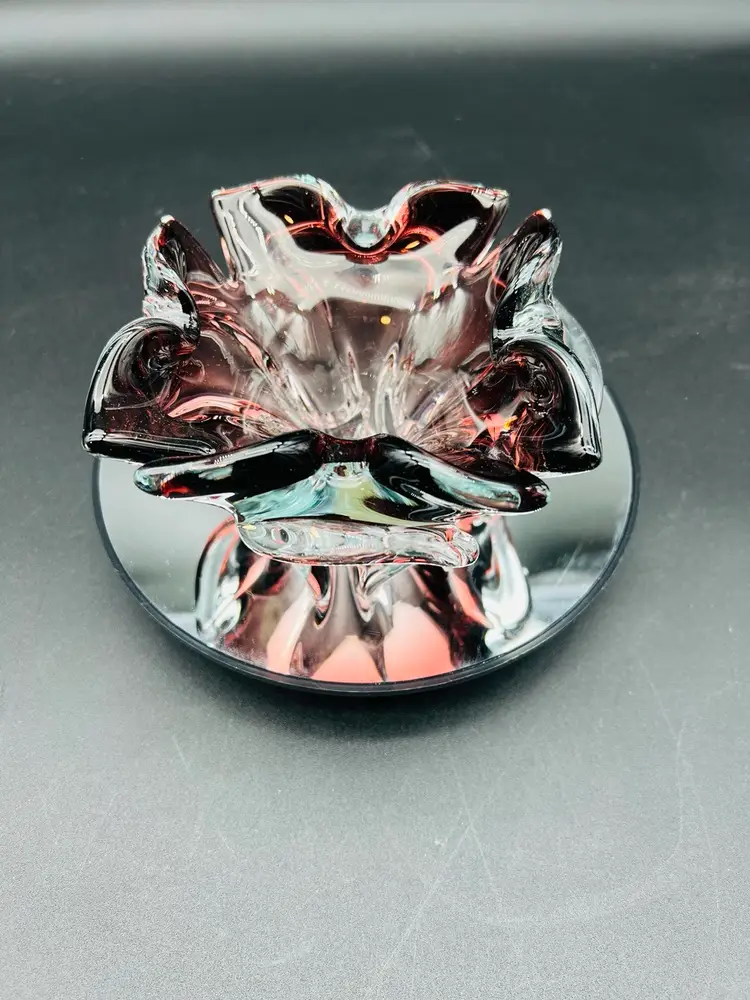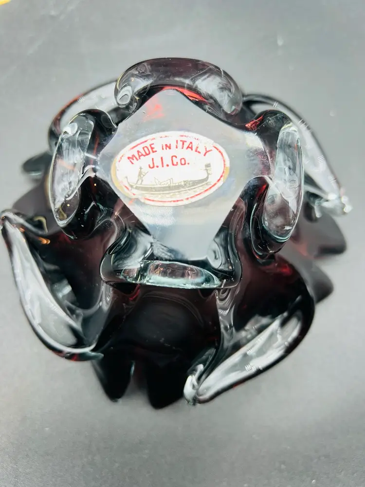 Murano J.I. Co. Italy Glass Ruffled Bowl Ashtray Dish Label Cranberry Clear