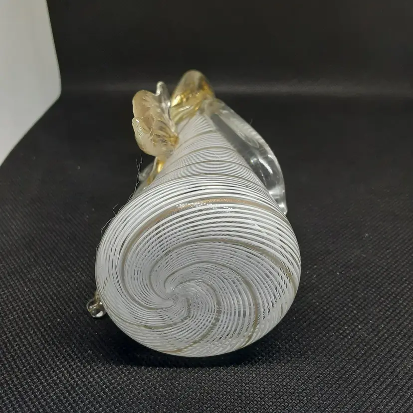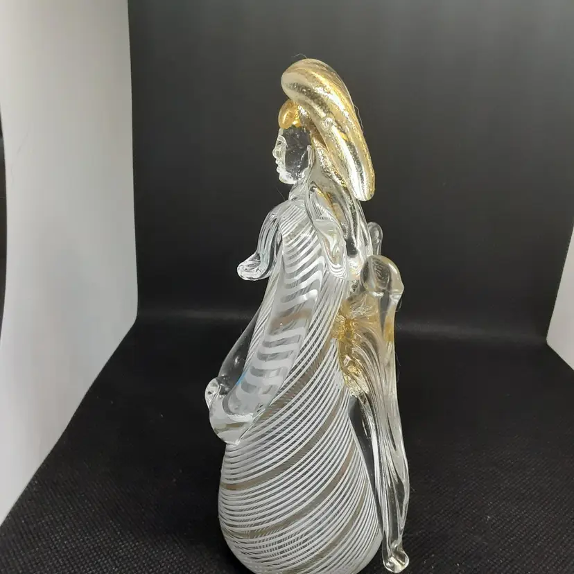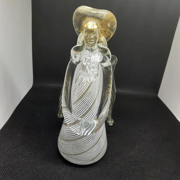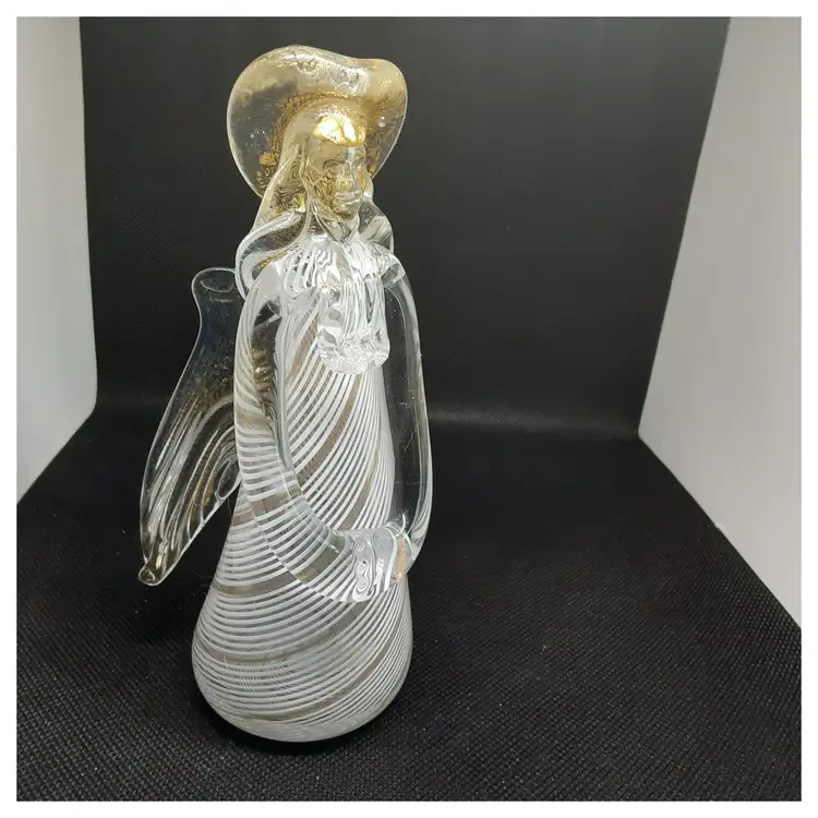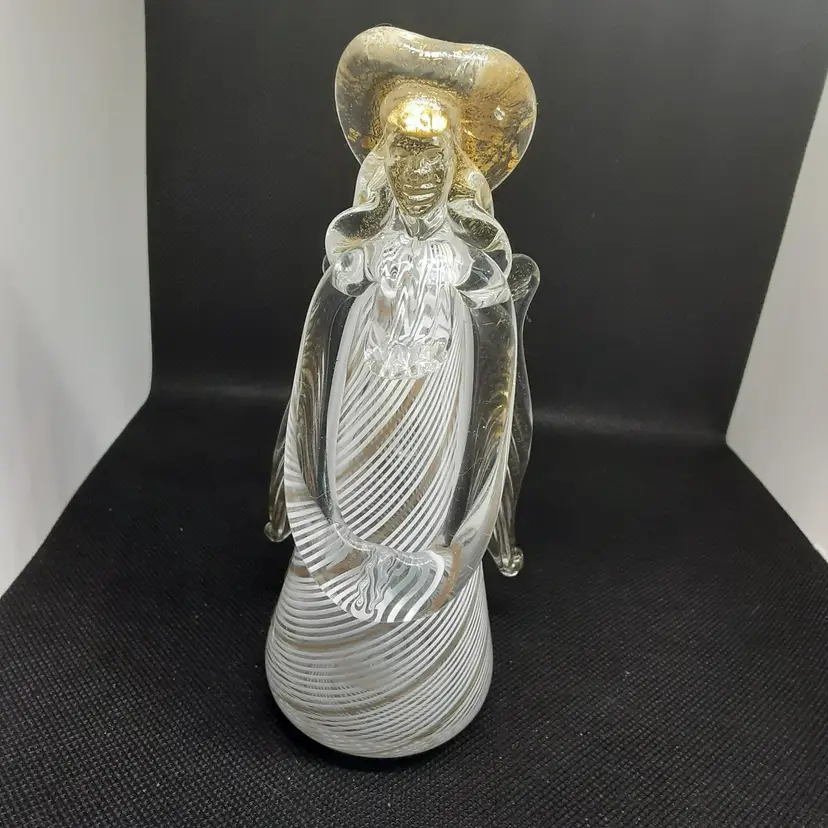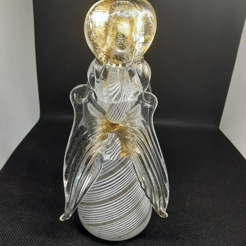 This Angel was made in La Fenice in Murano Italy. It is a very pretty Angel, she has a complete face, which is very hard to capture on camera. Her hands are clasped in front of her and she is looking down as if in prayer. Her halo and wings and hair have gold flecks in them. You can tell she was hand blown due to the pontel mark the bottom. She measures 6 inches tall and2 3/3 inches wide (at widest point ), and 2 inches deep.
