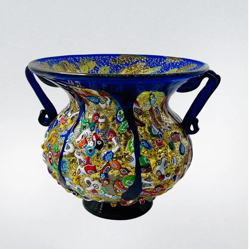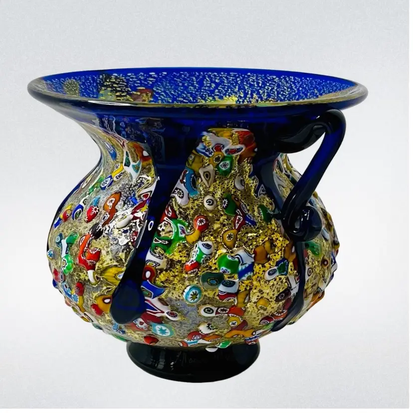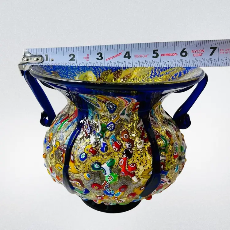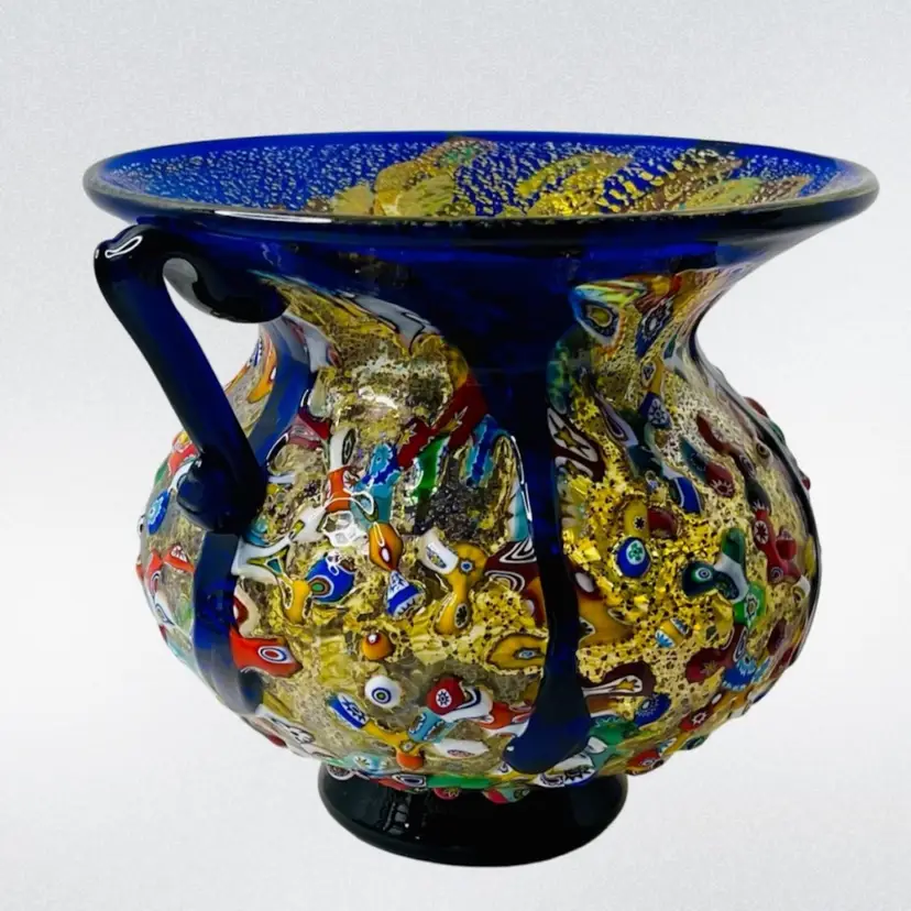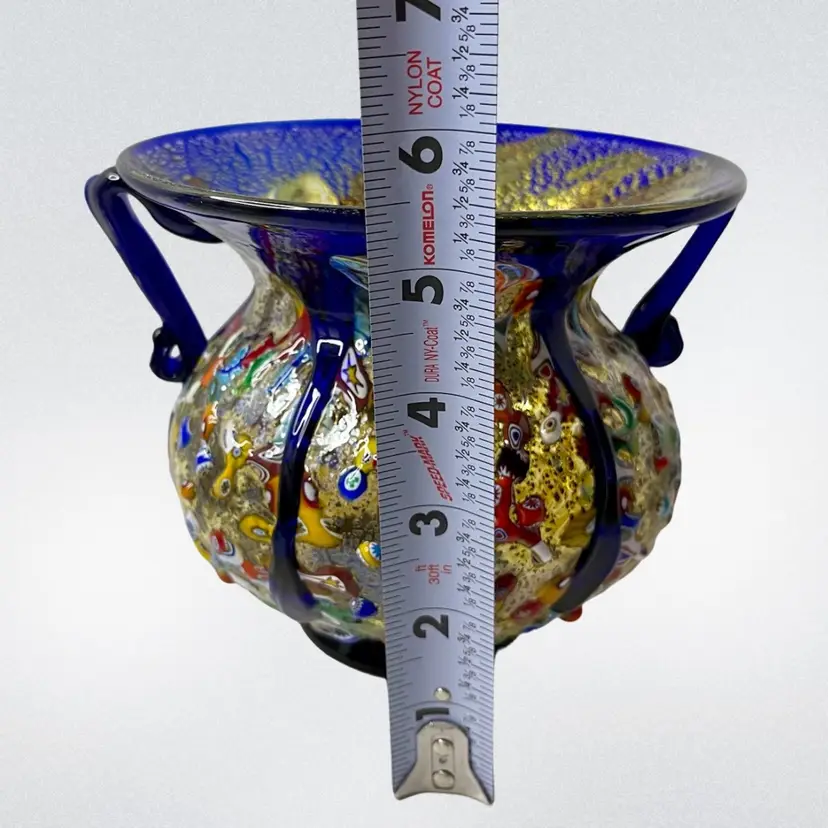 Stunning blown glass vase with colorful mosaic millefiori, avventurnia (gold) flecks, cobalt blue rim and handles. Condition: No condition issues noted. Measurements are approximate.. Please see photos for condition and measurements as they are part of the description. Item #1630 Thanks for looking!