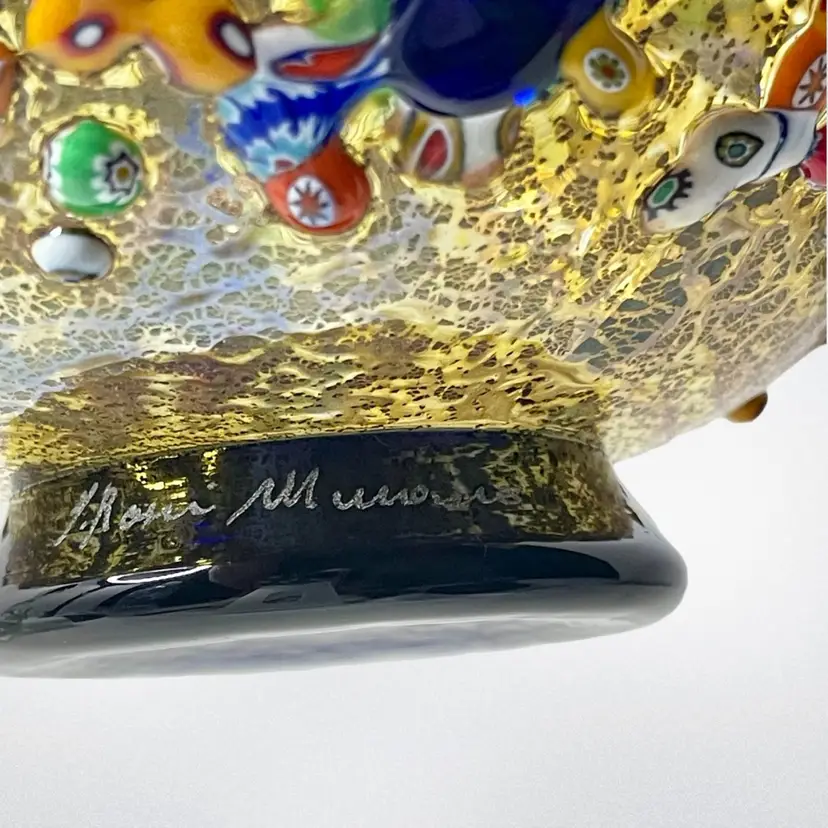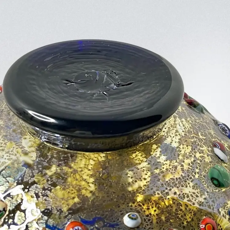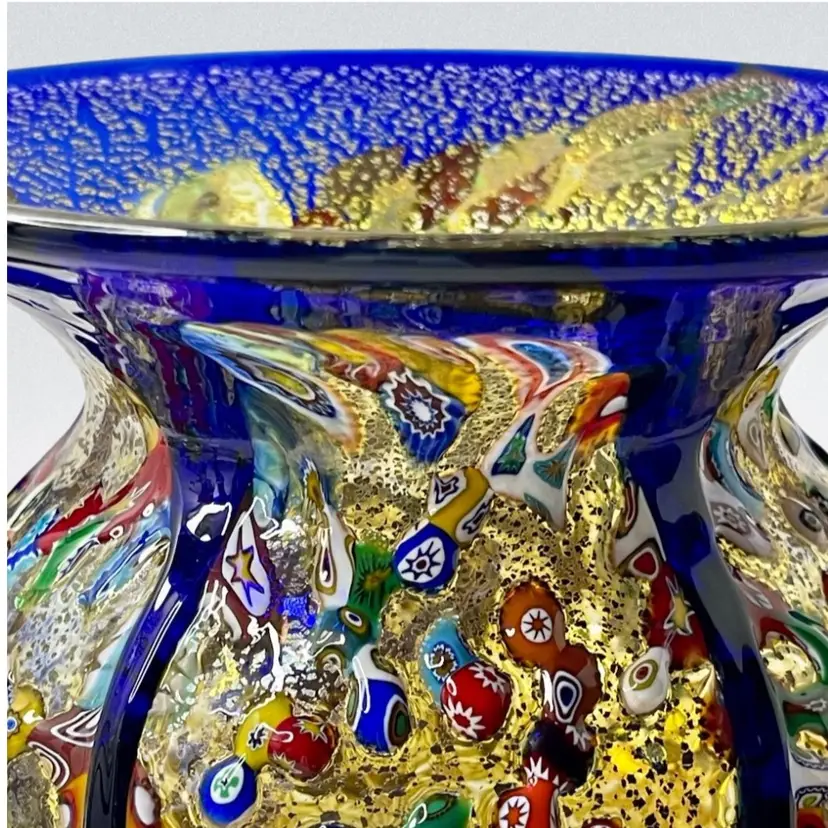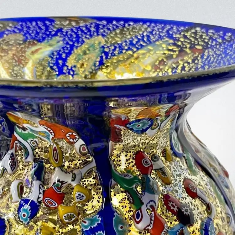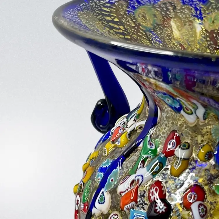 Stunning blown glass vase with colorful mosaic millefiori, avventurnia (gold) flecks, cobalt blue rim and handles. Condition: No condition issues noted. Measurements are approximate.. Please see photos for condition and measurements as they are part of the description. Item #1630 Thanks for looking!