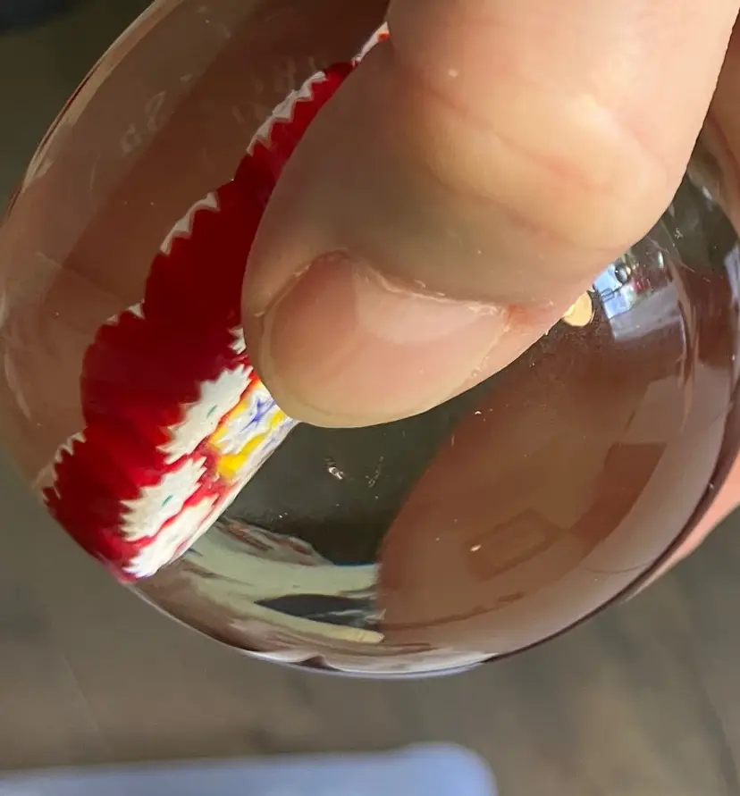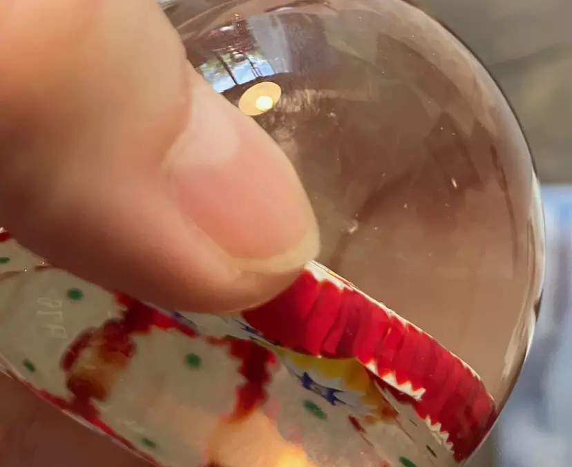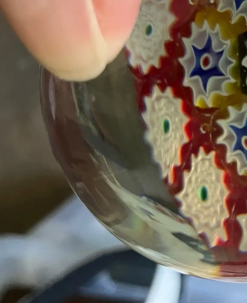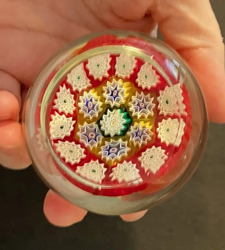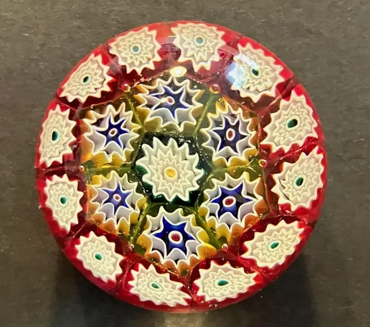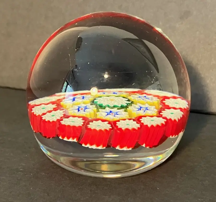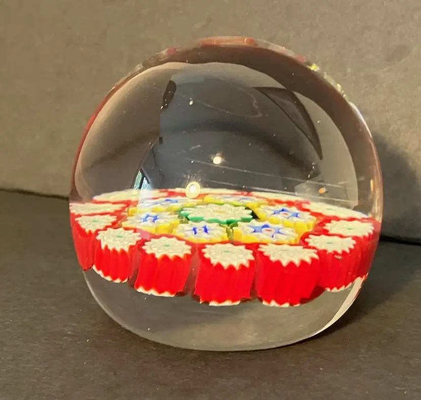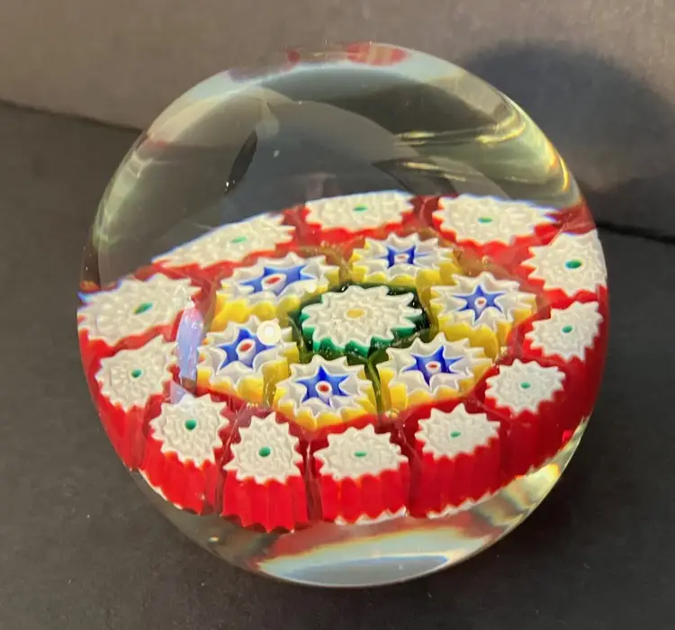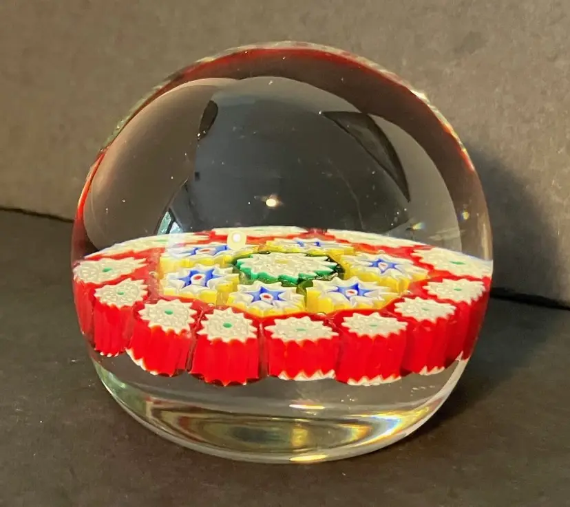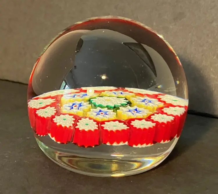 Smooth clear bottomed Millefiori paperweight with controlled bubbles - likely Murano. Star shaped and flower design in red, yellow and blue. It has 3 superficial nicks on the side of the glass (each of them is at the tip of my thumb in the last 3 pictures). They can be felt and seen when looking at it closely but not when it is sitting on a table. Measurements: 2 3/4" wide and 2 1/2" tall. Weighs almost 1 lb.