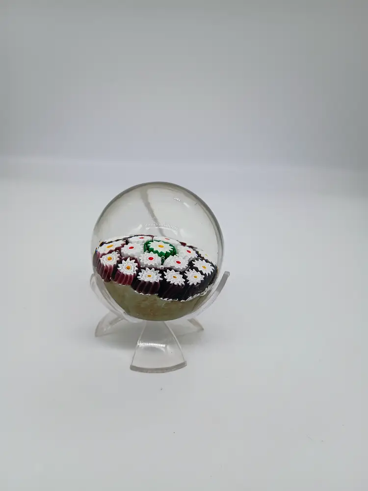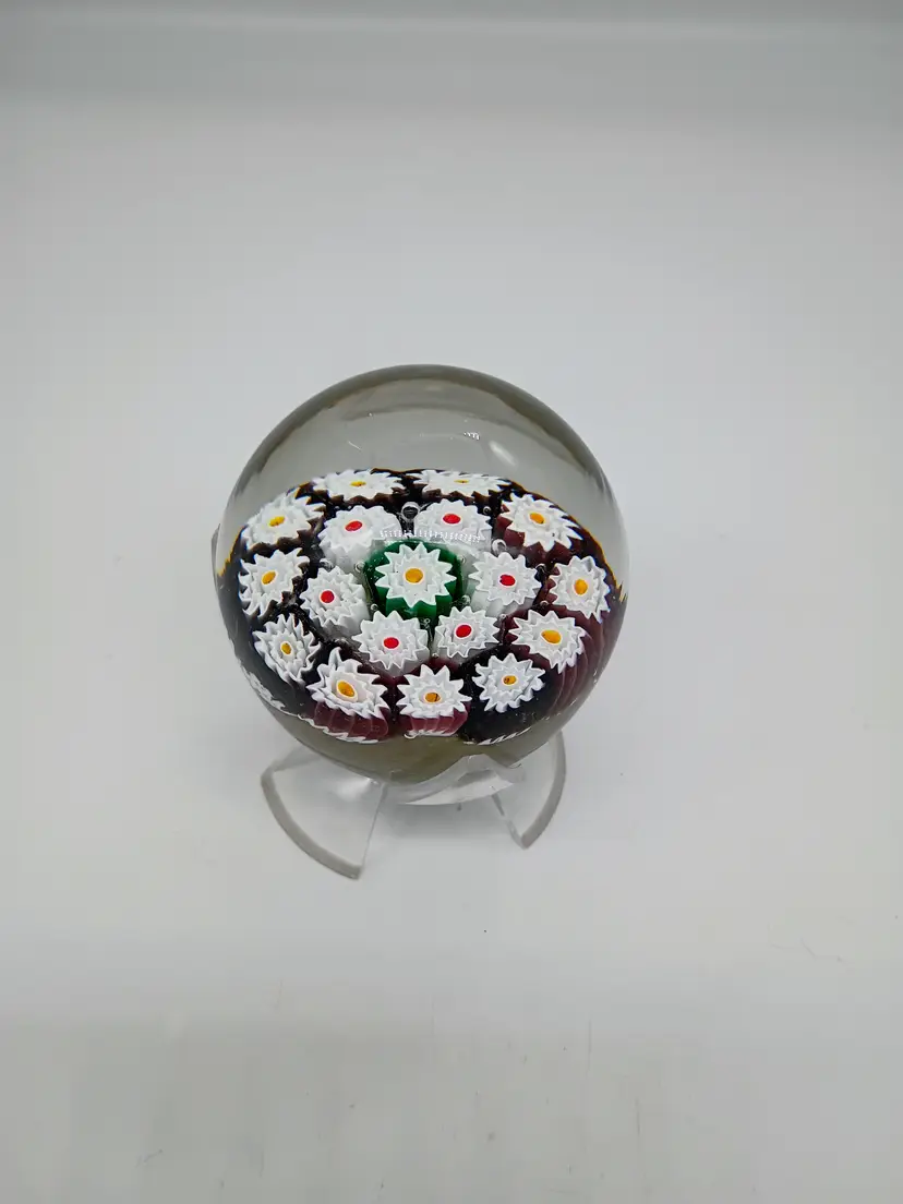 Murano Millefiori Paperweight White Flower Canes with Multiple color Center and Aventurine Base . Has original Label . This is 2.5 inches in diameter and tall. Smooth flat clear round polished base . Unsigned unless it's under the sticker. This is preowned, No chips cracks or flea bites, No fractures or bruises. Has original foil label9 Label is taped in place because it was falling off. Near Mint condition. Ships USPS domestically and USPS International Shipping globally