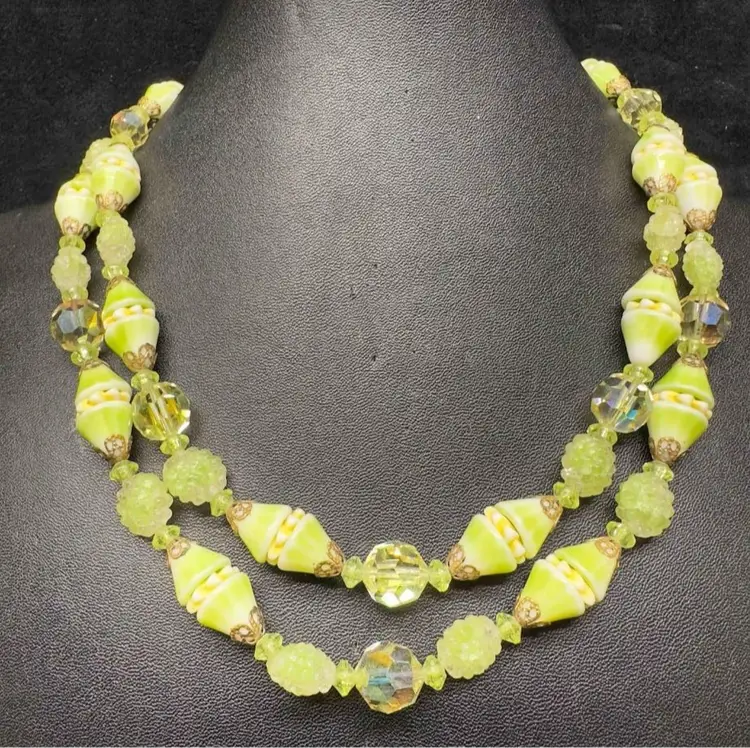 This exquisite Murano necklace features Venetian lamp work glass beads in light green and yellow hues, designed in a stunning double layer. Perfect for adding a touch of elegance to any outfit.