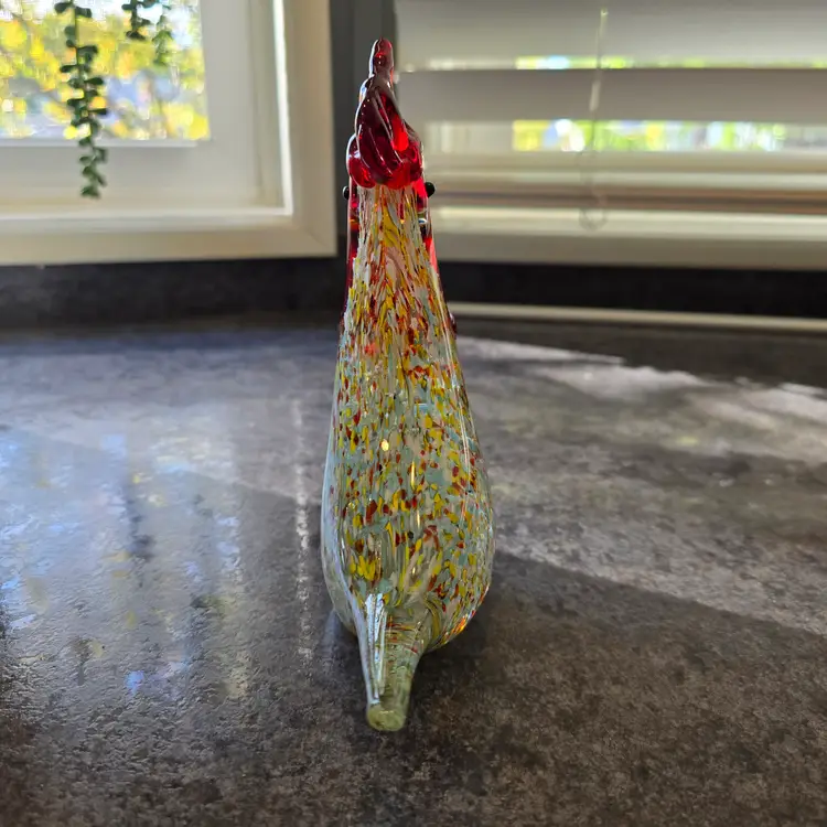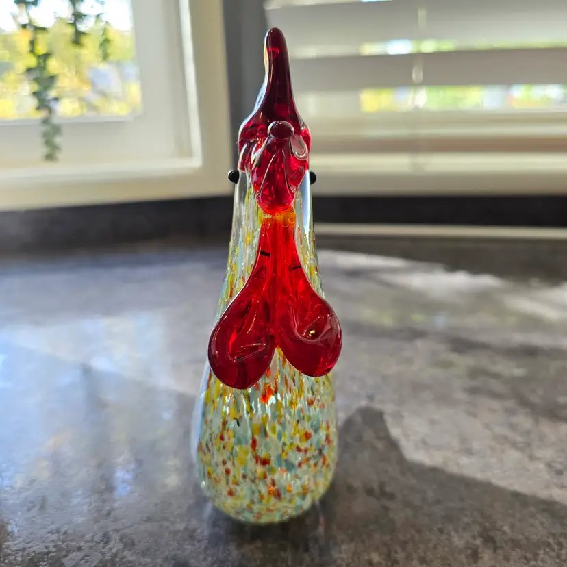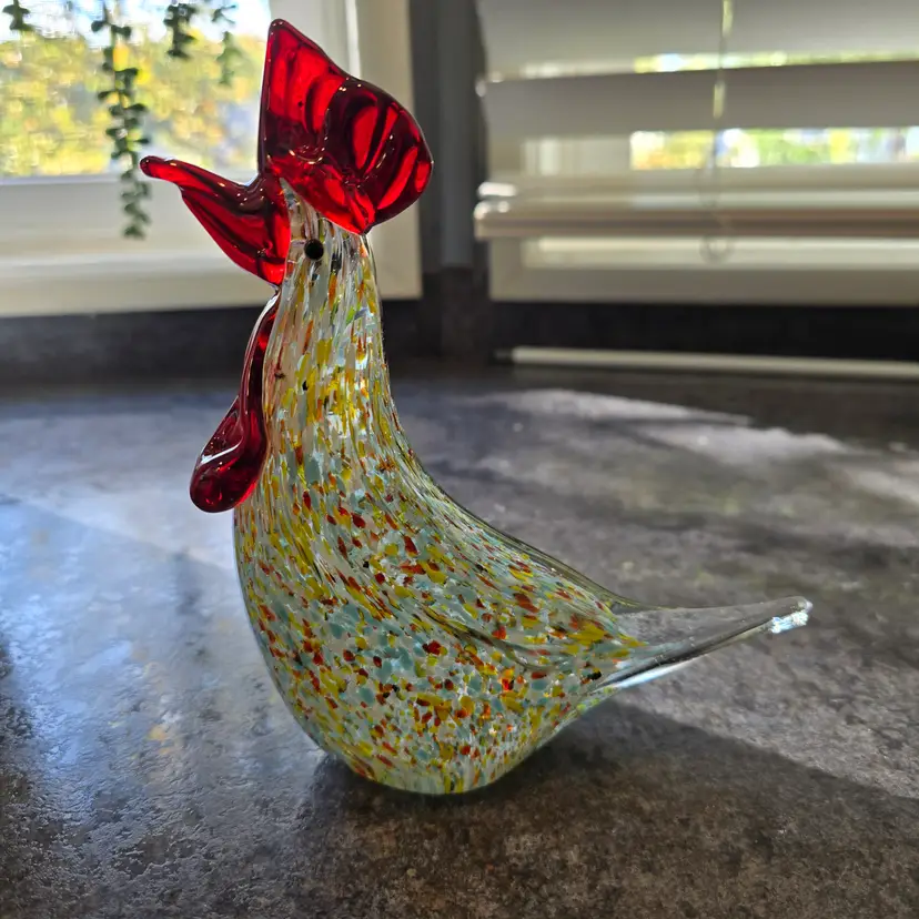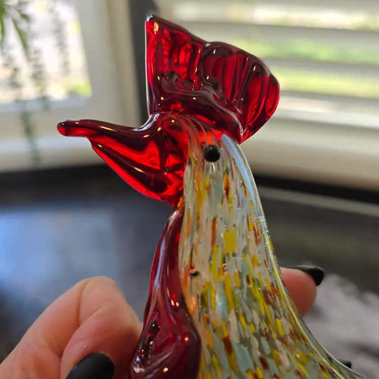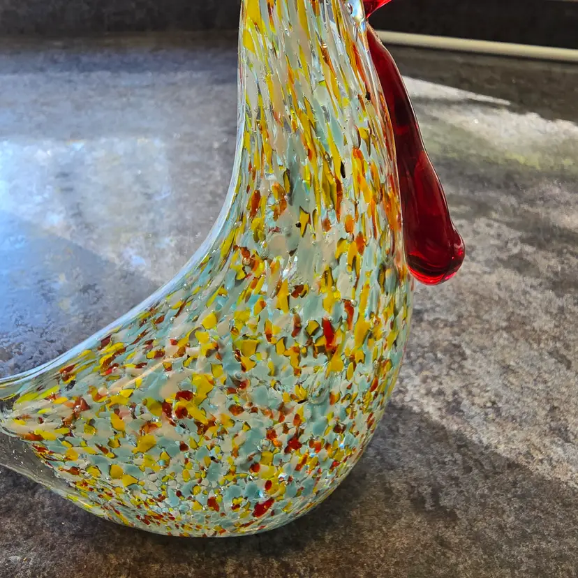 Murano STYLE Art Glass Millefiori Bird Figurine/Paperweight. The stickers have been removed so I cannot authenticate. I by no means am an expert on these, but it is beautiful and I know someone will find this listing who will love it as much as I do! No chips or cracks. This vintage Murano style art glass hand-blown rooster figurine stands at 6.5 inches tall, showcasing intricate multicolor patterns. Made from glass with a decorative rooster theme, this handmade piece is a unique and eye-catching addition to any collection. The detailed craftsmanship and art glass production style make this figurine a standout piece for those who appreciate artisanal works. A classic Murano style multi-color confetti glass figure, display this vintage hand-blown rooster proudly in your home. The decorative art glass rooster figurine would make a dramatic decor accent on a living room mantle or home office book shelf. 6.5" x 2" x 6.5"