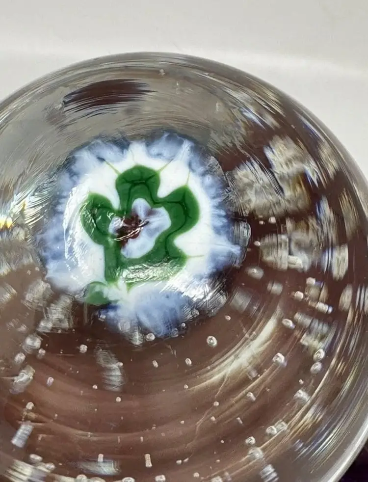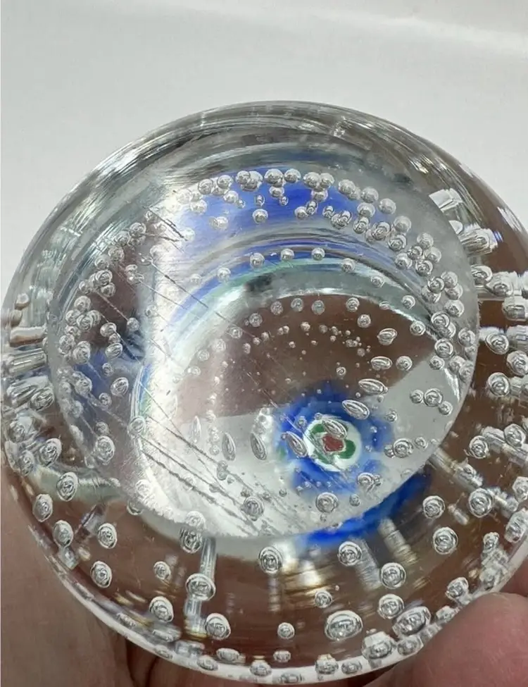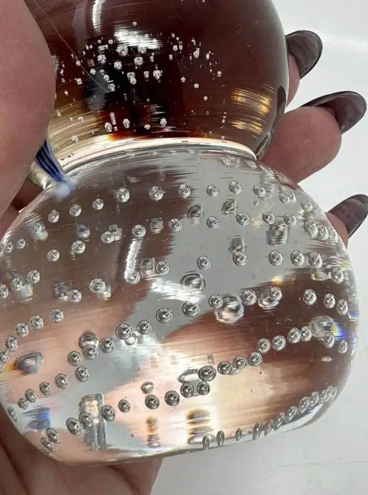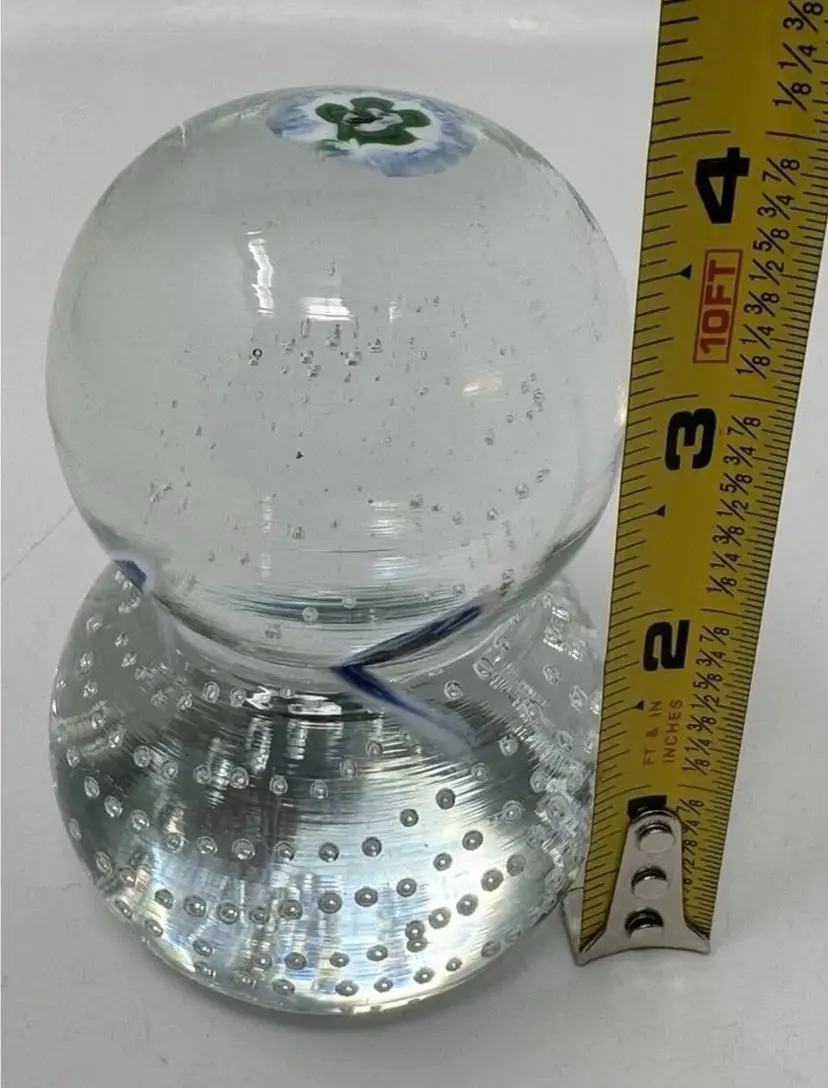 No chips cracks or repairs. Some scratches on the bottom due to age and use. See pictures for details. Smooth clear bottom, possibly Murano but not positive, that is why I indicated Murano Style. Very unusual with the double sphere.