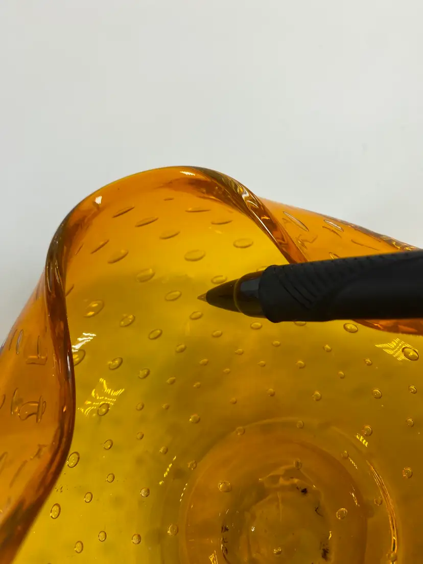 No chips or crack. There is a bumpy manufacture defect inside as noted in photos. It measures approx 2-5/8” height x 5-1/2” length x 4-7/8” width.