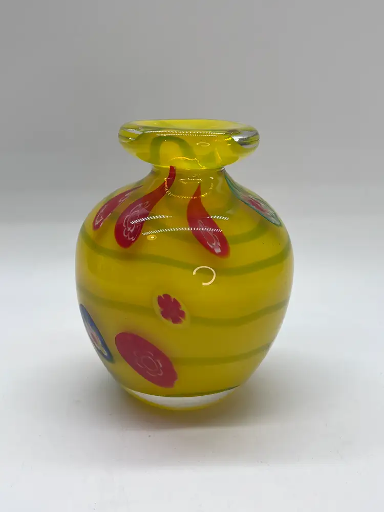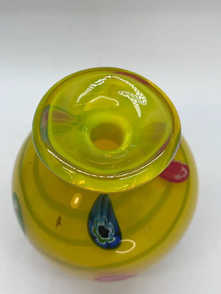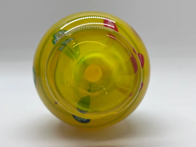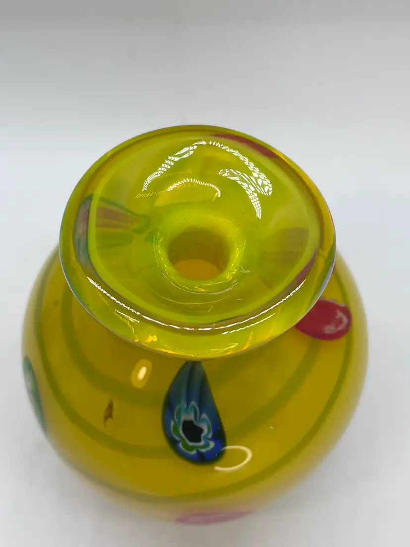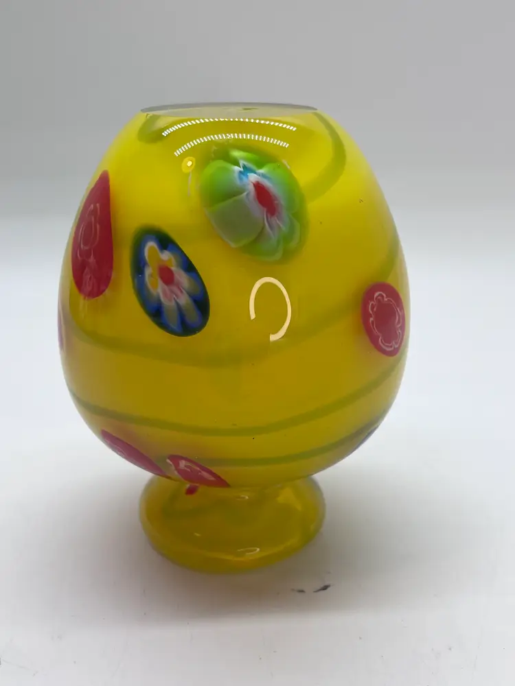 This bolt of sunshine yellow with splashes of millefiori dotted throughout will open your decor to spring! Hand blown, the clear exterior shell highlights the millefiori details, which in full daylight can actually be seen to cast a light shadow onto the yellow interior.