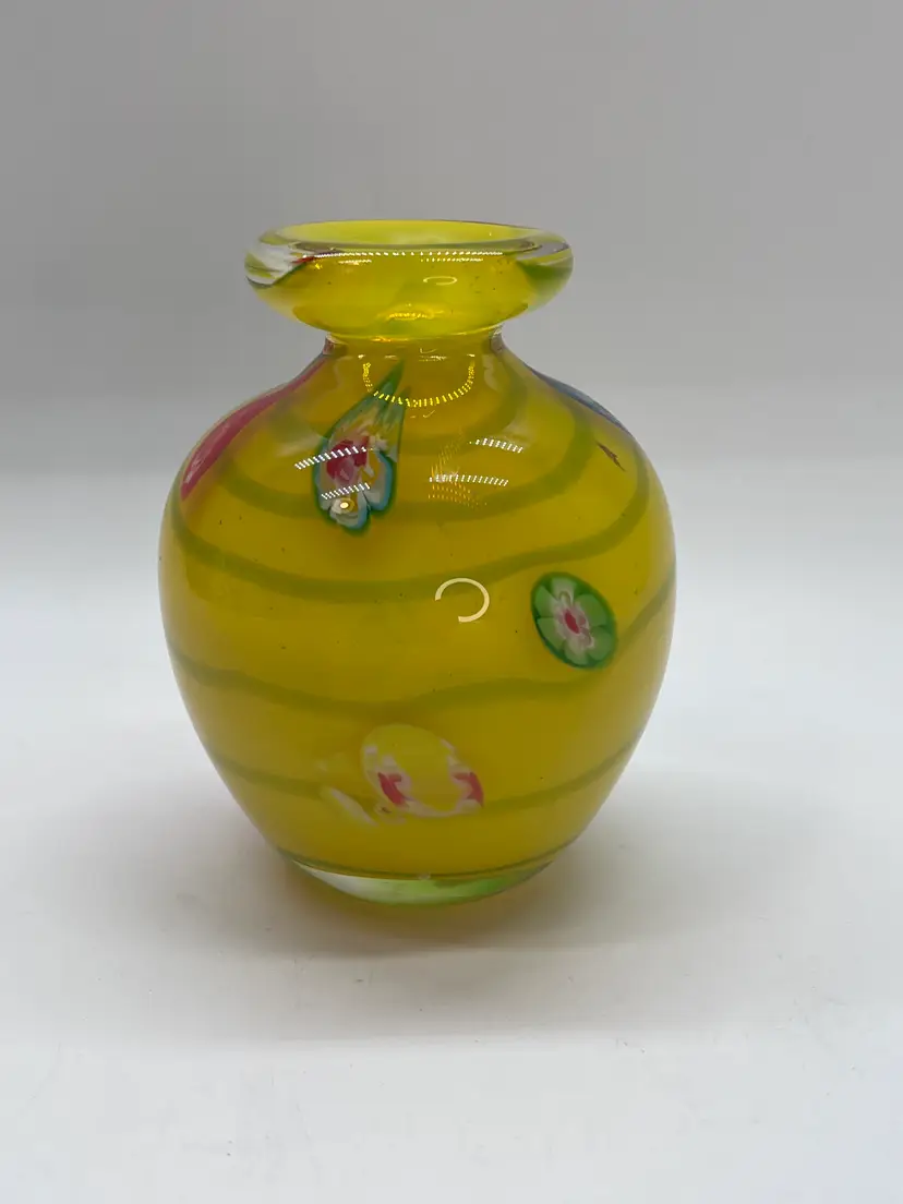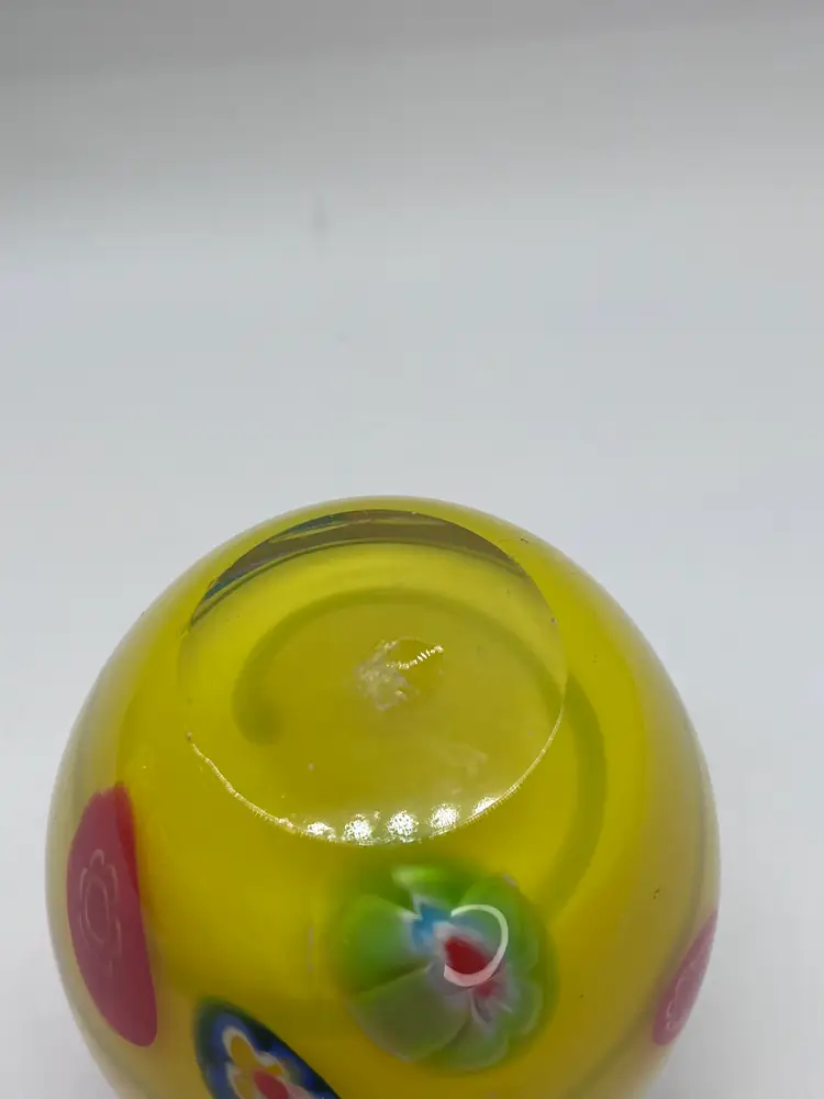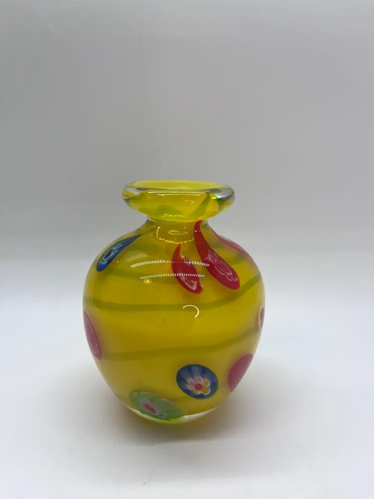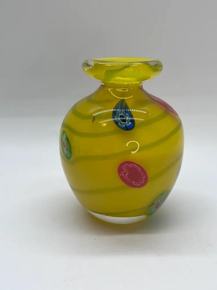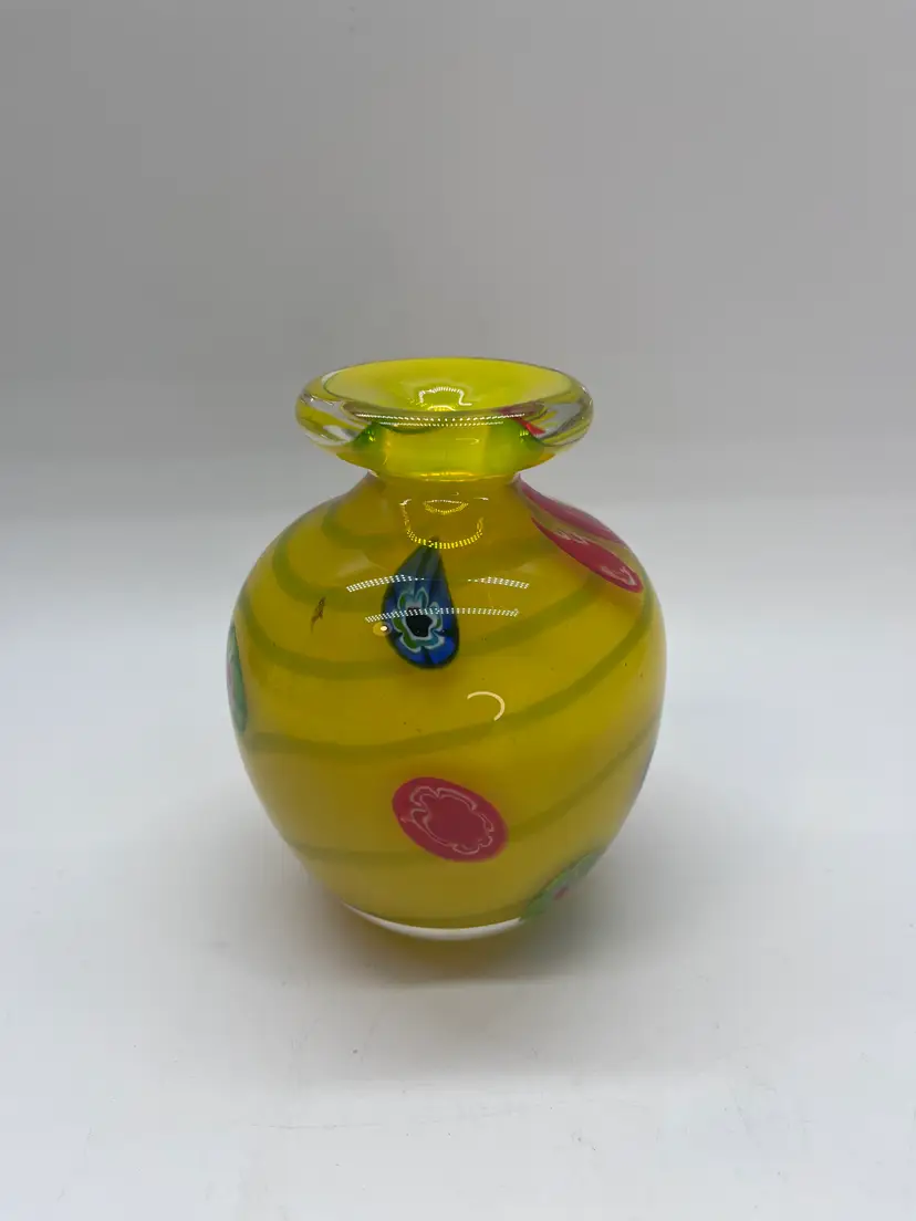 This bolt of sunshine yellow with splashes of millefiori dotted throughout will open your decor to spring! Hand blown, the clear exterior shell highlights the millefiori details, which in full daylight can actually be seen to cast a light shadow onto the yellow interior.