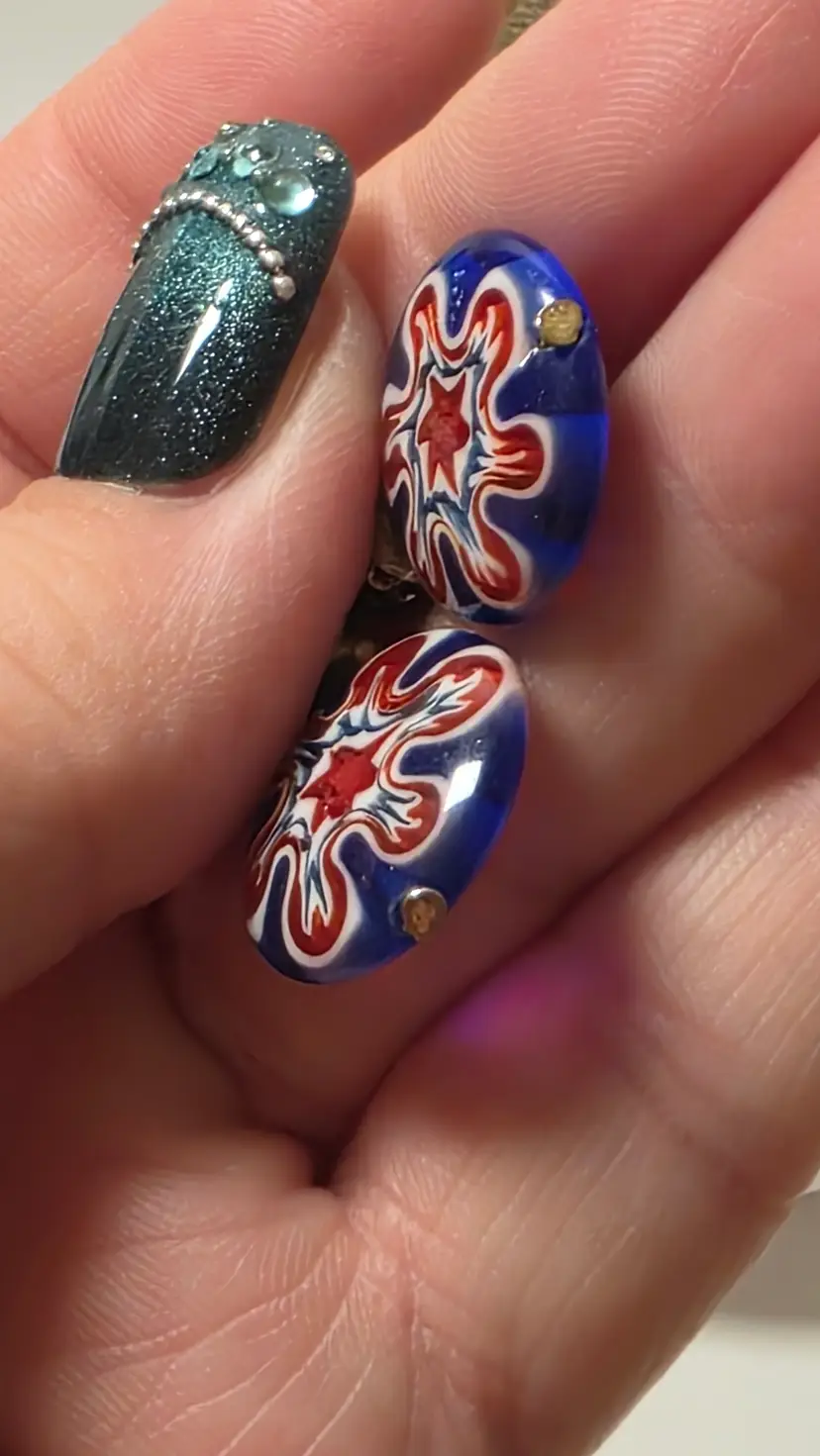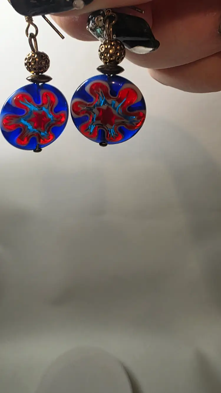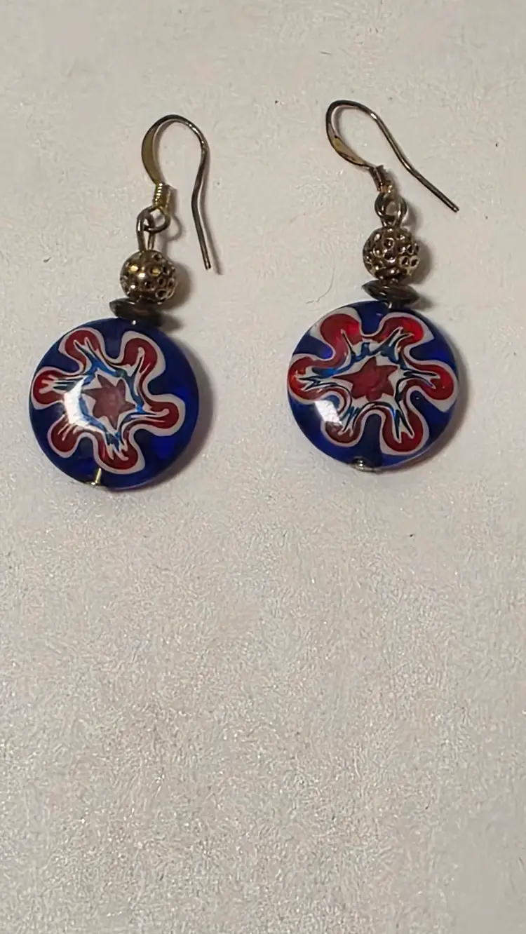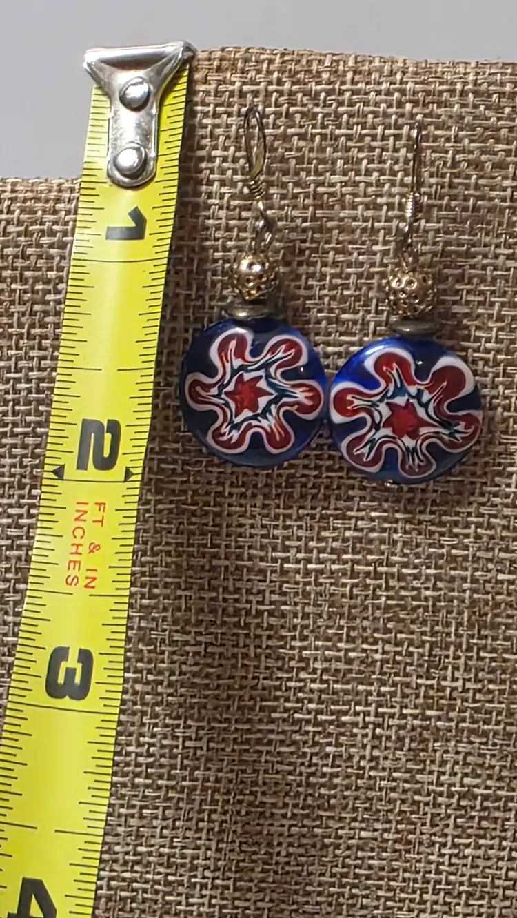 These Murano Style Millefiori dangle earrings feature a red, white, and blue floral design, making them a vibrant and eye-catching accessory for women. The round glass beads are handcrafted with intricate detailing, showcasing the artistry and craftsmanship of Murano glassmaking. The multicolor pattern adds a unique and festive touch to any outfit, perfect for special occasions or everyday wear. These earrings are sure to make a statement with their stylish dangle/drop design and beautiful glass material.