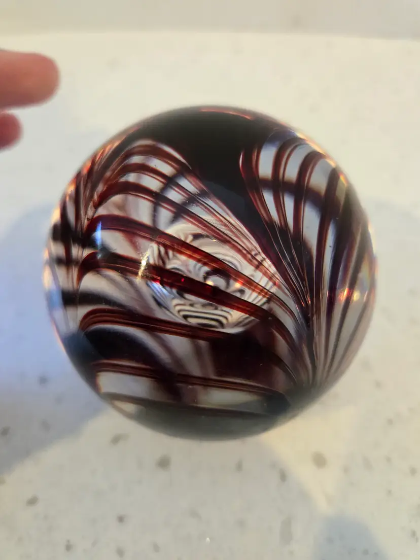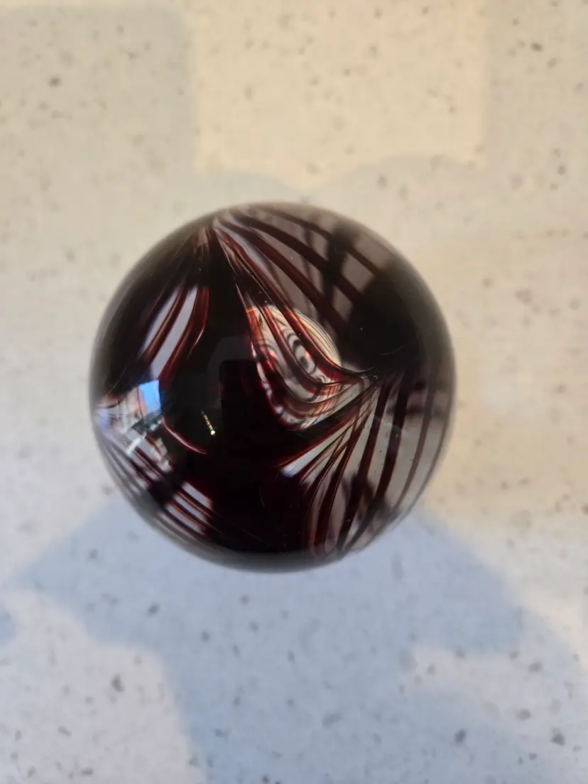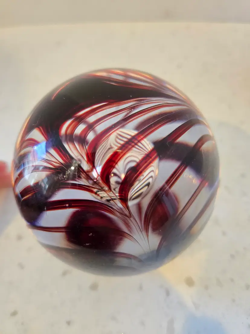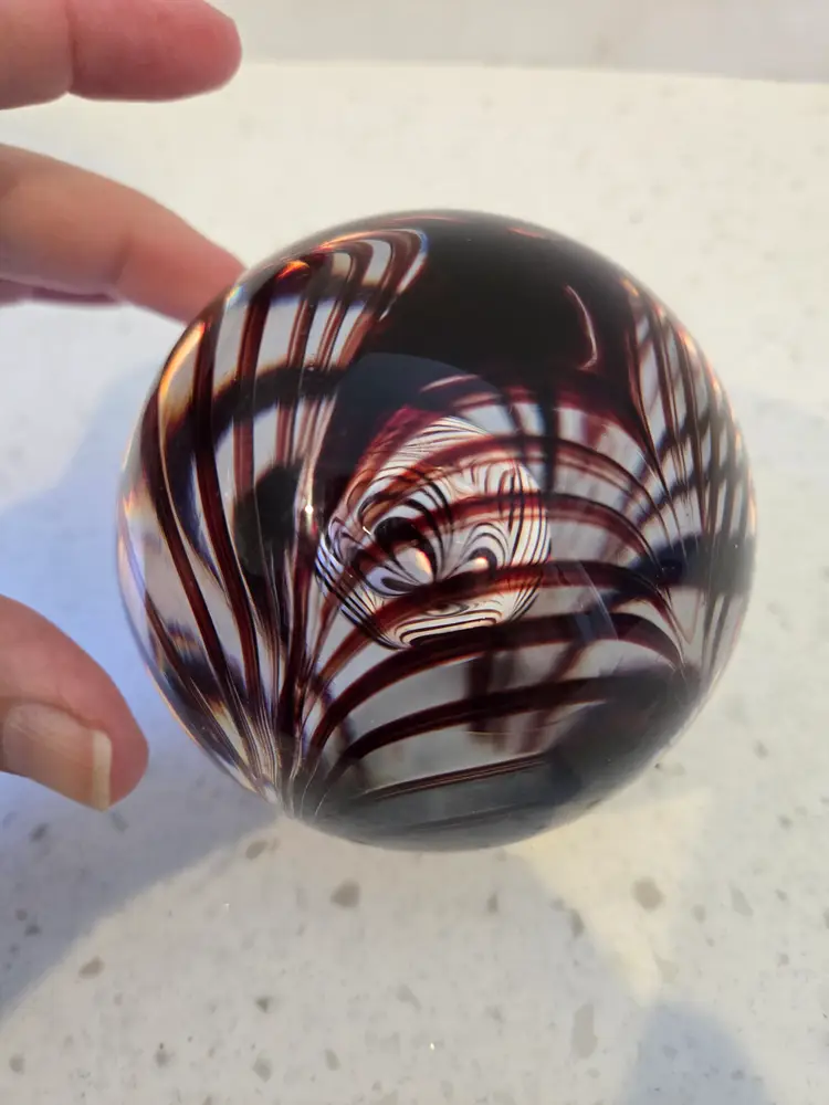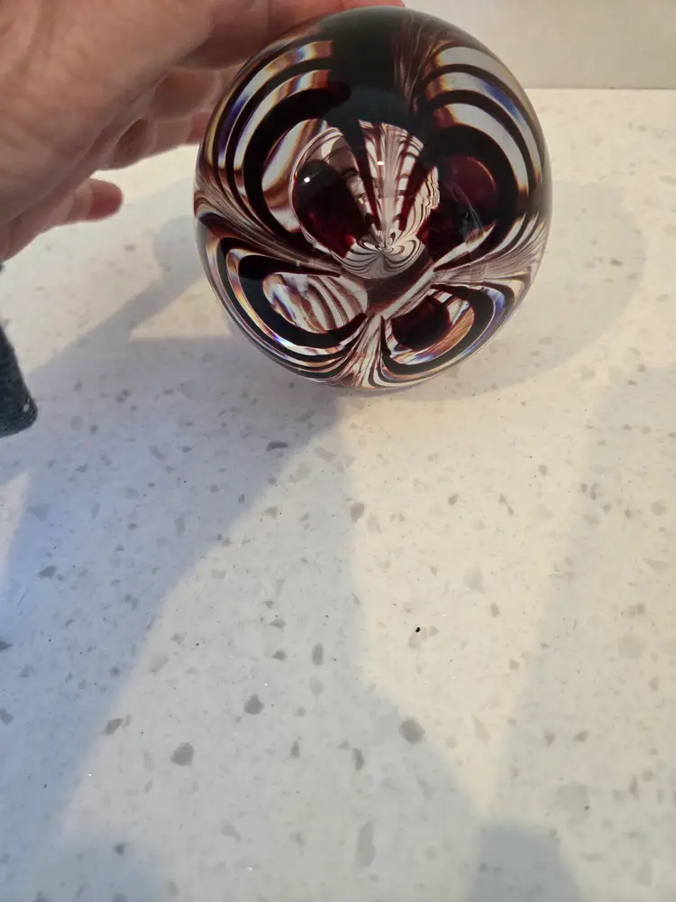 Made in the style on Murano, 3" diameter, 10" circumference, burgundy weathering, trapped bubble with burgundy flower like design no chips or cracks