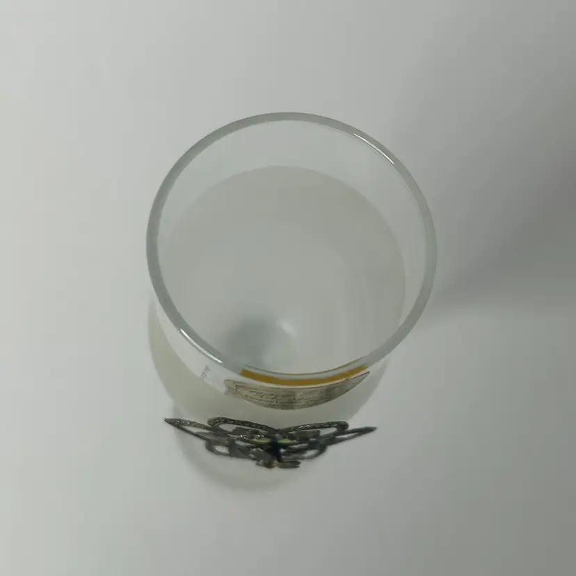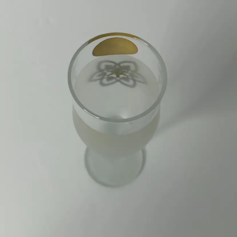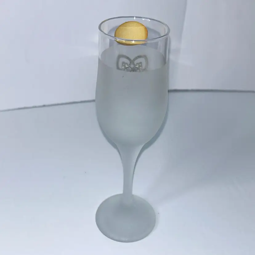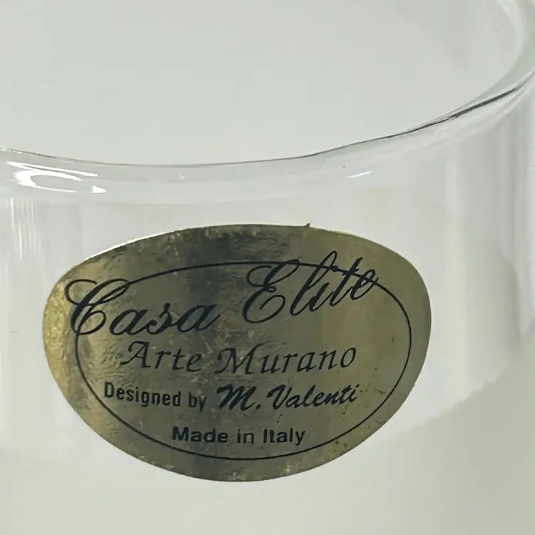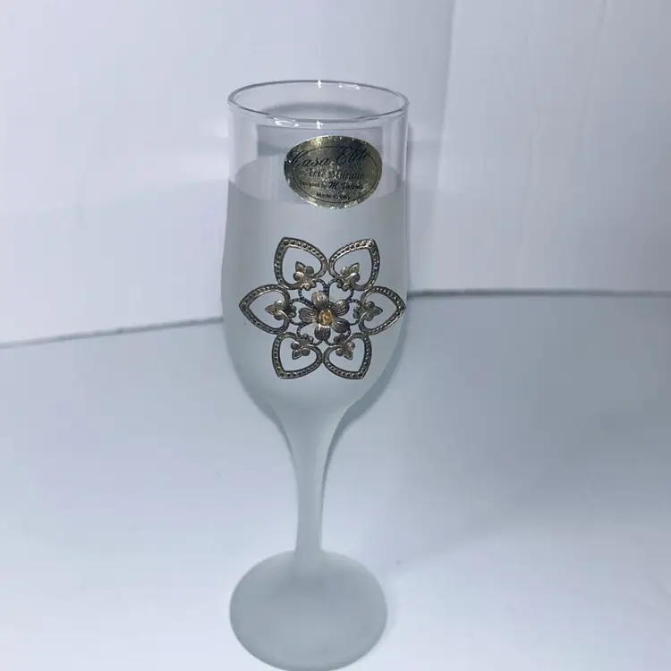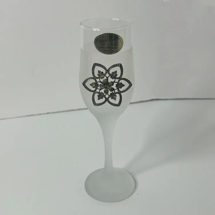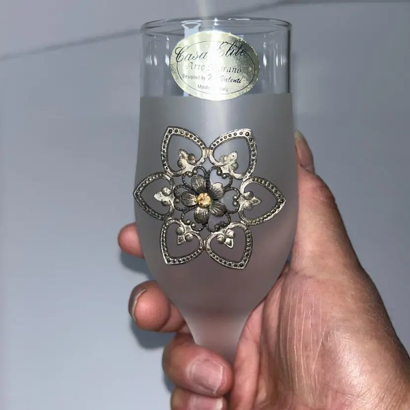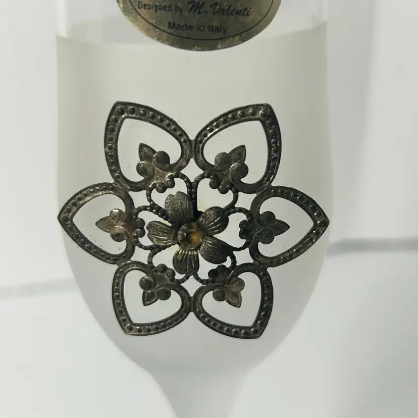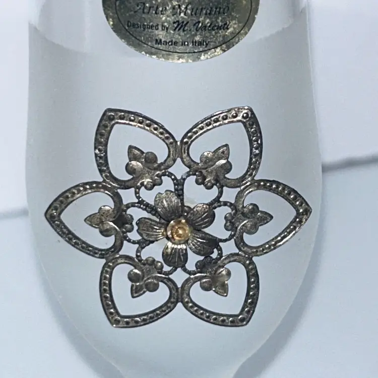 Vintage Murano Hand Blown Frosted Wine Glass Casa Elite Designed by M. Valenti Made in Italy Embellished with a metal flower 5 oz capacity Approximately 8” high; base is 2-5/8” Diameter.