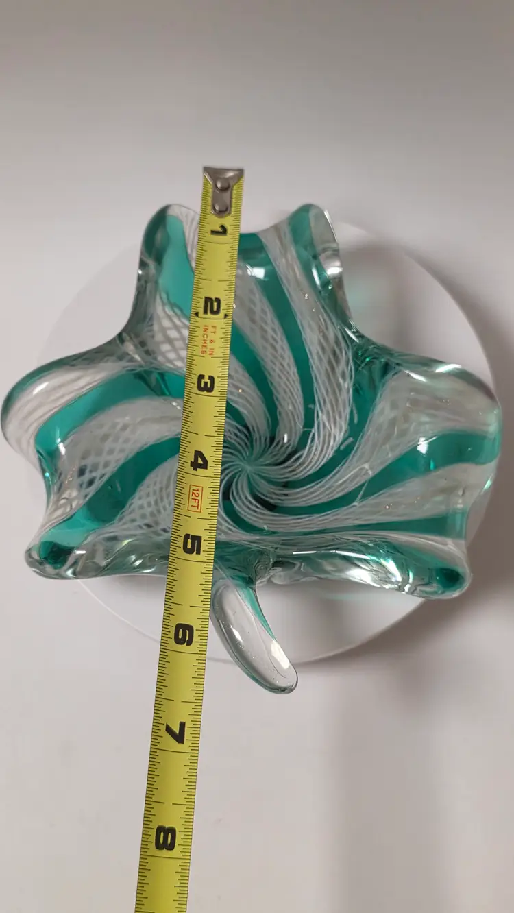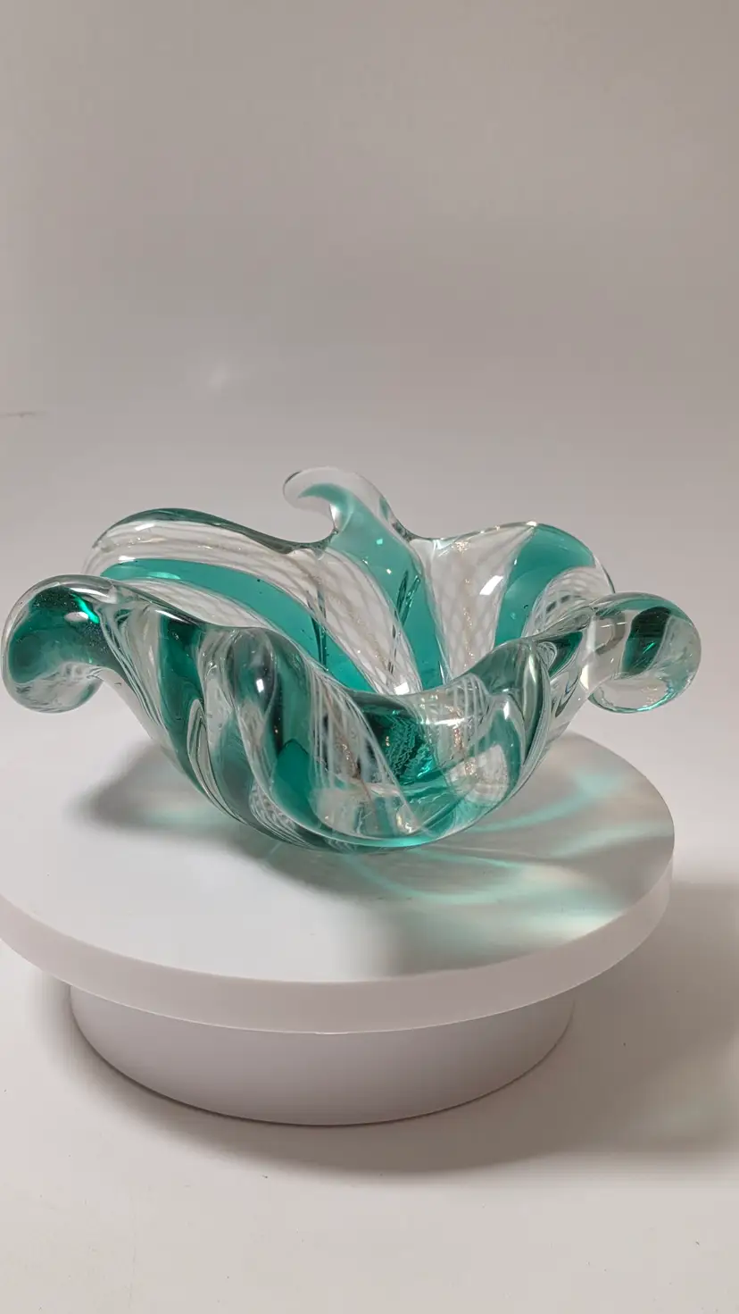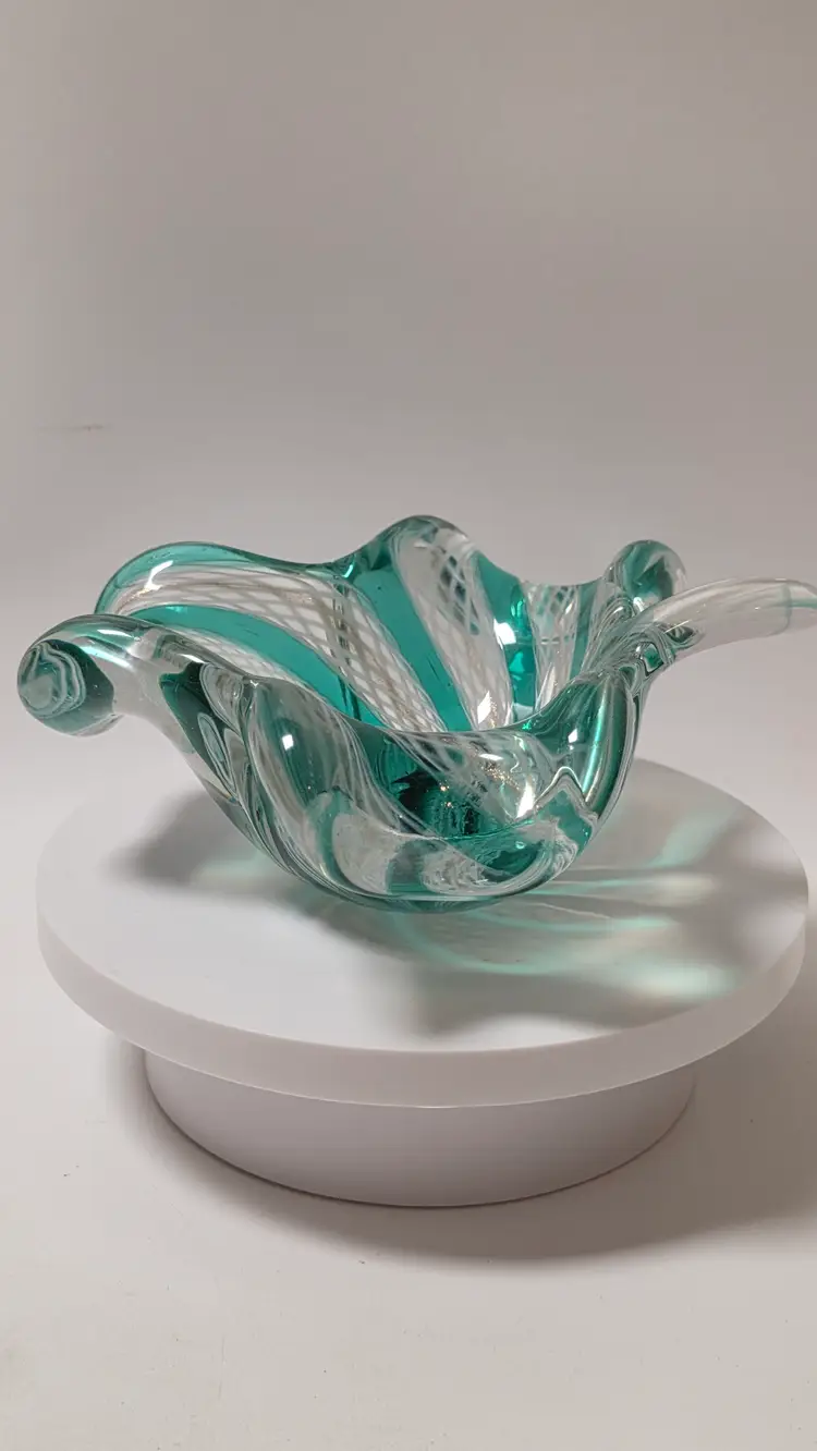 The Murano Zanfirico Latticino 3-Leaf Clover Dish Bowl features intricate green and white ribbons of glass that form a beautiful and unique design. This bowl showcases the craftsmanship and artistry of traditional Murano glassmaking. The latticino technique used in this piece creates a delicate and elegant pattern, making it a stunning addition to any glassware collection.