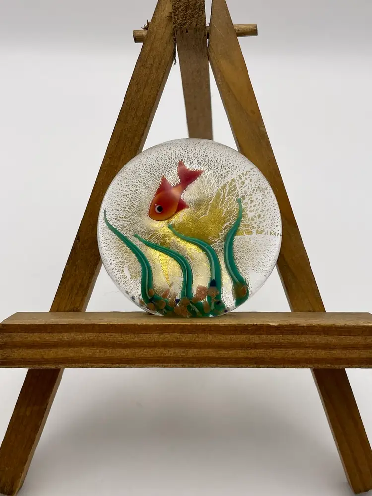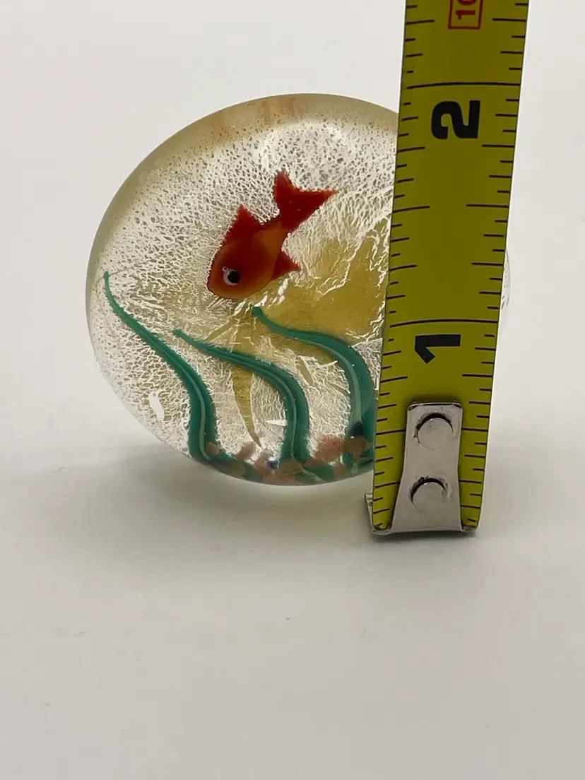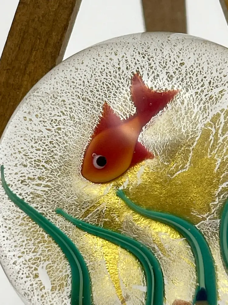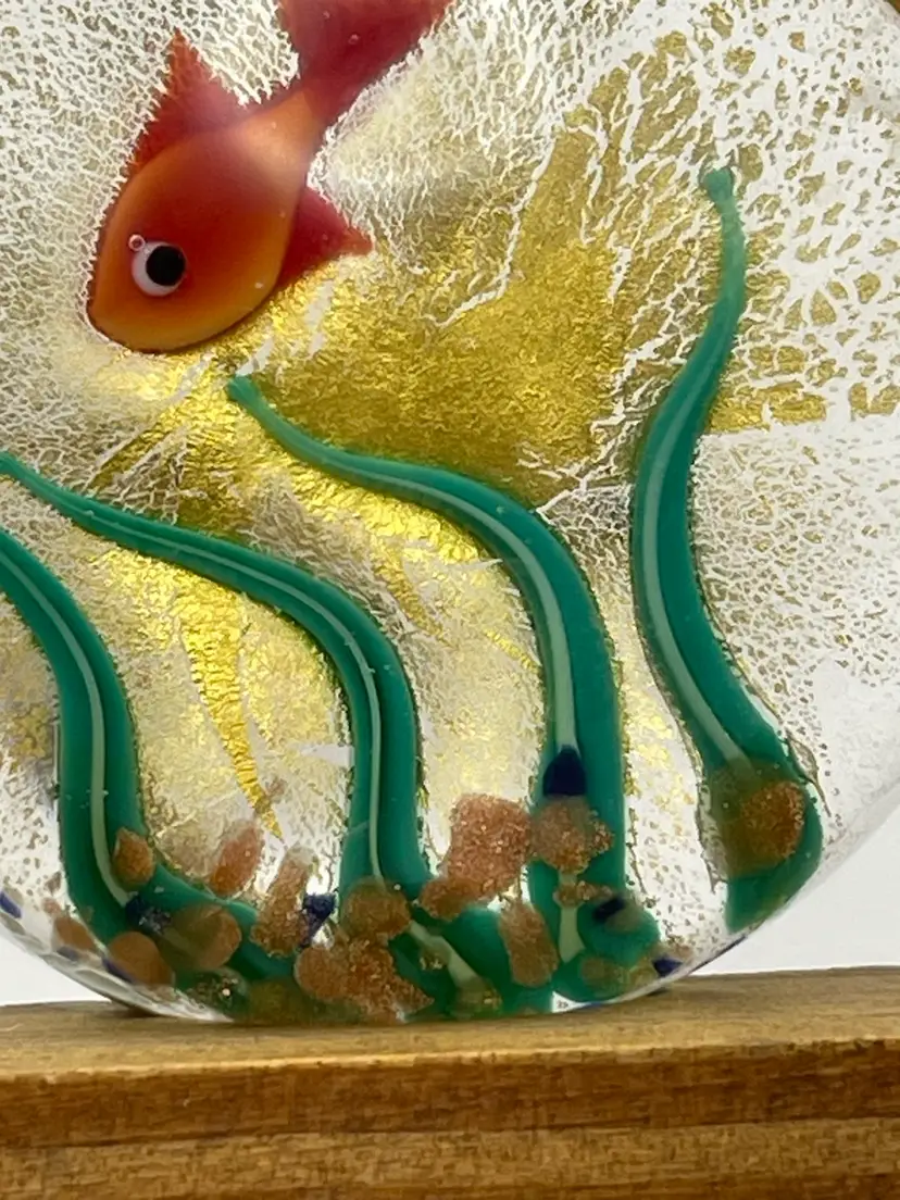 MuranoVitrum, small glass aquarium with Goldfish, gold fleck, green sea grass, 1.75” in diameter