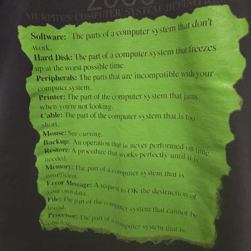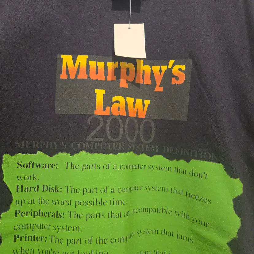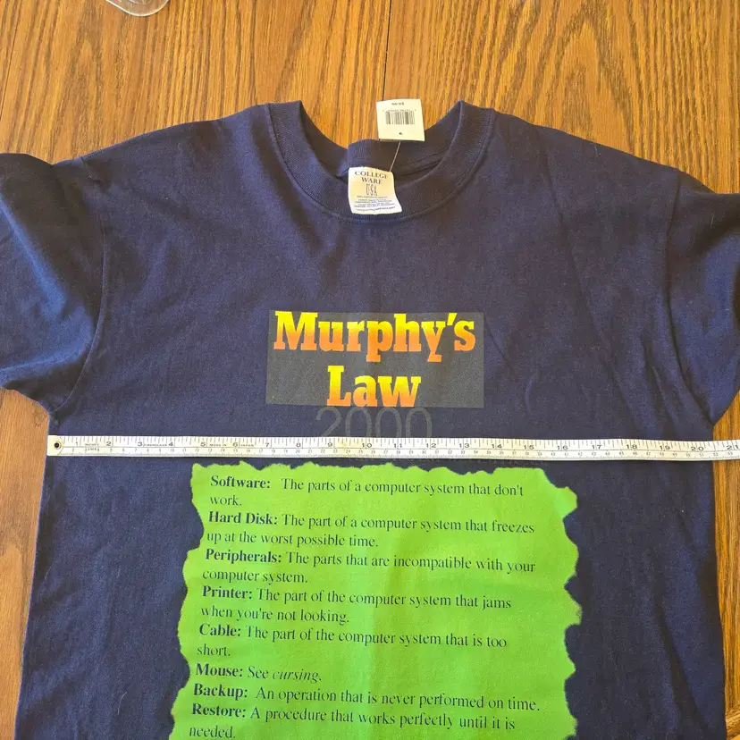 I purchased this shirt shortly before the year 2000 when there were warnings that all computers would fail on New Year's Eve 1999-2000. I was working in tech at the time and thought it would be a fun shirt. However, I never wore it and it's been packed away since. I'm hoping someone will love this historical memorabilia! Please see the "Murphy's Law 2000" Computer System Definitions in the pictures!