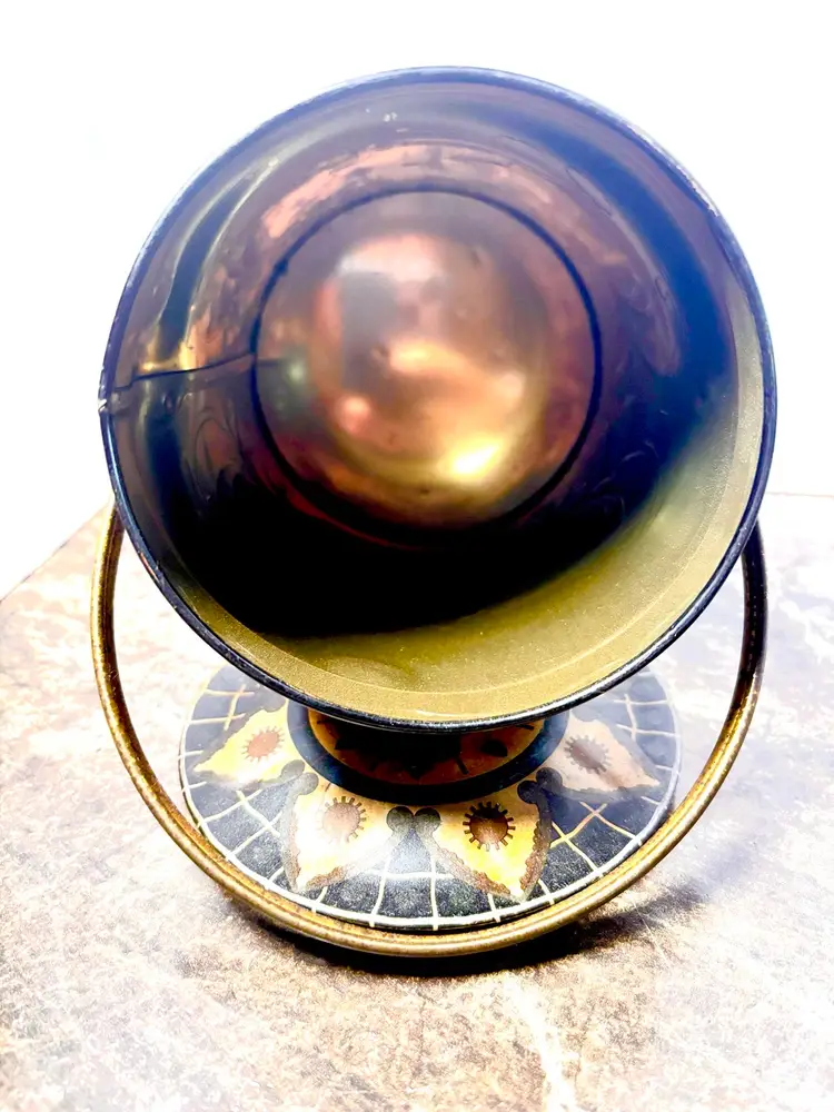 Pretty vintage candy tin made in England has a beautiful floral design on the front & back, and around the top & bottom. The lid has a sun shaped design. There is some tarnish on handle, a dent towards top of the canister and lovely patina on the design, which is reflected in the price. A lil soap and water would serve to enhance this lovely tin. See photos for condition. 6” x 4.5”