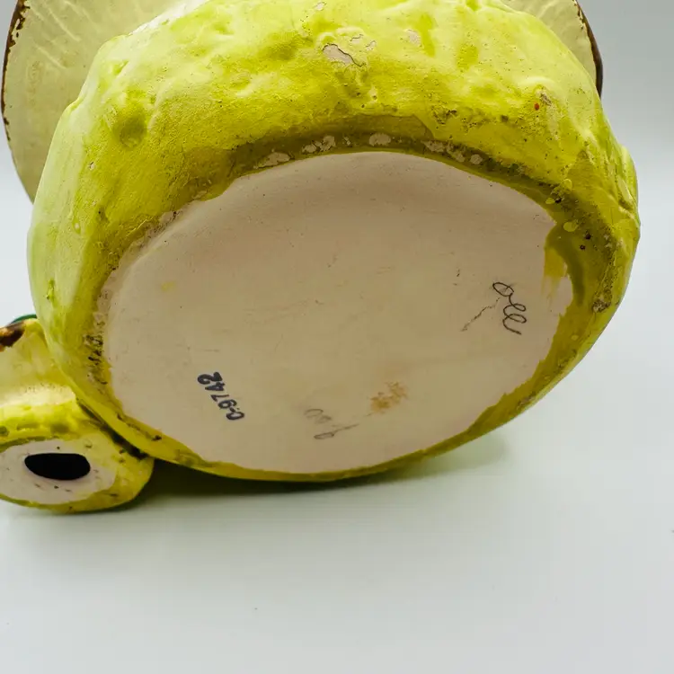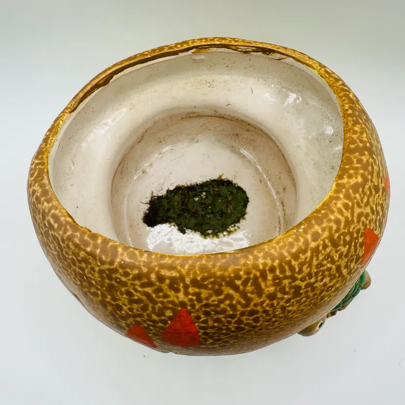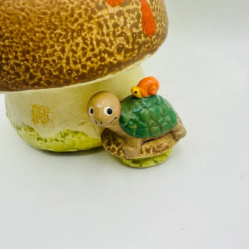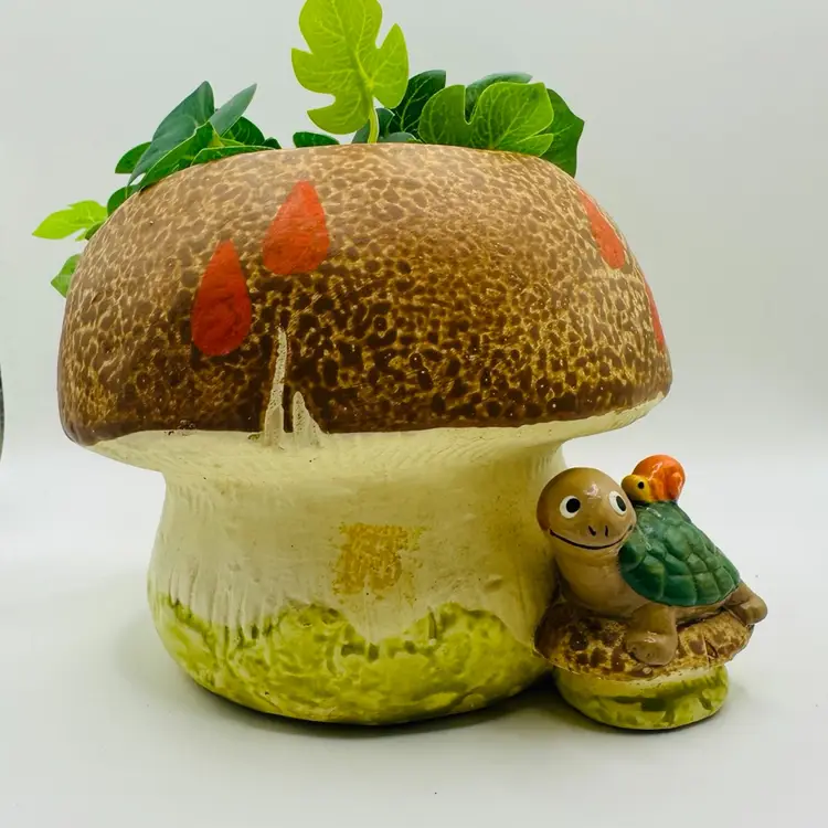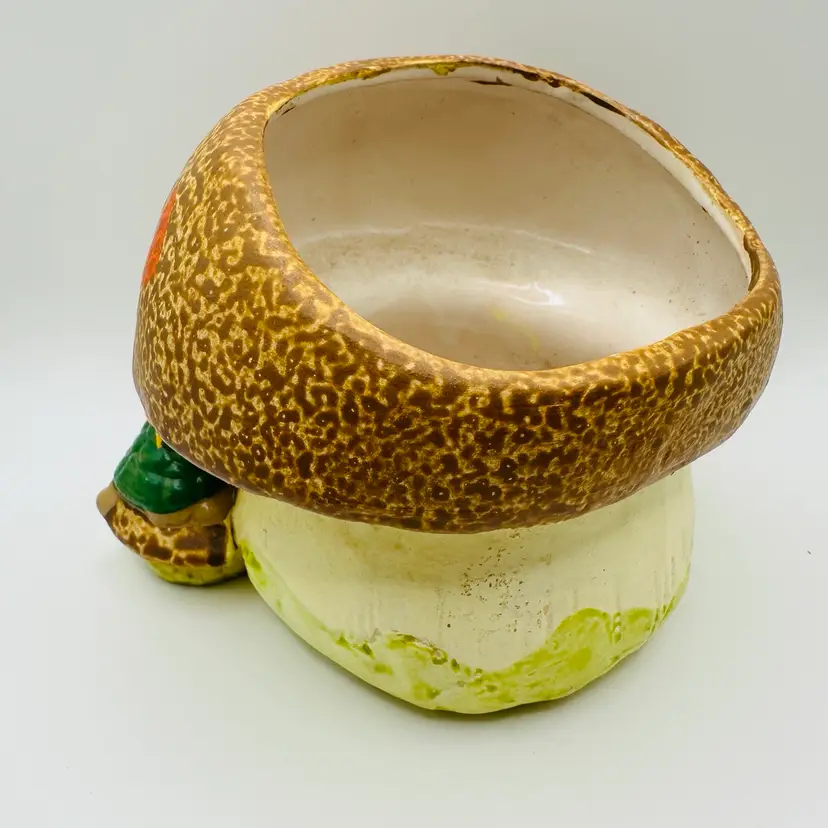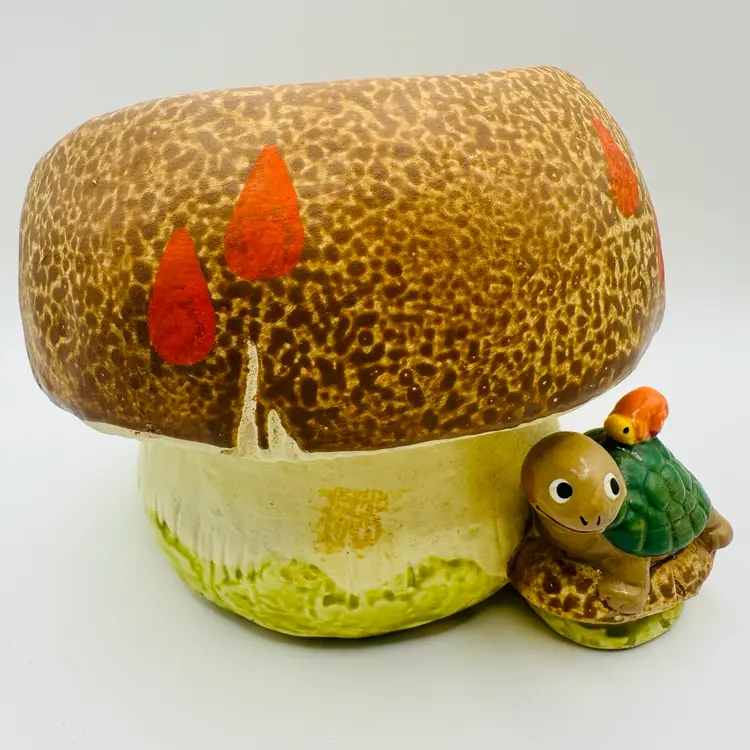 Cute ceramic mushroom planter with turtle! Measures about 6” x 4” Good condition! There is some leftover floral foam stuck to the interior.