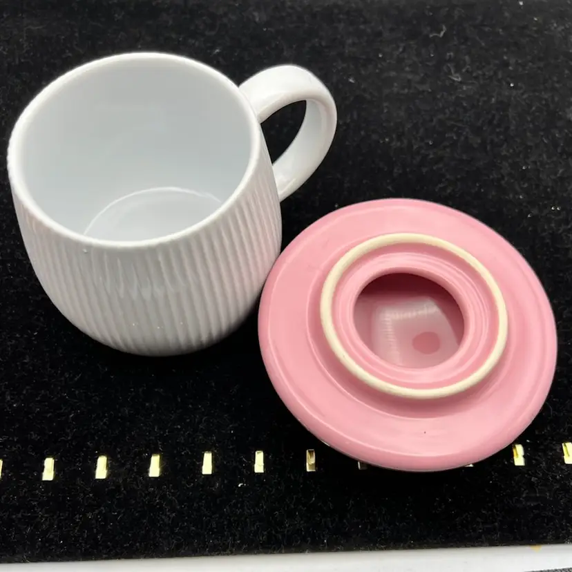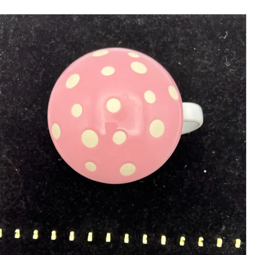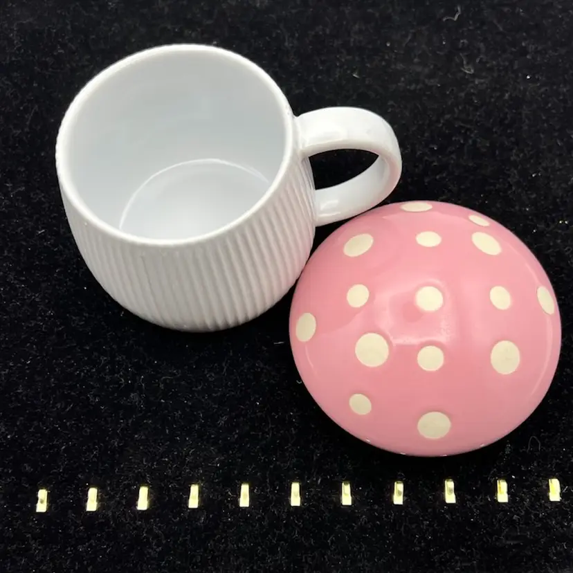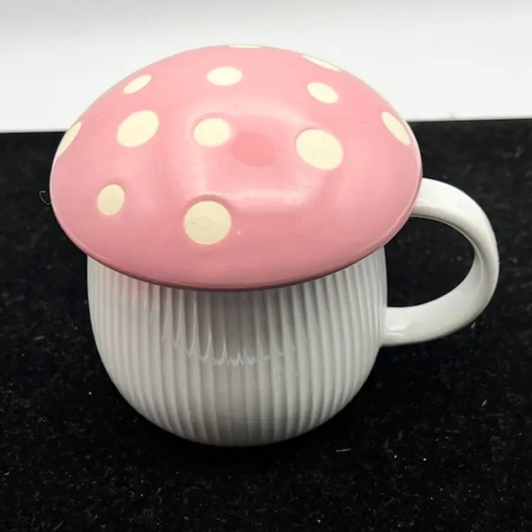Pink with polka dots mushroom mug. Enjoy your coffee or tea while keeping it warm and the bugs out in the spring and summer.