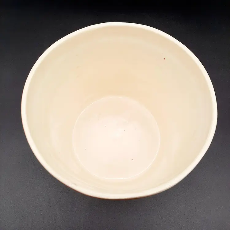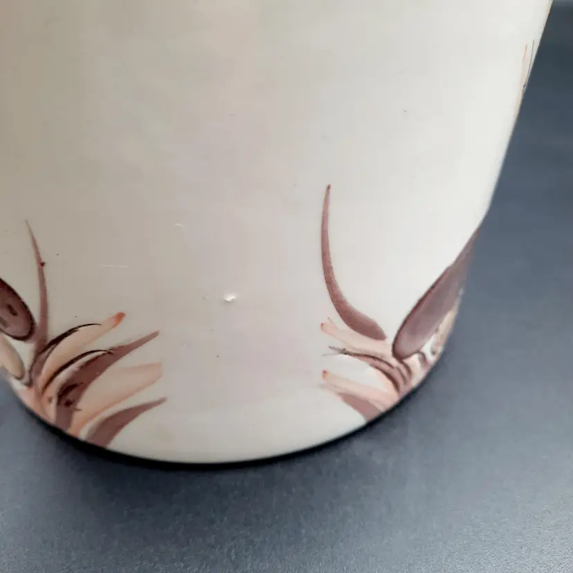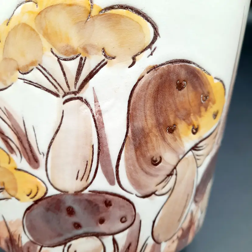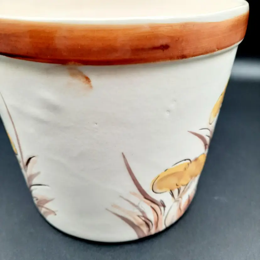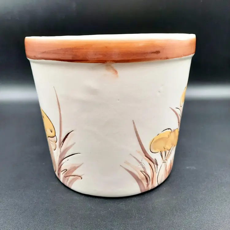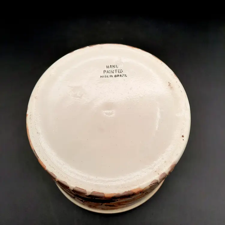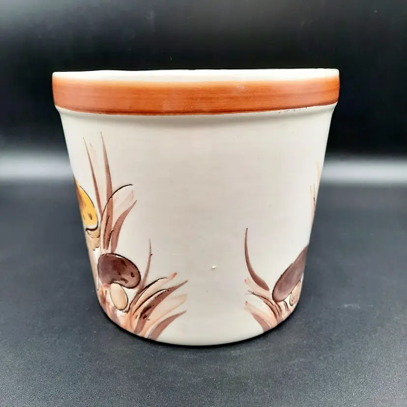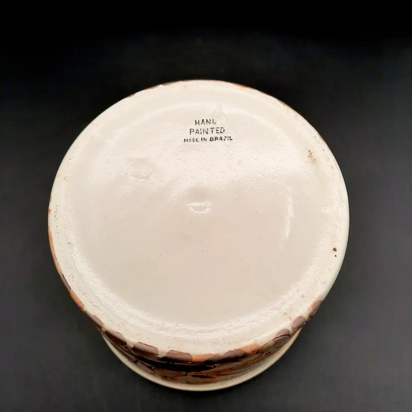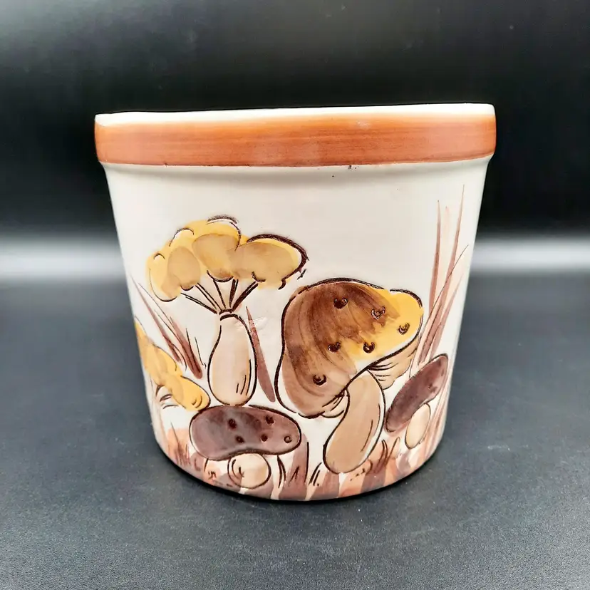 5 1/4"H x 5 1/2"W, has a small round crack by one of the mushrooms and some design flaws in paint/glaze, lines on interior look like cracks but can't feel with my fingernail.